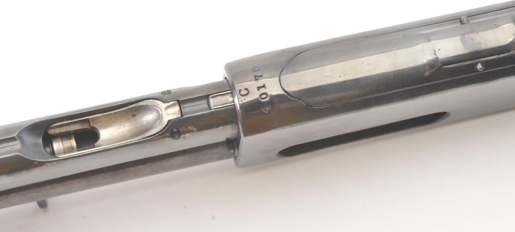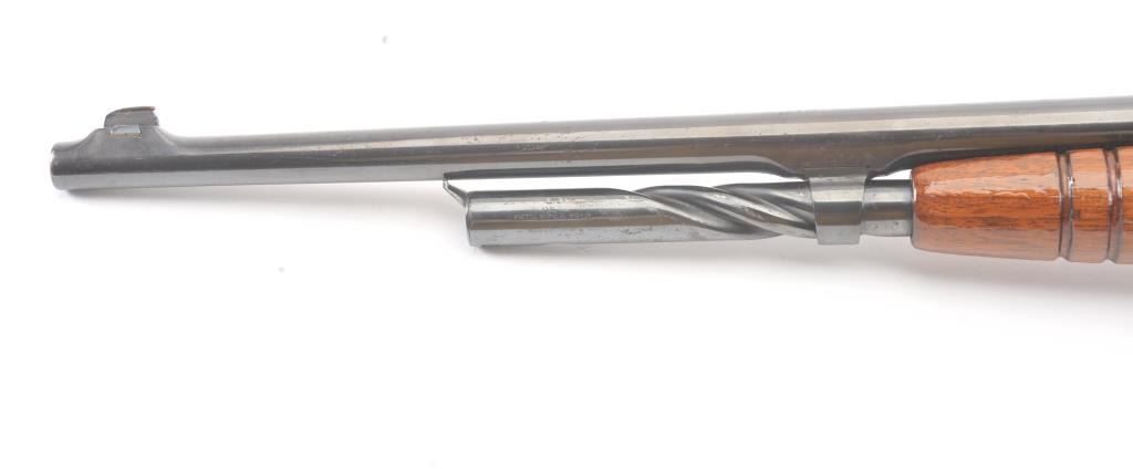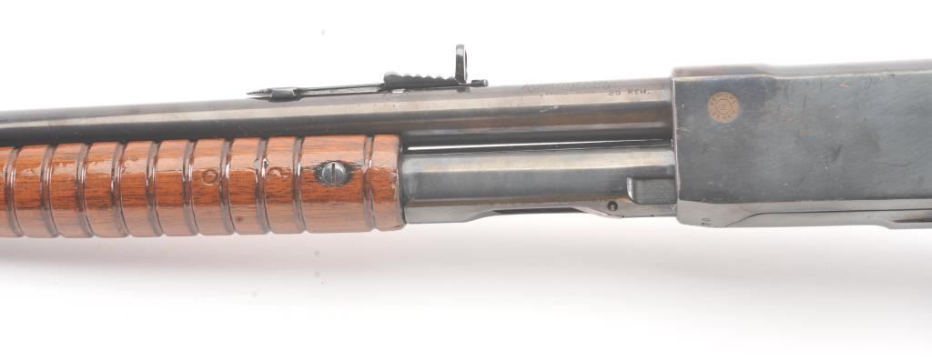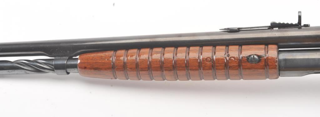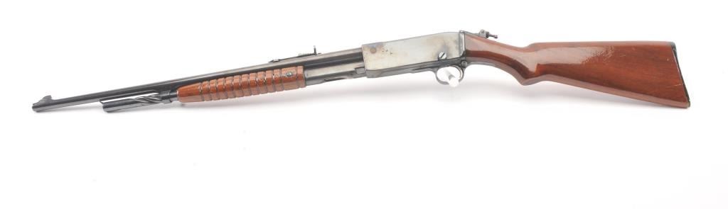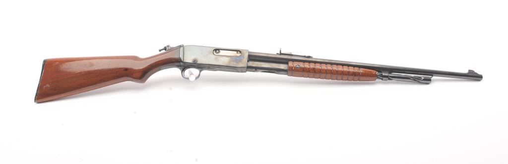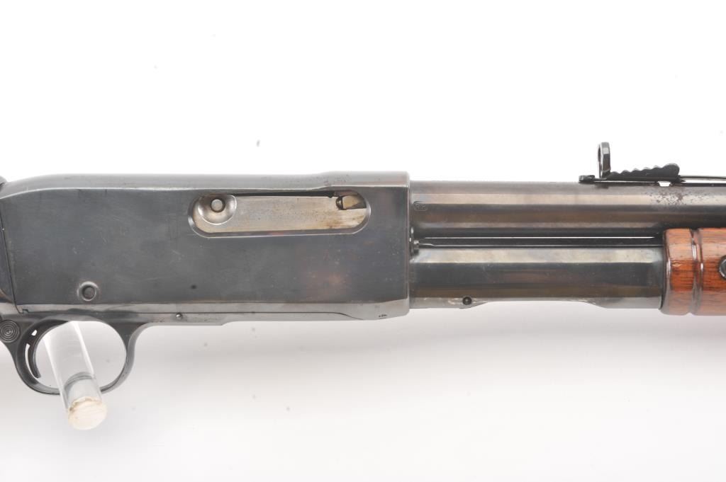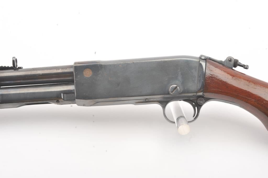 Remington Model 14 pump rifle, .25 Remington caliber, Serial #40140. The rifle is in very good overall condition with a 22” barrel with a ramped blade front and King rear sights. The metal surfaces retain themajority of the blue finish with light scratches and light surface rust at the muzzle. A period Lyman tang sight has been added. The smooth wood stocks are in very good condition with an extra coat of varnishadded. The bore is good, the action is crisp and the markings are sharp. Est.: $250-$500. (C+R).