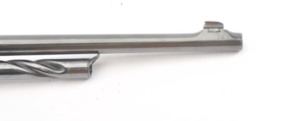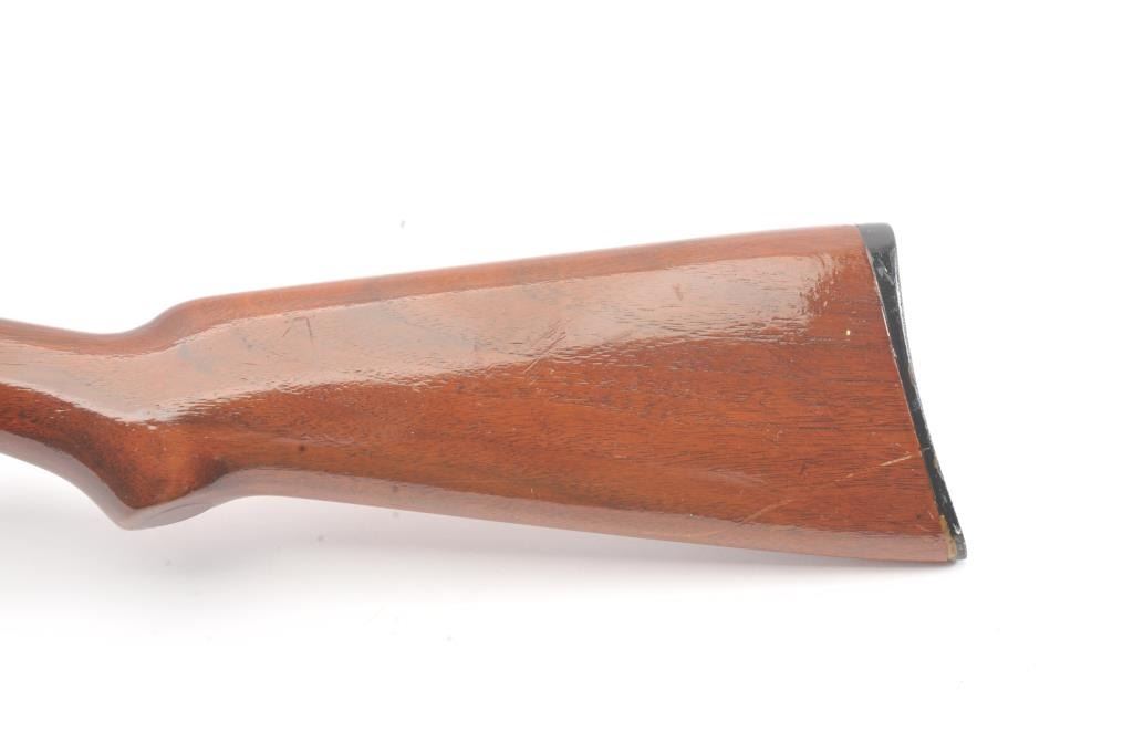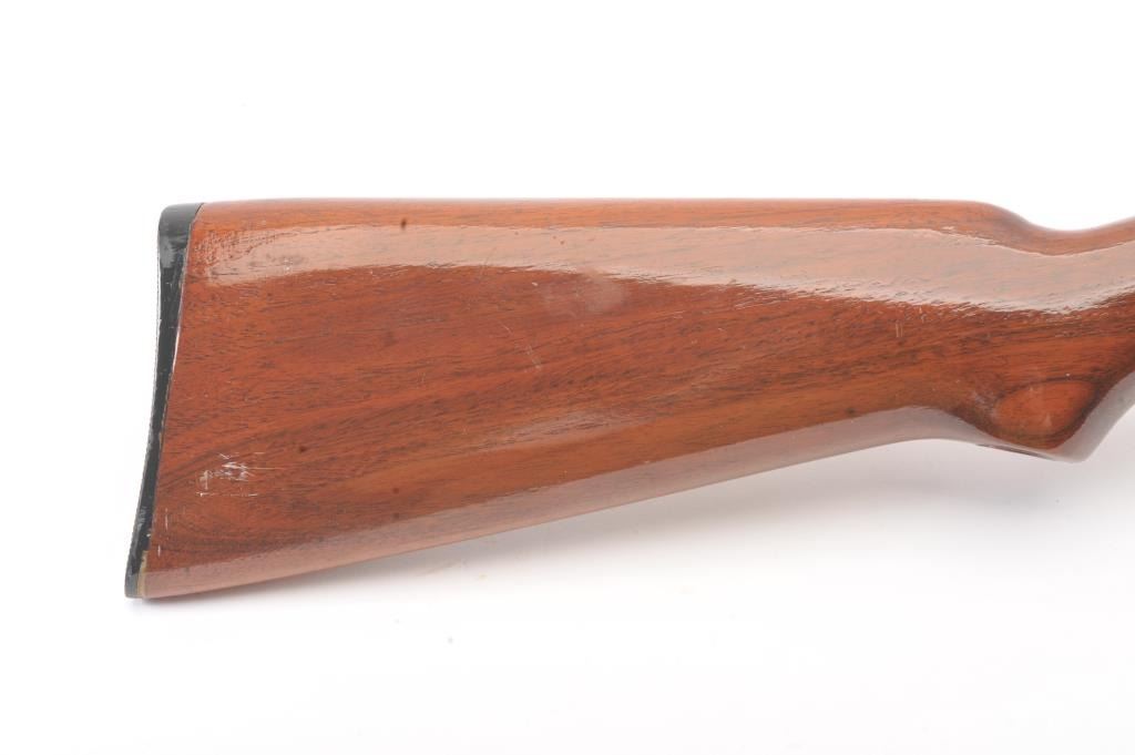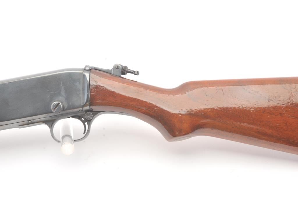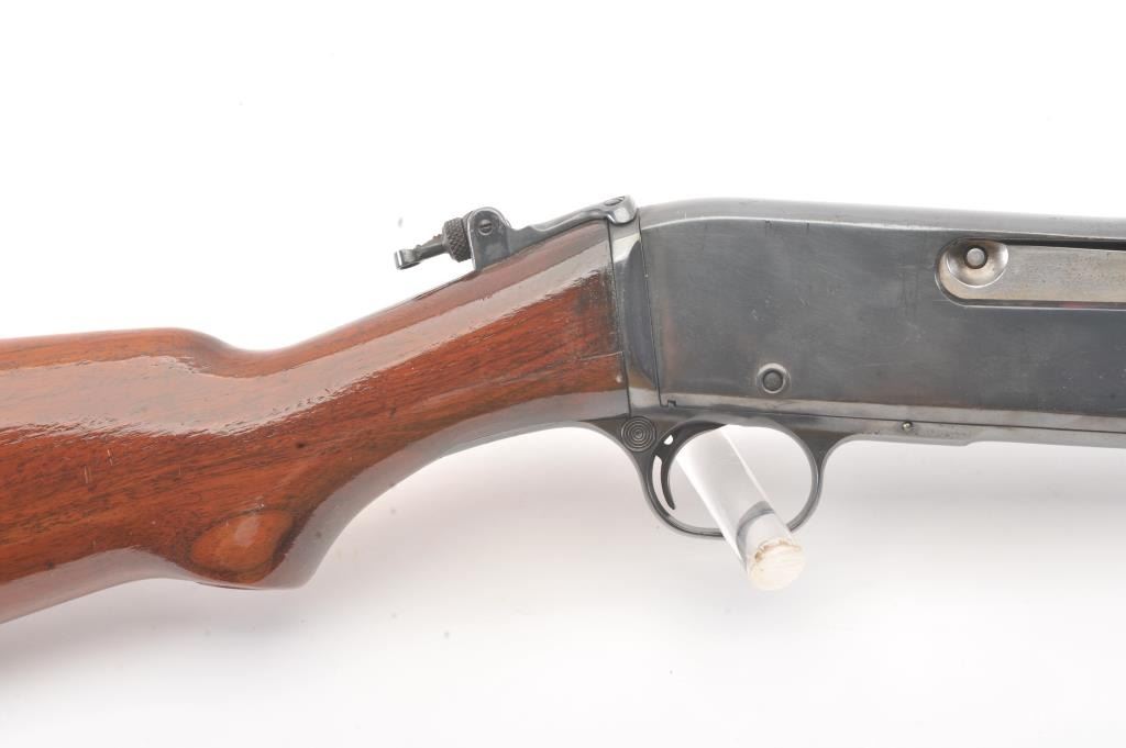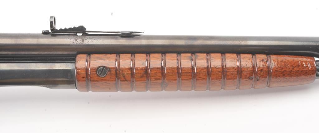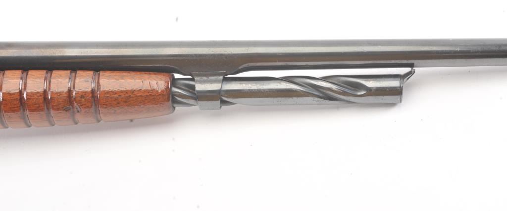 Remington Model 14 pump rifle, .25 Remington caliber, Serial #40140. The rifle is in very good overall condition with a 22” barrel with a ramped blade front and King rear sights. The metal surfaces retain themajority of the blue finish with light scratches and light surface rust at the muzzle. A period Lyman tang sight has been added. The smooth wood stocks are in very good condition with an extra coat of varnishadded. The bore is good, the action is crisp and the markings are sharp. Est.: $250-$500. (C+R).