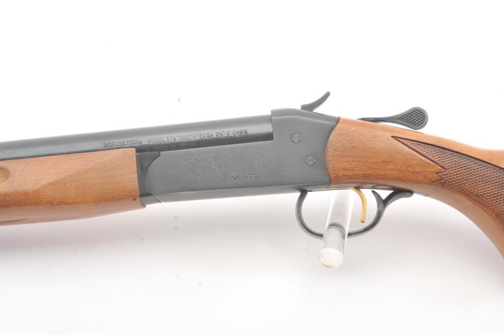 Winchester Model 37A Youth single shot shotgun, 20 gauge, Serial #C1044270. The shotgun is in nearly excellent overall condition with a 26” barrel. The shotgun retains nearly all of the blue finish. Thecheckered wood stock is in excellent condition with a ventilated rubber recoil pad providing a 12 ½” LOP. The bore is good, the action is crisp and the markings are sharp. Est.: $140-$280. (Modern).