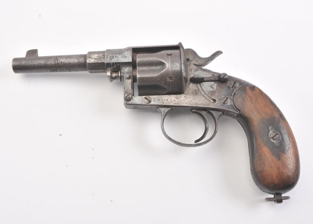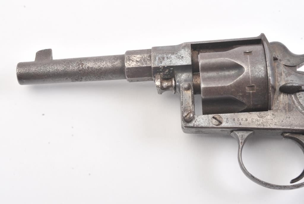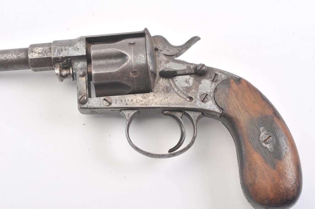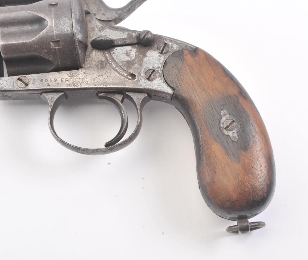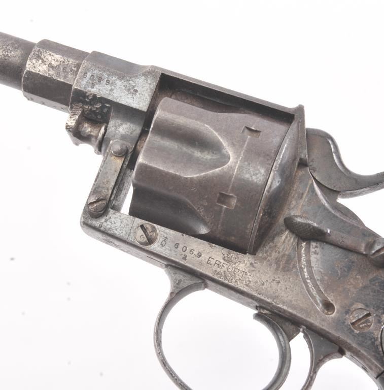 Erfurt marked Reich pistol double action revolver dated 1893, 11 mm caliber, Serial #6069. The pistol is in fair overall condition with a 4 ½” barrel. The pistol retains areas of muted original blue in theprotected areas. The barrel is a grey/brown patina with moderate pitting and knackering around the cylinder pin. The frame is marked, “ERFURT” and dated 1893. The smooth wood grips are in fair condition with mars,staining and the lanyard ring is retained. The markings are sharp and the action functions. Est.: $300-$600. (Antique).