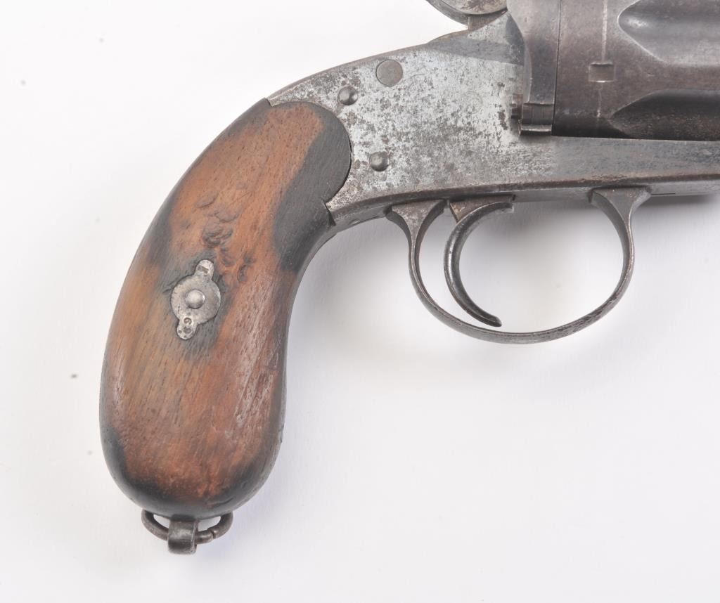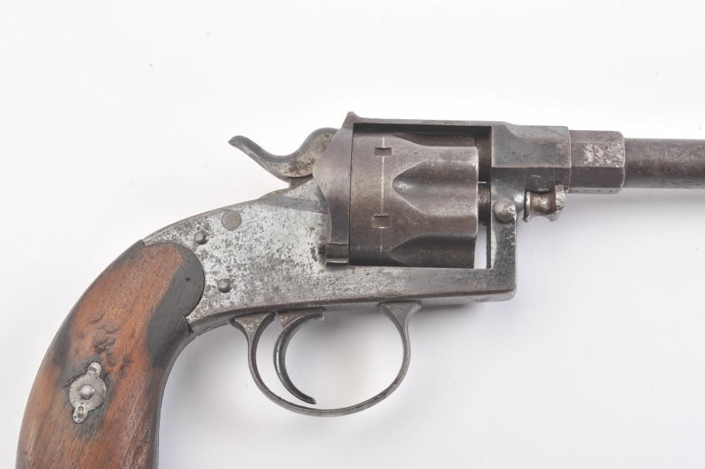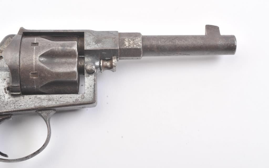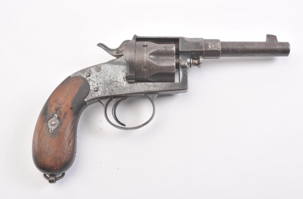 Erfurt marked Reich pistol double action revolver dated 1893, 11 mm caliber, Serial #6069. The pistol is in fair overall condition with a 4 ½” barrel. The pistol retains areas of muted original blue in theprotected areas. The barrel is a grey/brown patina with moderate pitting and knackering around the cylinder pin. The frame is marked, “ERFURT” and dated 1893. The smooth wood grips are in fair condition with mars,staining and the lanyard ring is retained. The markings are sharp and the action functions. Est.: $300-$600. (Antique).