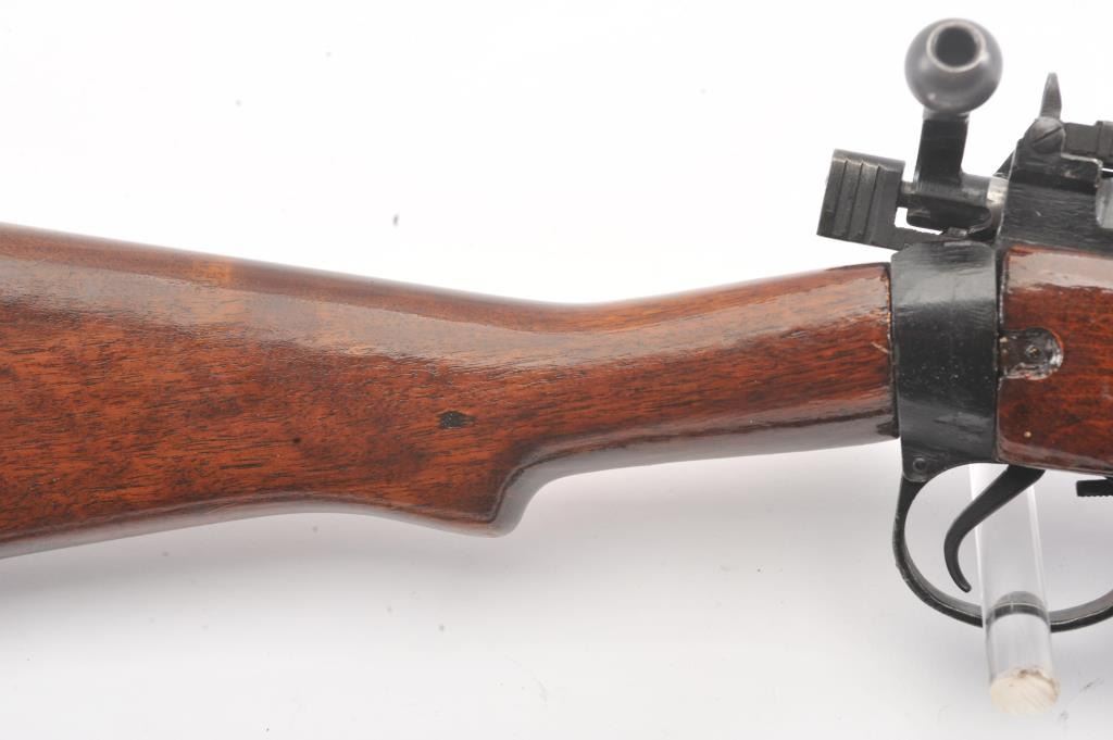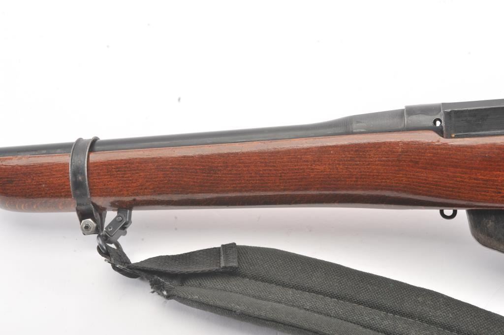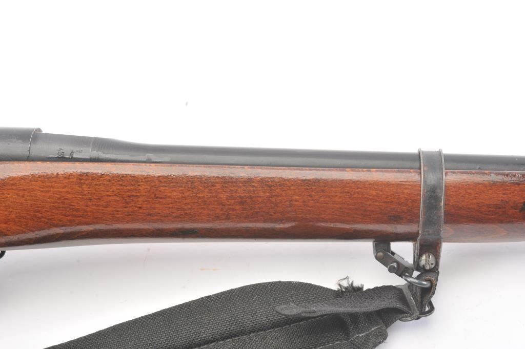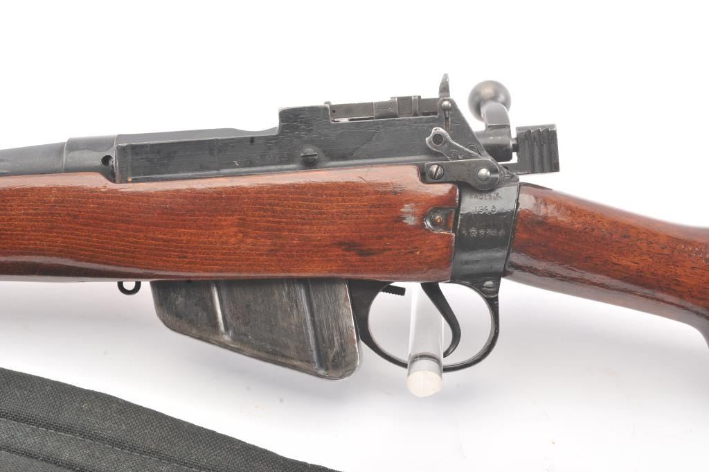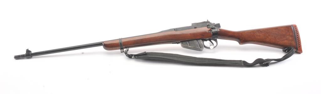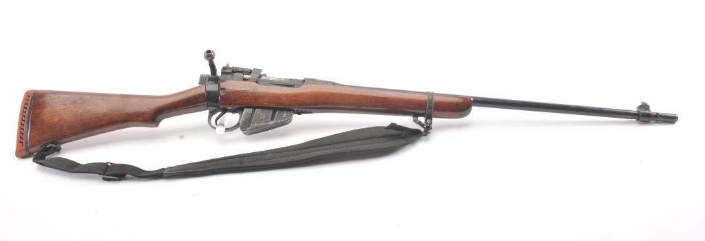 Lee-Enfield No.1 MK. IV bolt action sporter, .303 British caliber, Serial #AR3244. The rifle is in very good overall condition as sporterized with a 25”military barrel with a ramped blade front and a peep sight at therear. The metal surfaces retain a significant amount of black finish with the wrist marked, “ENGLAND” and dated 1943. The smooth wood military style stock has been refinished into a sportier style with anextra coat of varnish and a ventilated rubber pad at the end. The bore is fair, the action is crisp and the markings are legible. Est.: $150-$300. (C+R).