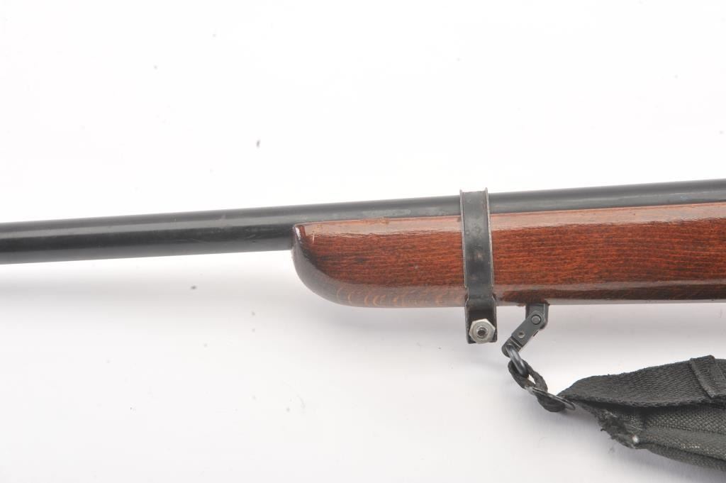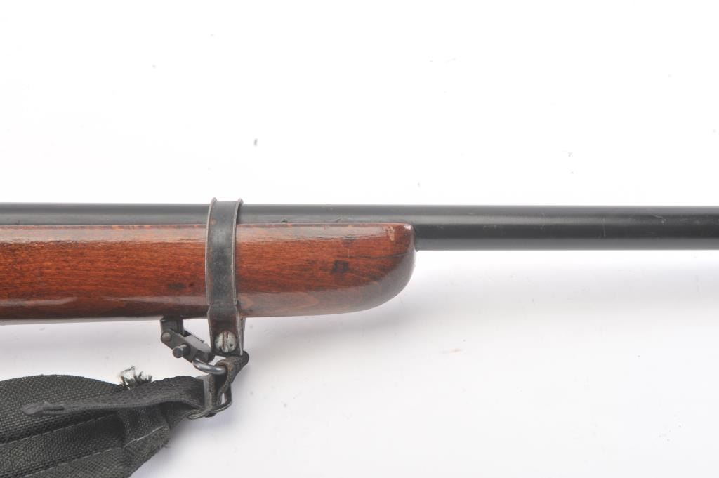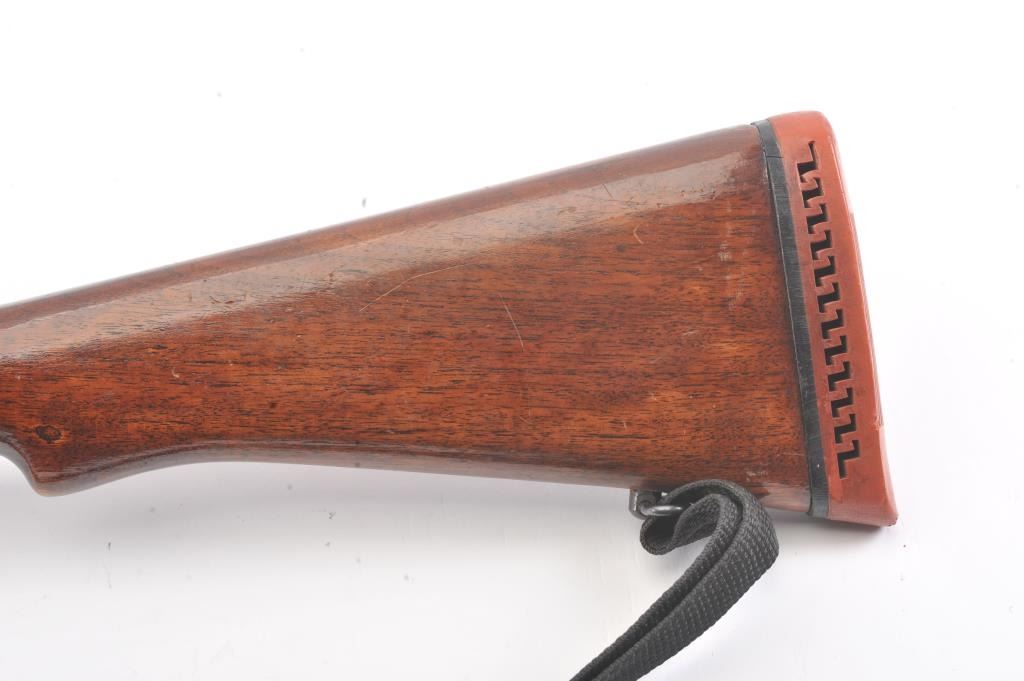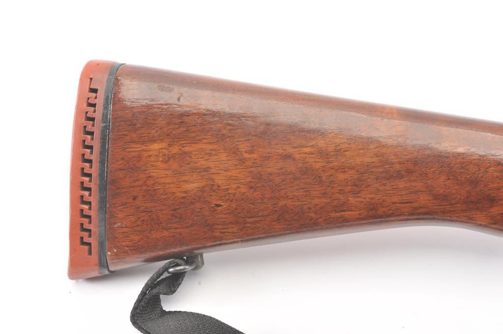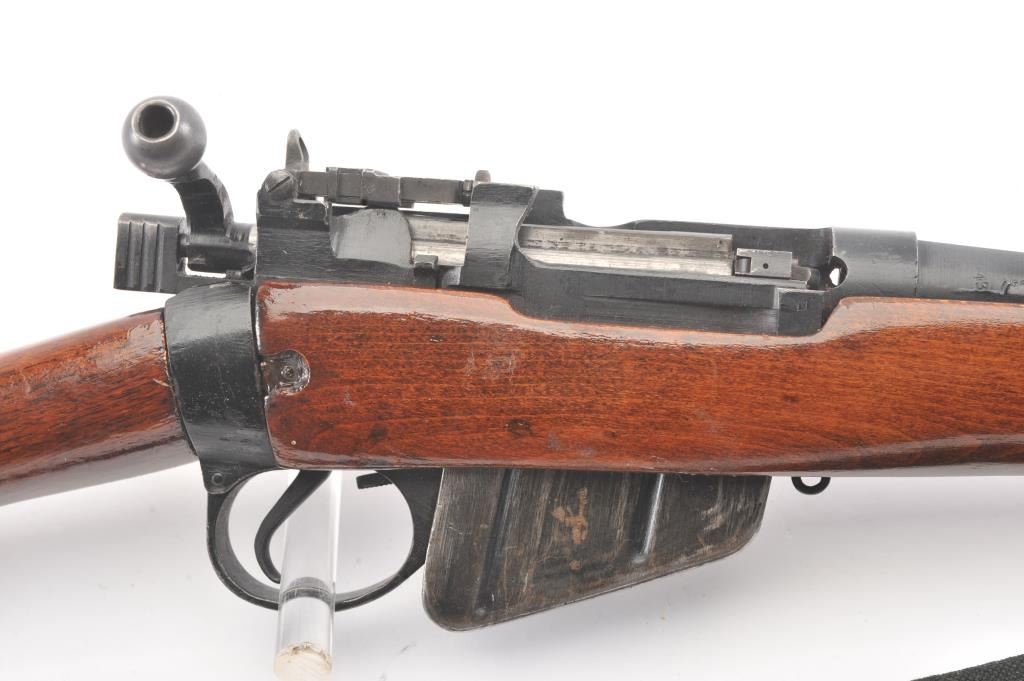 Lee-Enfield No.1 MK. IV bolt action sporter, .303 British caliber, Serial #AR3244. The rifle is in very good overall condition as sporterized with a 25”military barrel with a ramped blade front and a peep sight at therear. The metal surfaces retain a significant amount of black finish with the wrist marked, “ENGLAND” and dated 1943. The smooth wood military style stock has been refinished into a sportier style with anextra coat of varnish and a ventilated rubber pad at the end. The bore is fair, the action is crisp and the markings are legible. Est.: $150-$300. (C+R).
