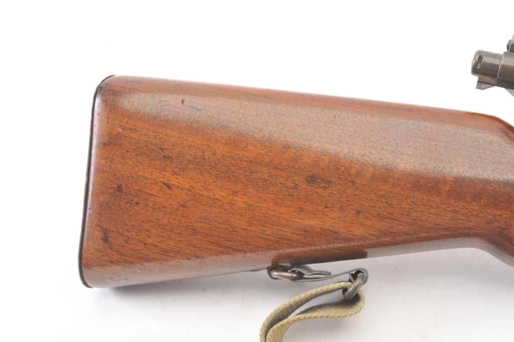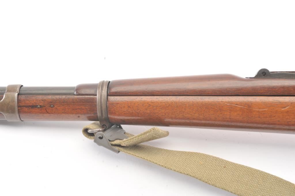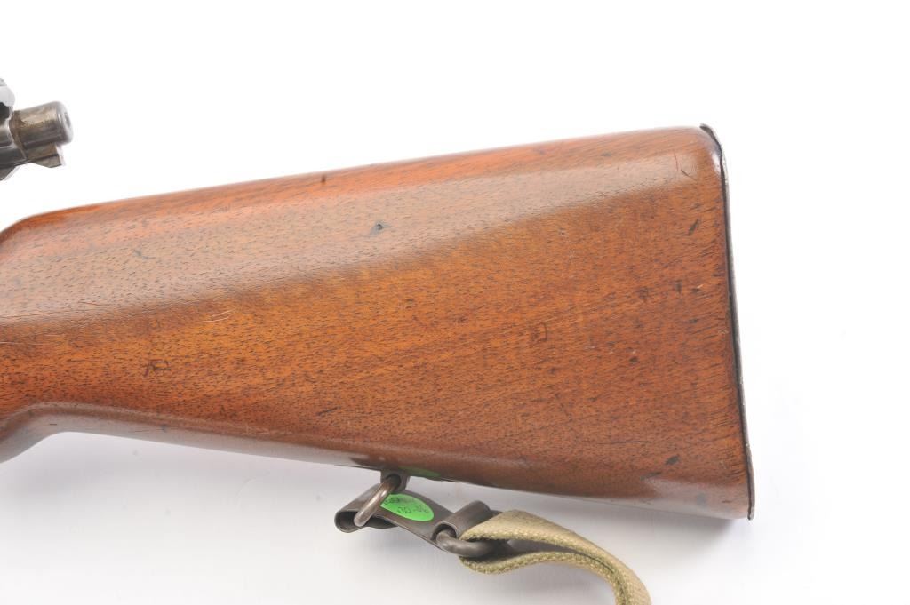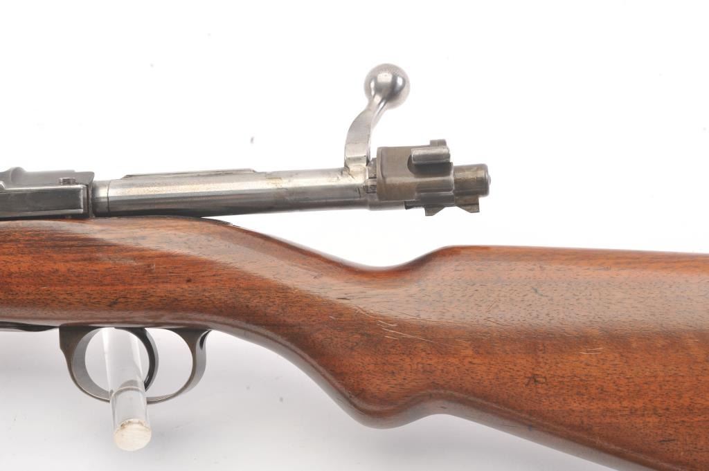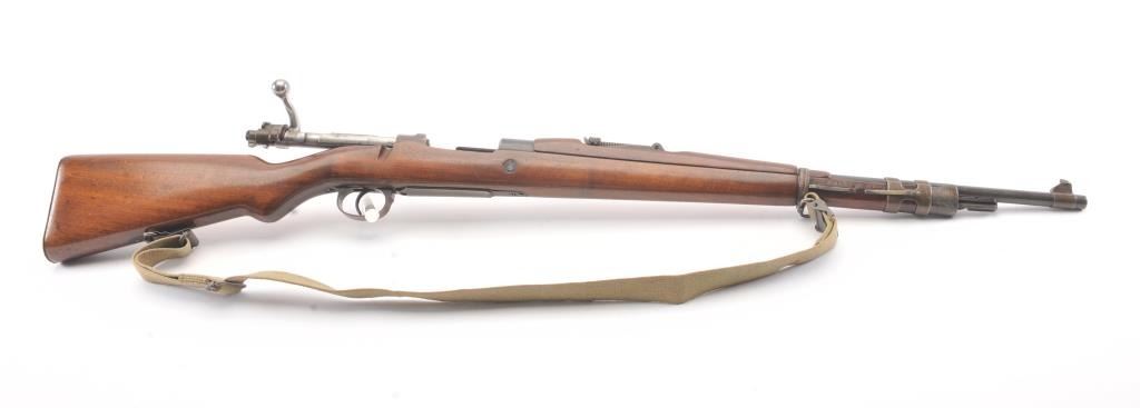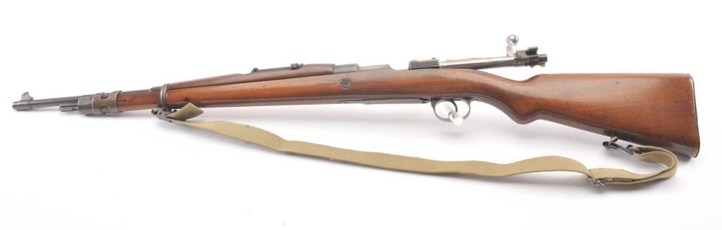 FN Columbian Model 1950 Mauser bolt action rifle, .30-06 caliber, Serial #05846. The rifle is in very good overall condition with a 24” barrel with a ramped blade front and military tangent style rear sights. Therifle retains a significant amount of original military finish with a crisp Columbian crest on the front ring and sharp FN markings on the wall. The top of the rear bridge is marked, “.30”. The smooth woodstock is in very good condition with small mars and scratches consistent with carry and use. The buttstock includes sling swivels, period canvas sling and textured steel butt plate. The bore is good, the action is crisp and the markings are sharp. Est.: $150-$300. (C+R).