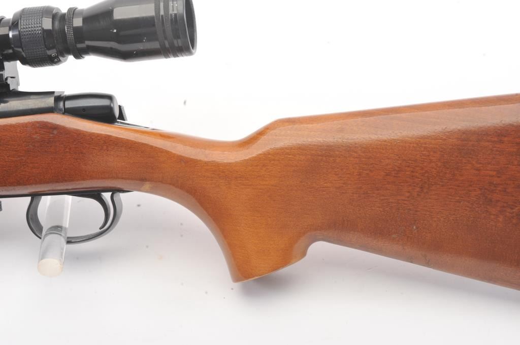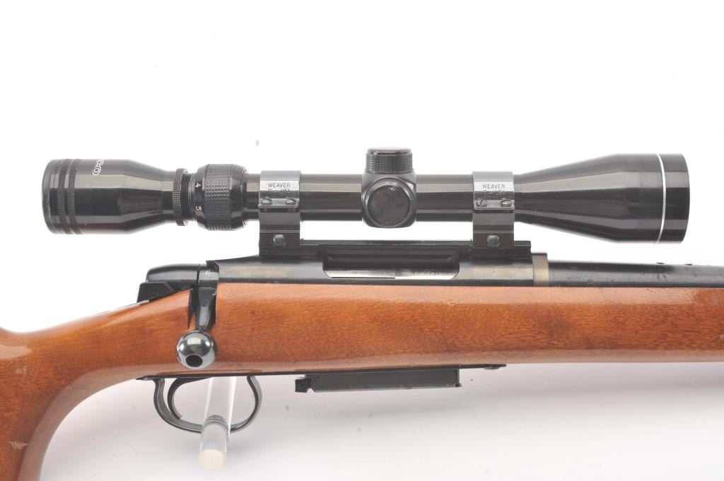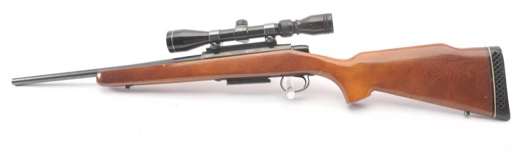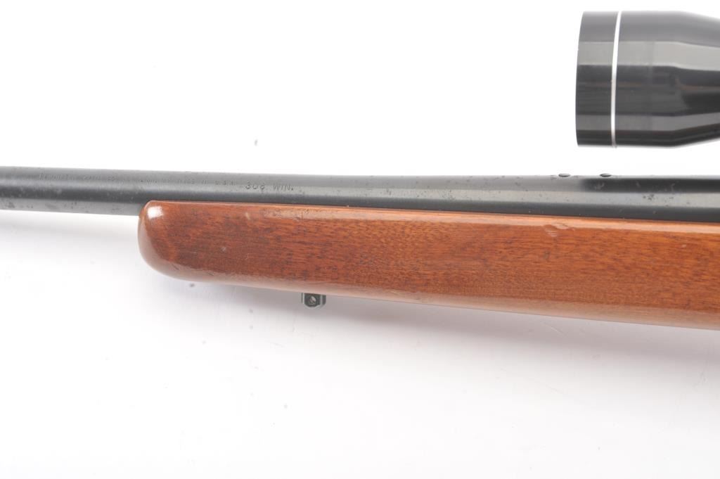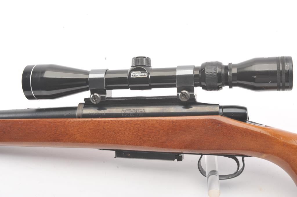 Remington Model 788 bolt action rifle, .308 Winchester caliber, Serial #B6035314. The rifle is in very good overall condition with an 18” barrel. The rifle retains approximately 90% of the blue finish withlight surface rust on the barrel due to poor storage. The smooth wood stock is in very good condition with small mars and compressions consistent with field use. The butt stock ends with a ventilated rubberrecoil pad. The rifle is topped with Weaver rings and a Tasco Pronghorn 3 x 9 variable power scope. The bore is good, the action is crisp and the markings are sharp. Est.: $250-$500. (Modern).