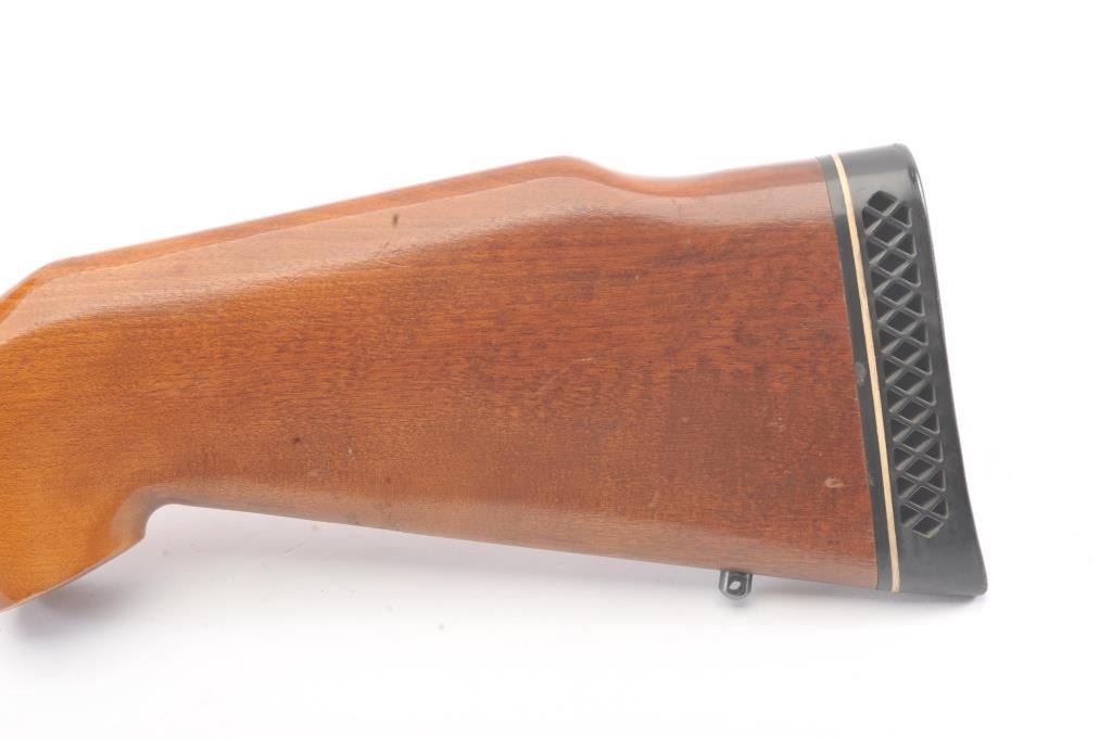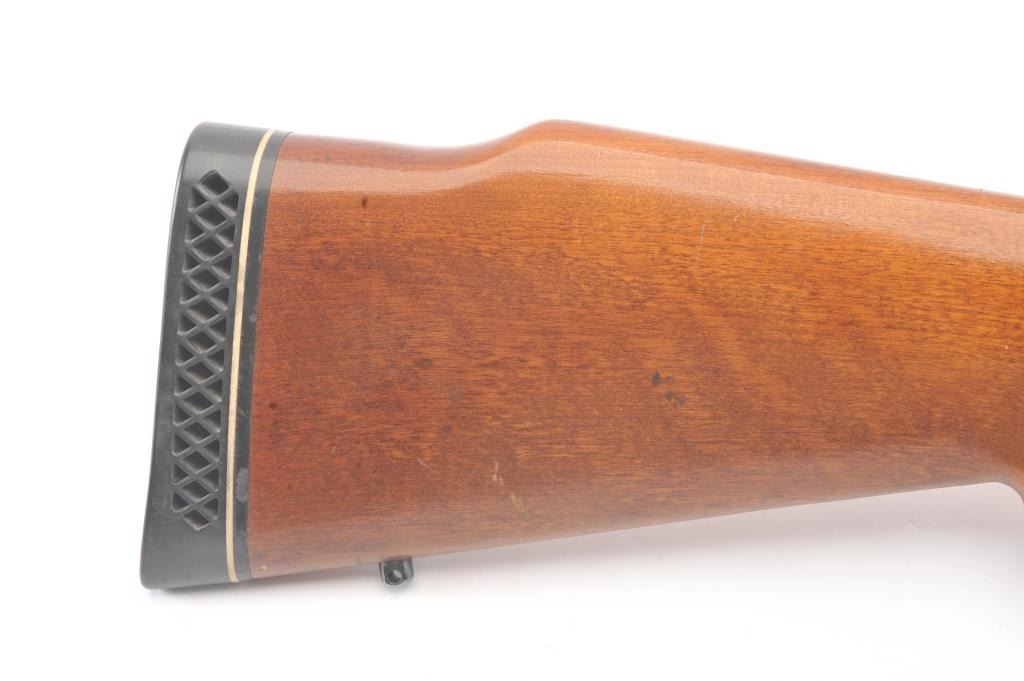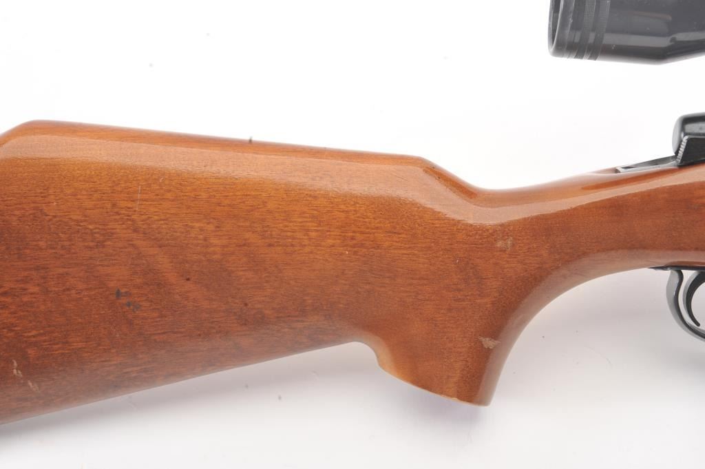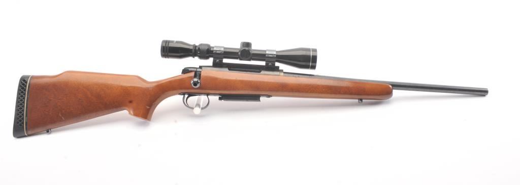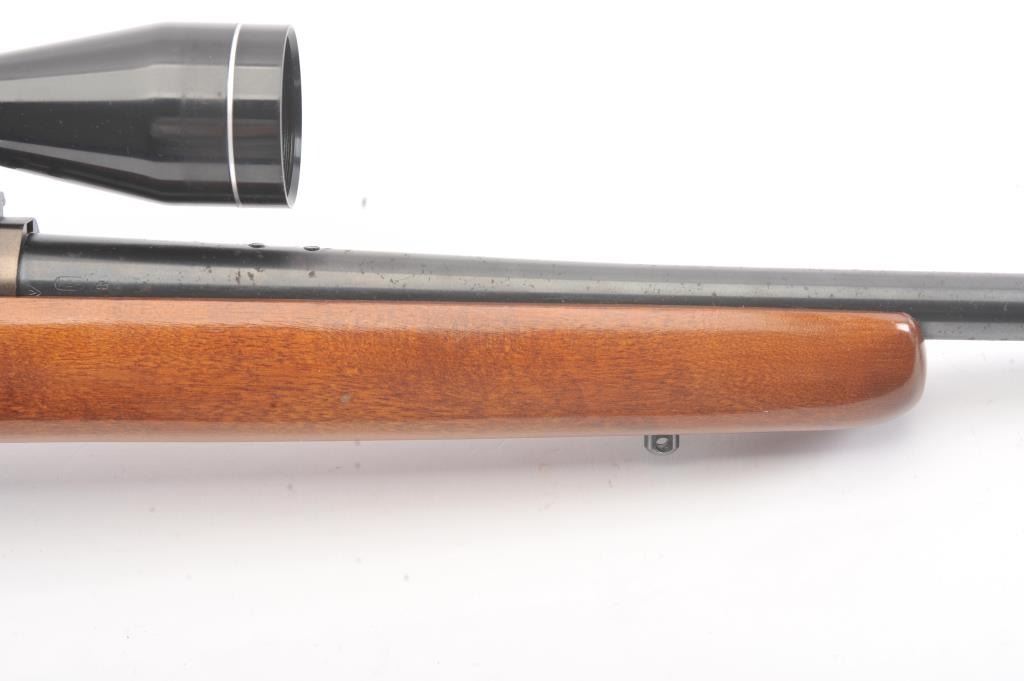 Remington Model 788 bolt action rifle, .308 Winchester caliber, Serial #B6035314. The rifle is in very good overall condition with an 18” barrel. The rifle retains approximately 90% of the blue finish withlight surface rust on the barrel due to poor storage. The smooth wood stock is in very good condition with small mars and compressions consistent with field use. The butt stock ends with a ventilated rubberrecoil pad. The rifle is topped with Weaver rings and a Tasco Pronghorn 3 x 9 variable power scope. The bore is good, the action is crisp and the markings are sharp. Est.: $250-$500. (Modern).