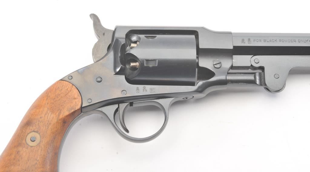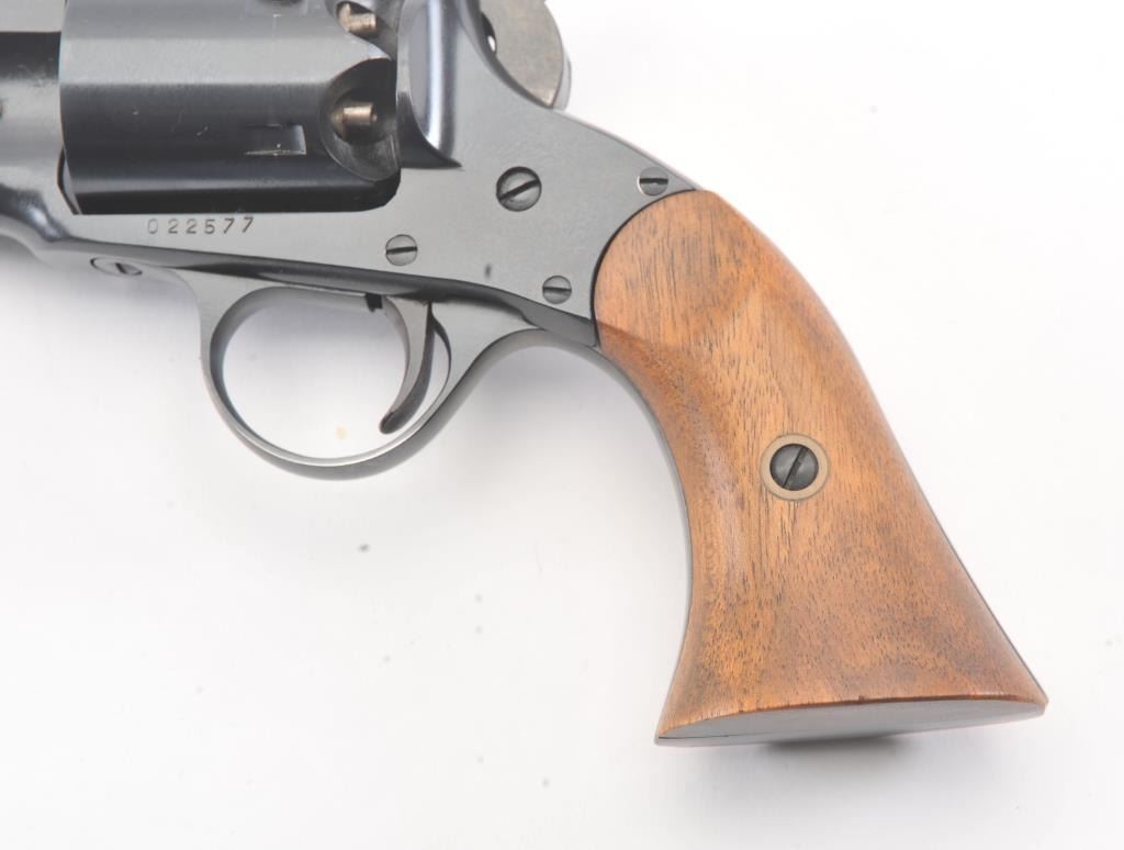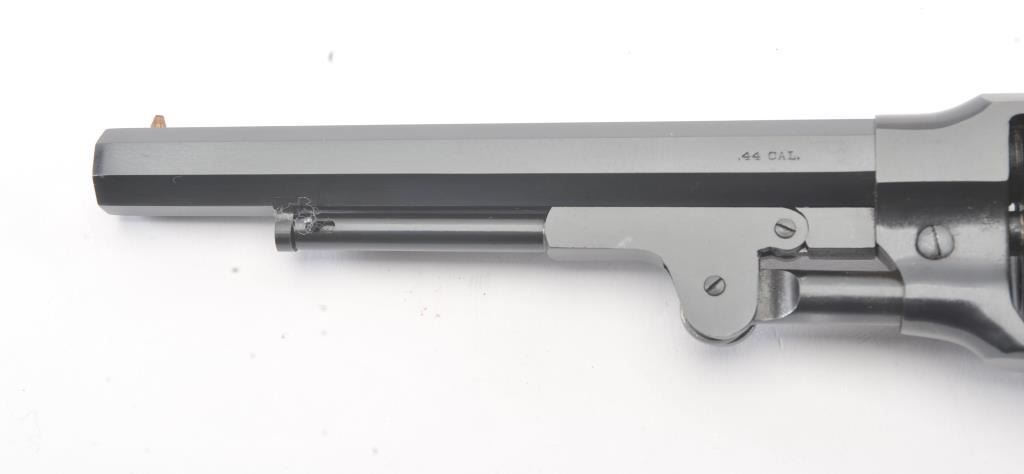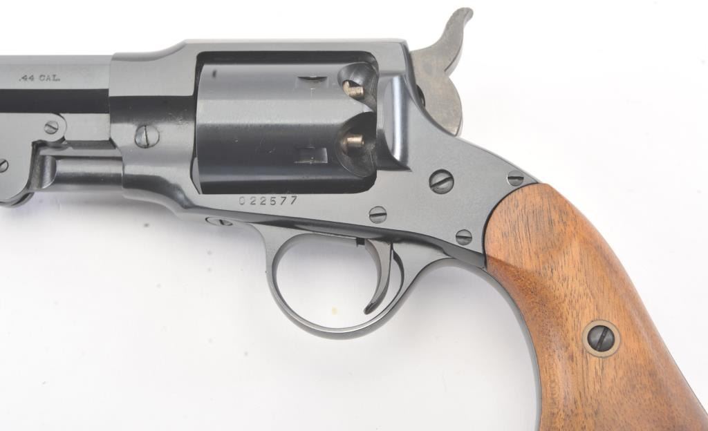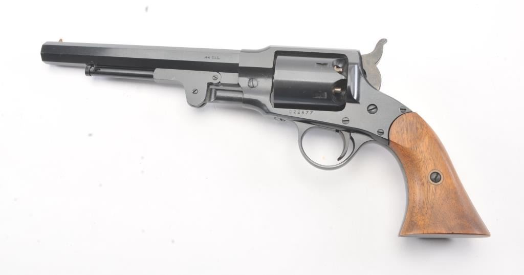 Euro Arms of America reproduction Rogers & Spencer percussion black powder revolver, .44 caliber, Serial #022577. The pistol is in excellent overall condition with a 7 ½” octagon barrel. The pistol retainsapproximately 98% of the blue finish with light handling marks. The smooth wood grips are in excellent condition. Est.: $250-$500.