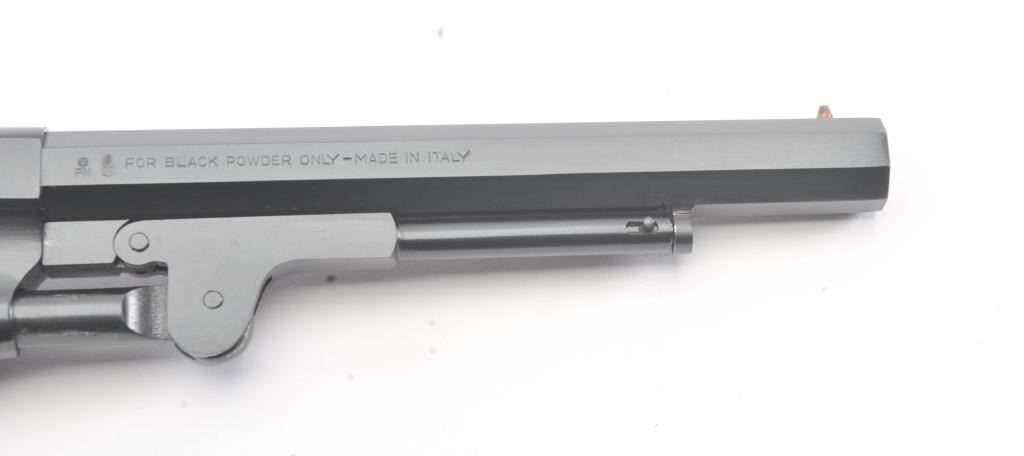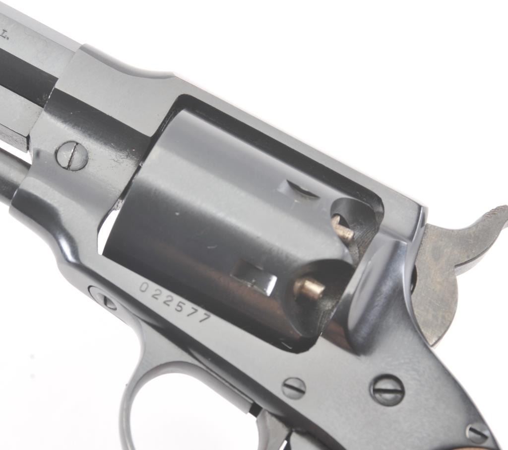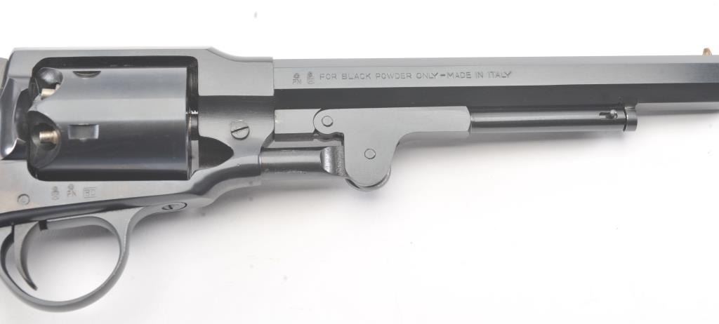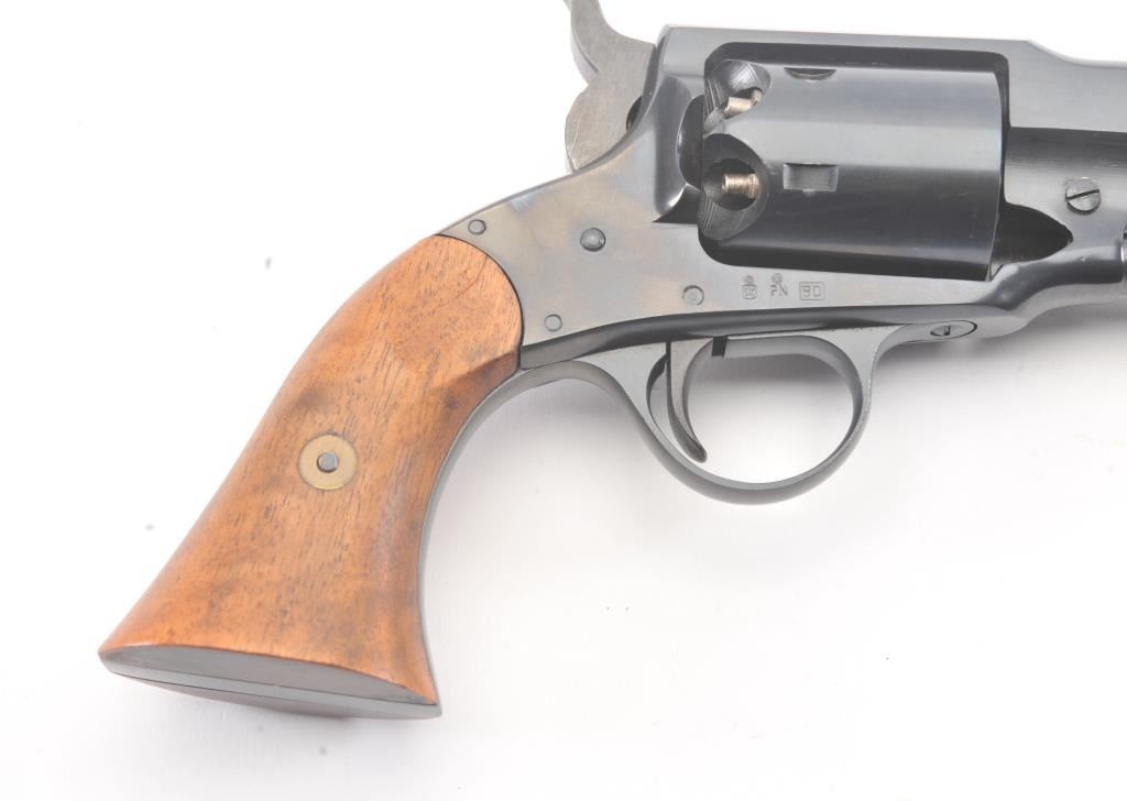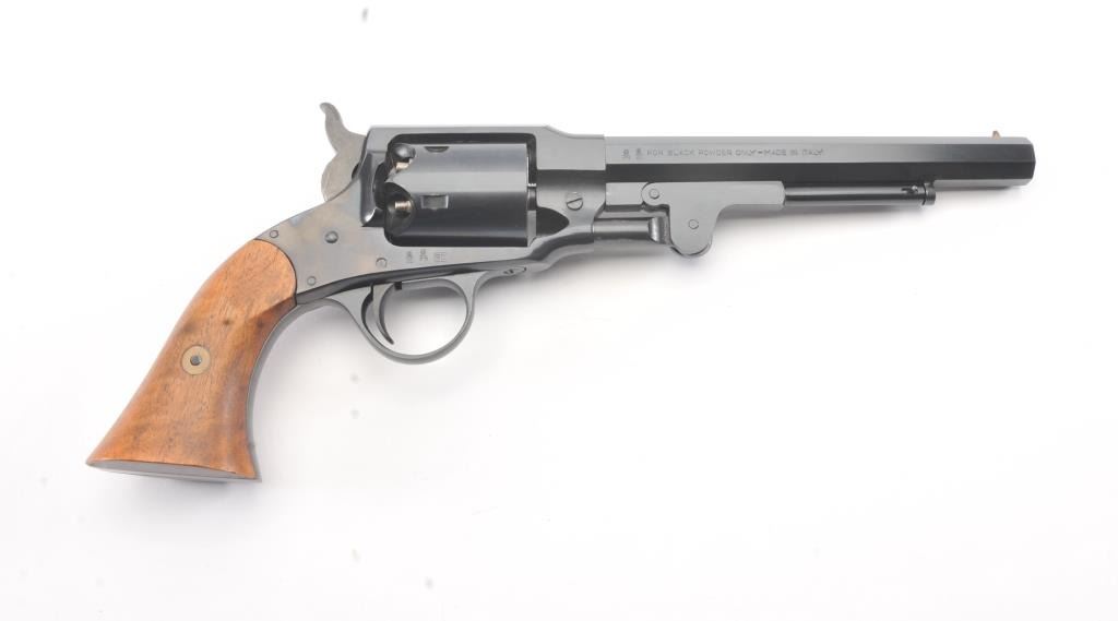 Euro Arms of America reproduction Rogers & Spencer percussion black powder revolver, .44 caliber, Serial #022577. The pistol is in excellent overall condition with a 7 ½” octagon barrel. The pistol retainsapproximately 98% of the blue finish with light handling marks. The smooth wood grips are in excellent condition. Est.: $250-$500.