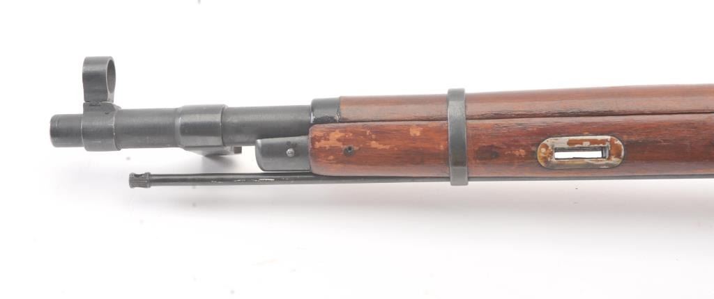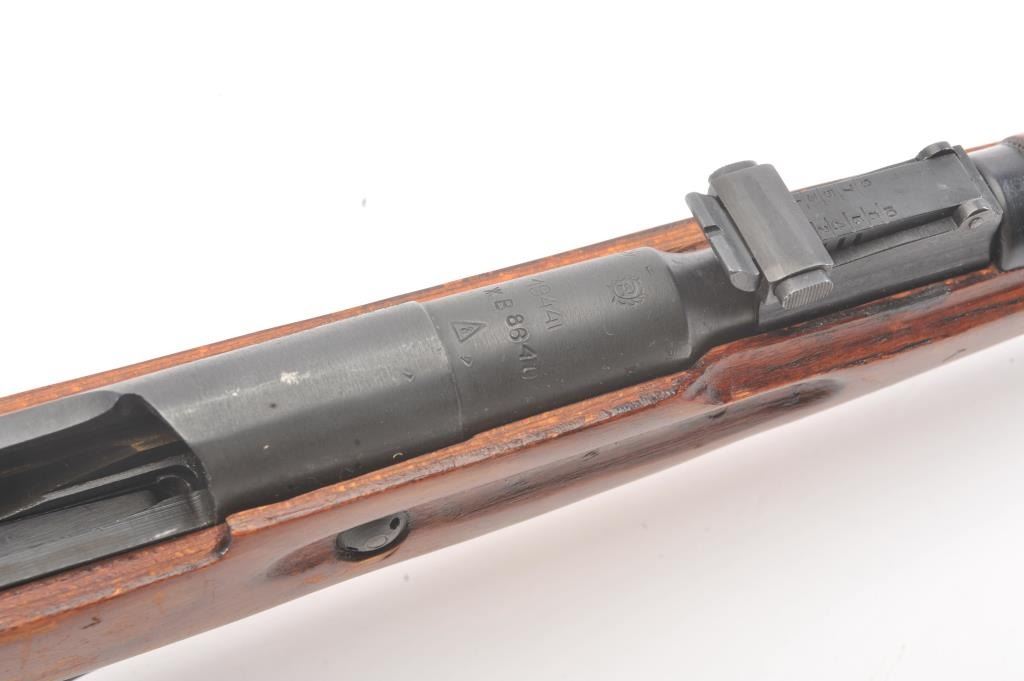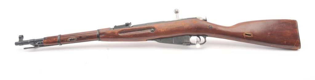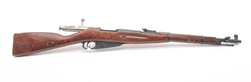 Russian Mosin-Nagant bolt action rifle, 7.65 x 54R caliber, Serial #M44068807. The rifle is in very good overall condition with a 21” barrel with an aircraft style hooded front sight and military tangent rear. The metalsurfaces retain the majority of the military finish with the front ring dated 1944. The smooth wood stock is in good overall condition with mars and dents consistent with service use. The bayonet has been removewith the ramrod retained. The bore is good, the action is crisp and the markings are sharp. Est.: $125-$250. (C+R).