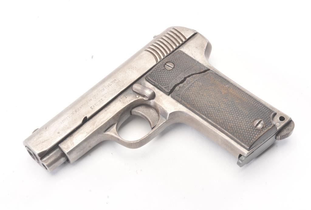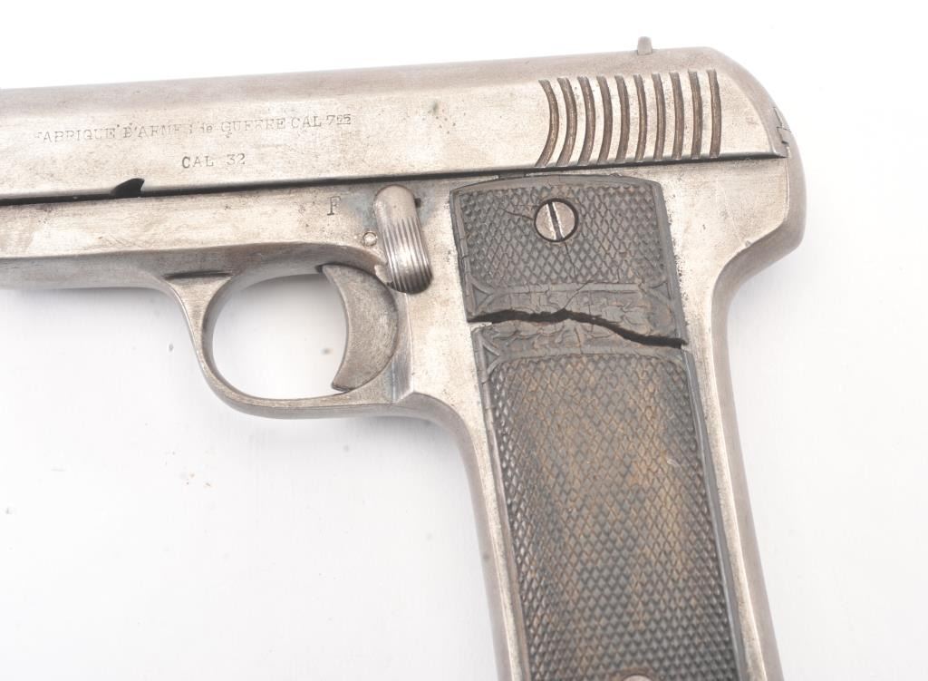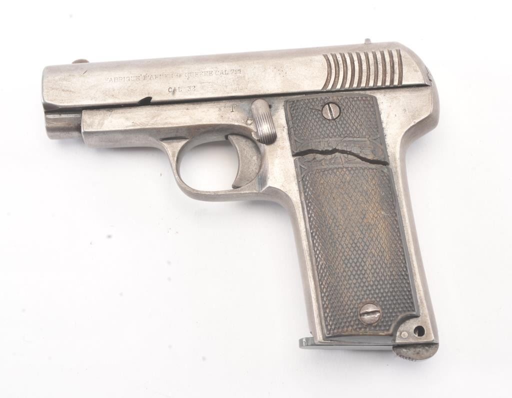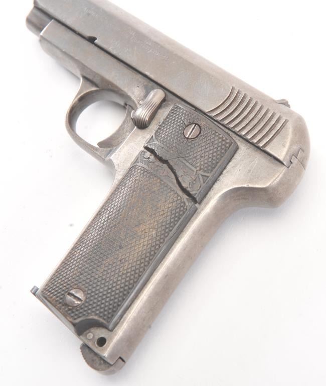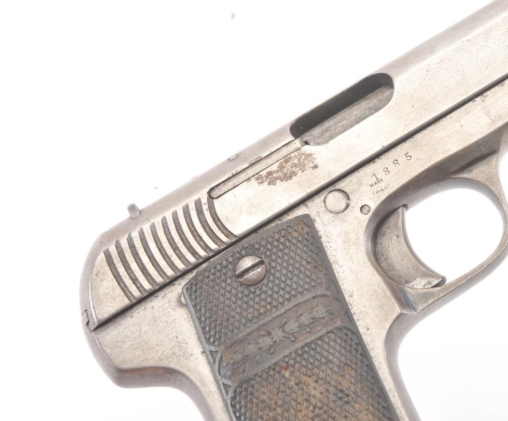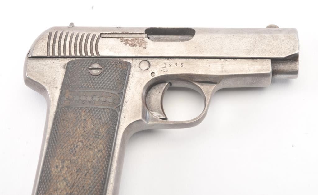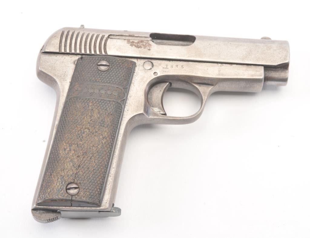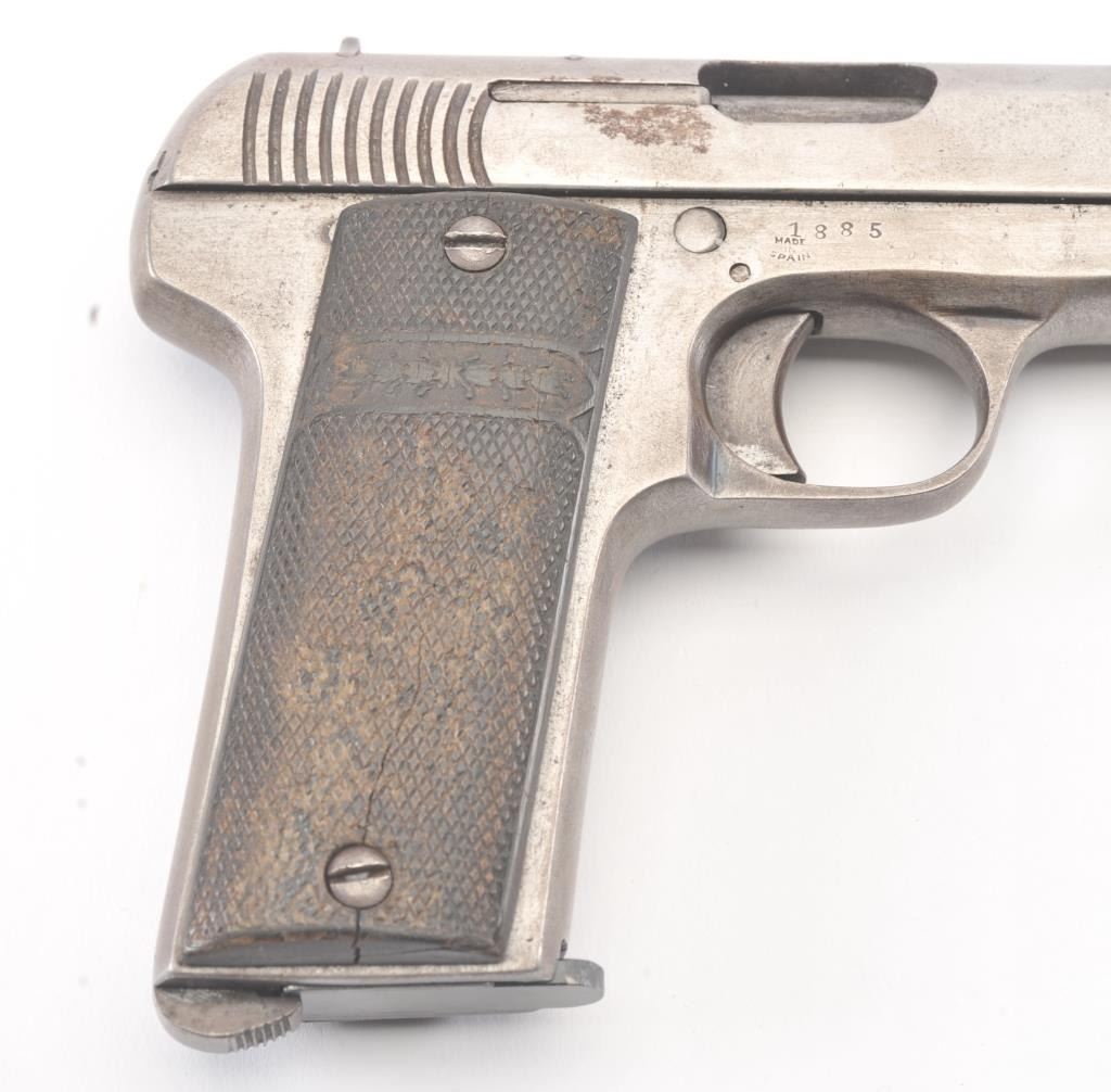Fabrique D’Armes de Guerre Ruby semi-automatic pistol, 7.65mm caliber, Serial #1885. The pistol is in good overall condition with a 3” barrel. The Spanish made pistol has gone to an overall grey patinawith checkered hard rubber grips, the right panel is cracked midway. The bore is fair, the action functions and the markings are legible. The lot includes one correct magazine. Est.: $100-$200. (C+R/PPT.