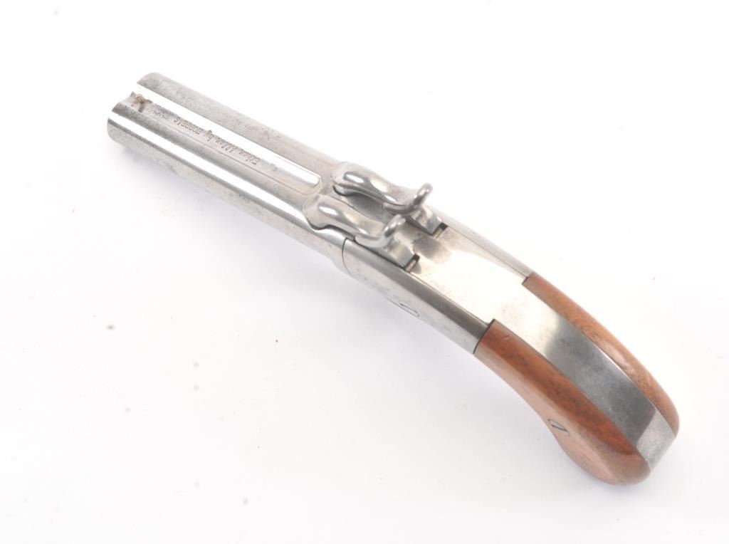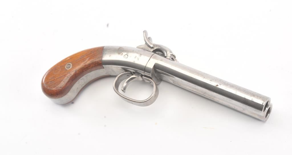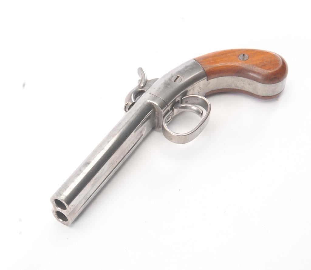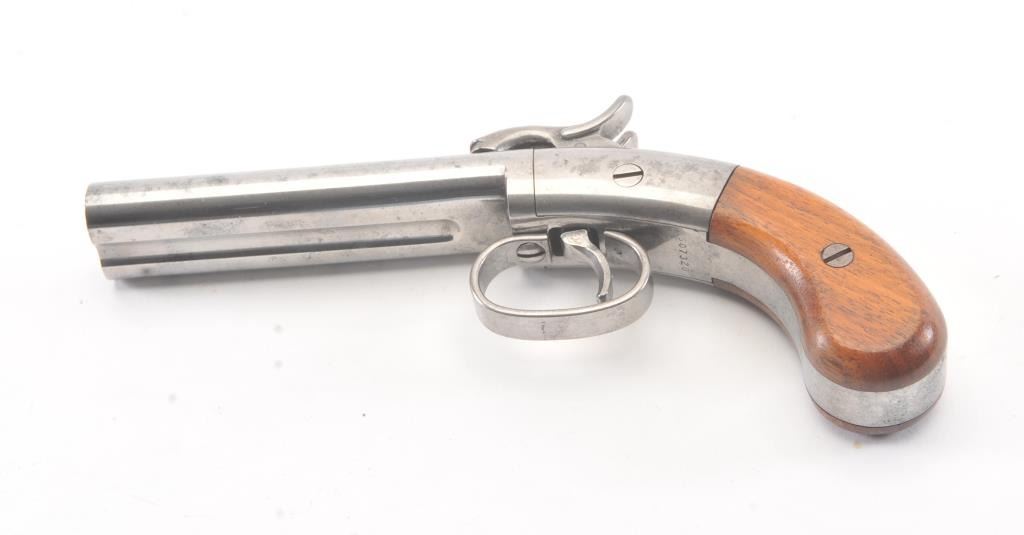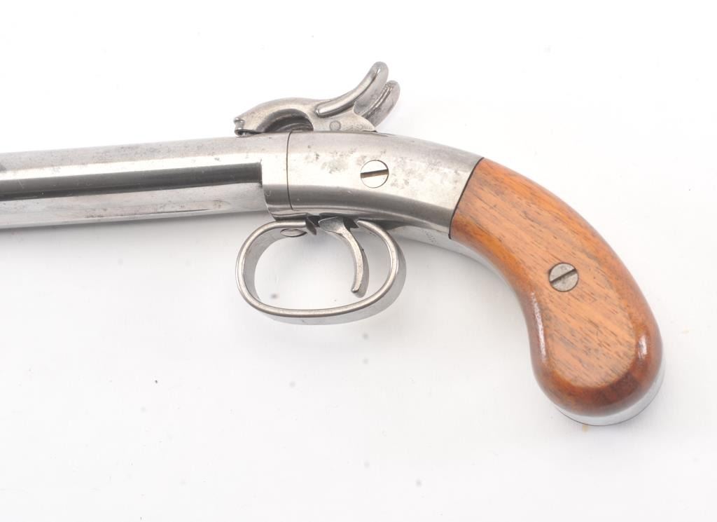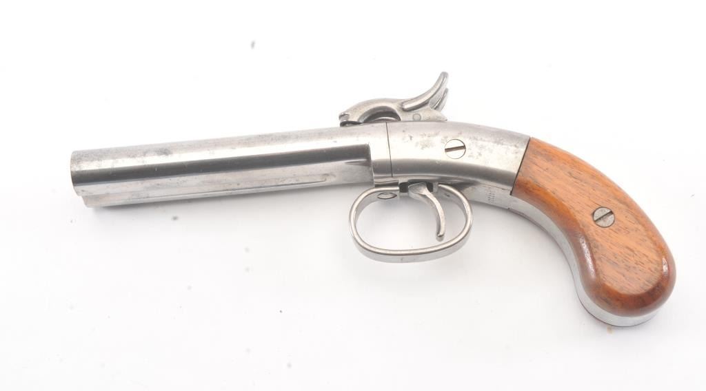 Ethan Allen style “Snake Eyes” S X S percussion pistol, .38 caliber, Serial #S07320. The pistol is in excellent overall condition retaining 90% of the nickel finish on the 4 ¾” barrels. The smooth wood gripsare in very good condition with light storage marks. A nicely done reproduction by Hoppes. Est.: $100-$200.