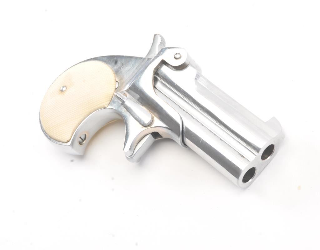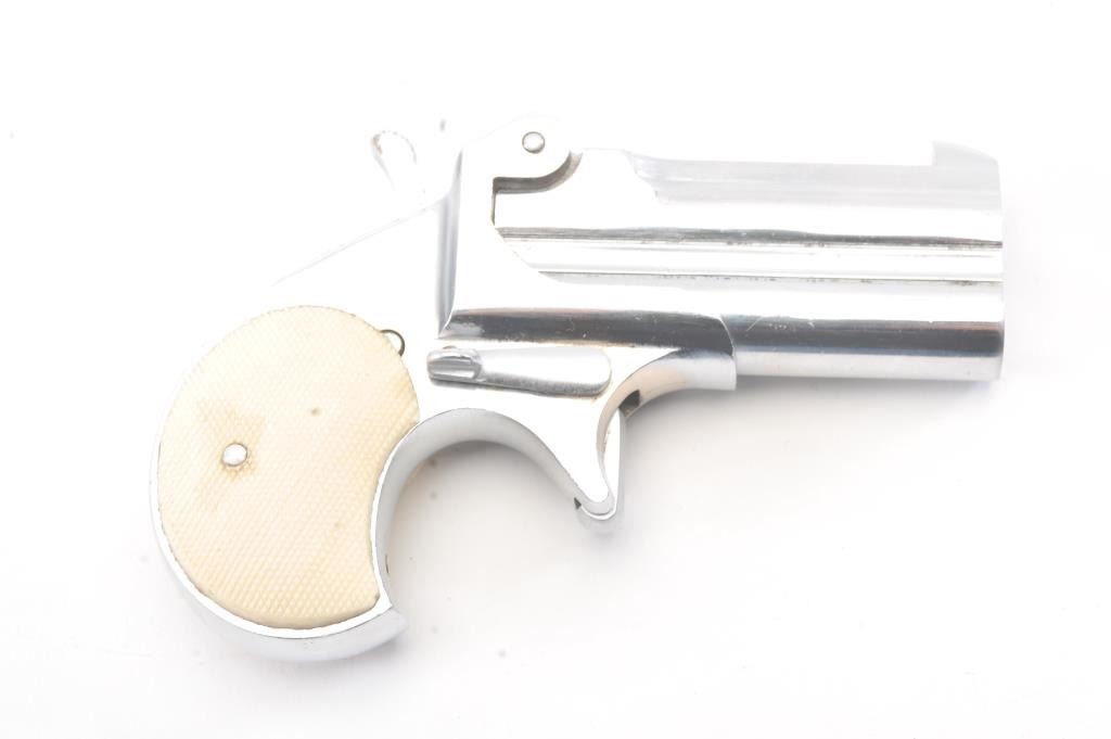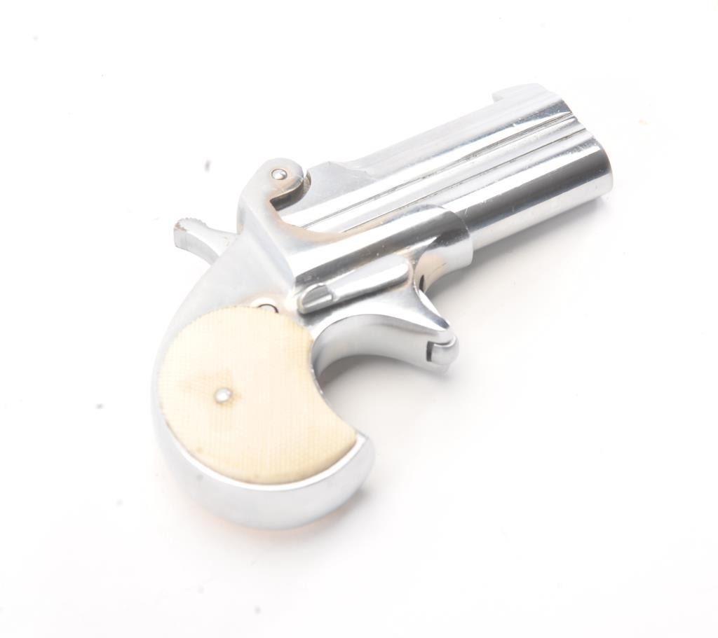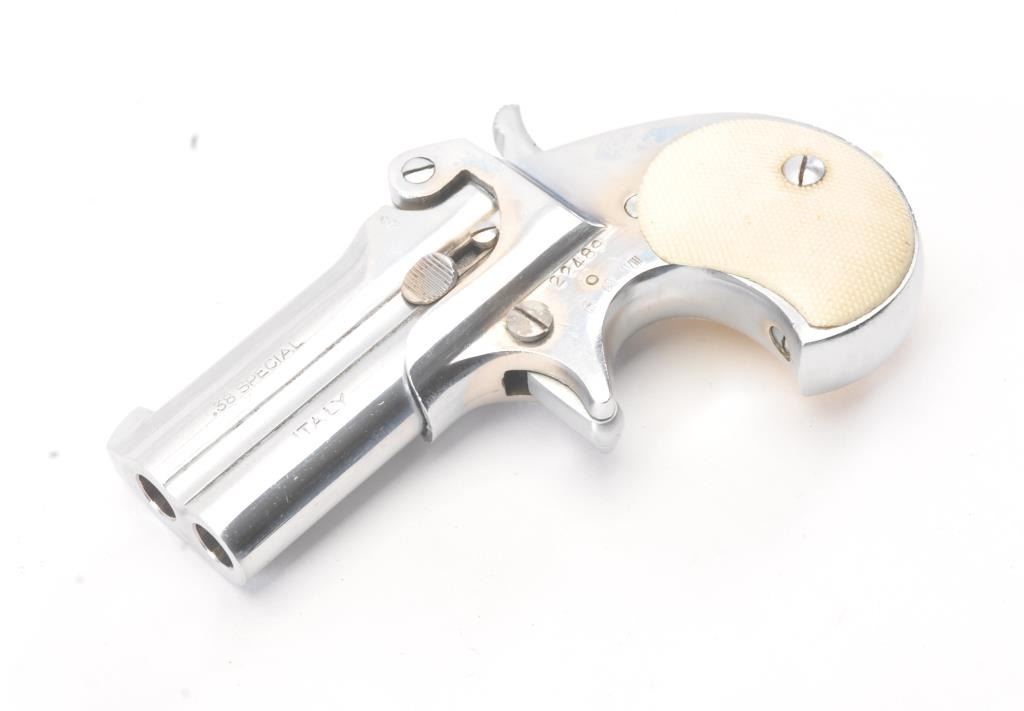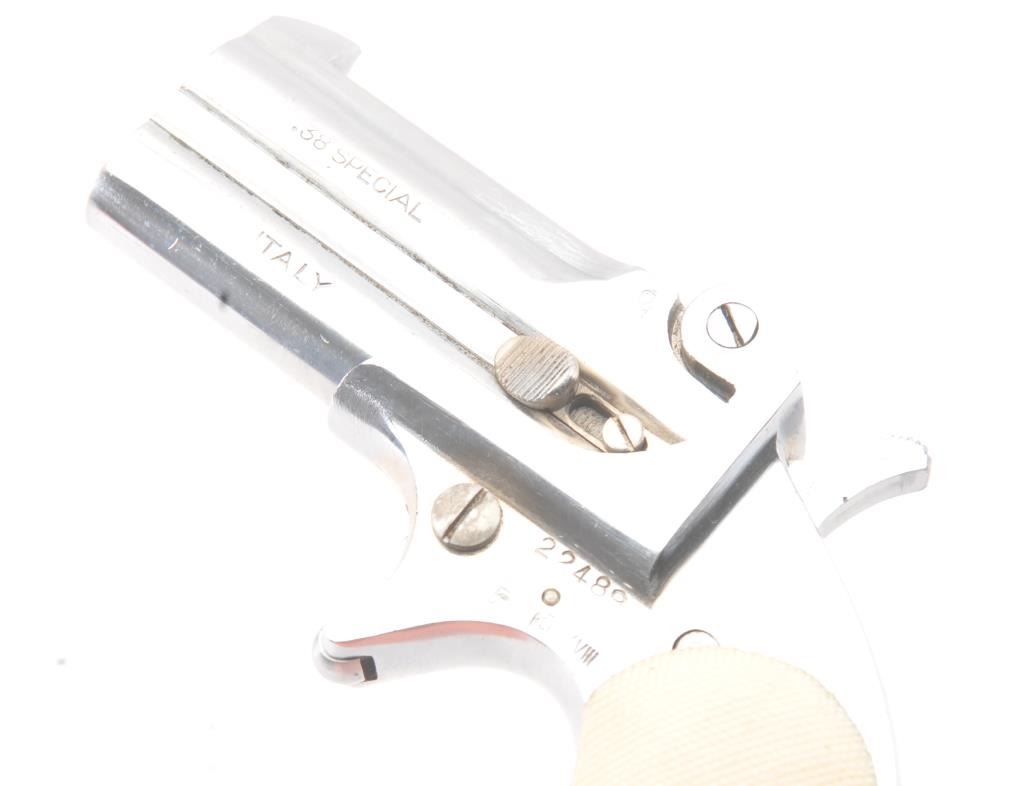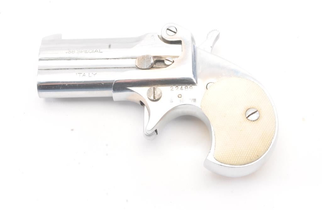 EIG Over/Under Derringer, .38 caliber, Serial #22489. The pistol is in excellent overall condition with 3” barrels retaining nearly all of the nickel finish marked, “ITALY”. The checkered faux ivory grips are in verygood condition. The bores are good, the action is crisp and the markings are sharp. Est.: $100-$200. (Modern/PPT).