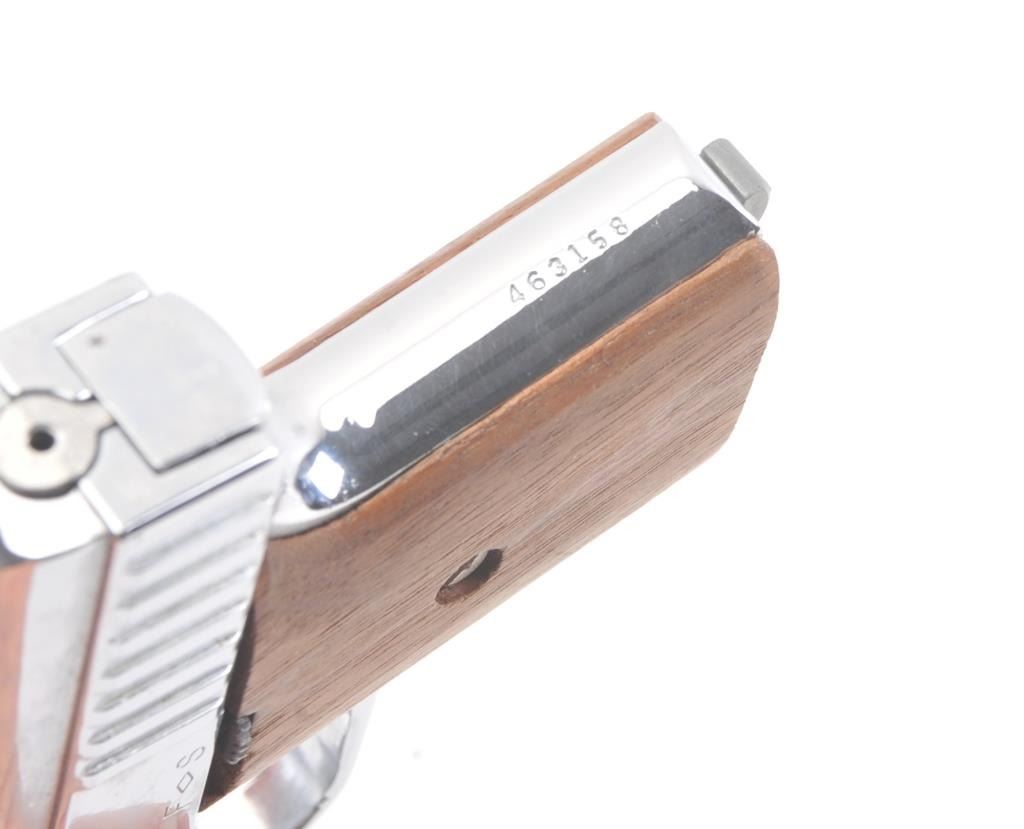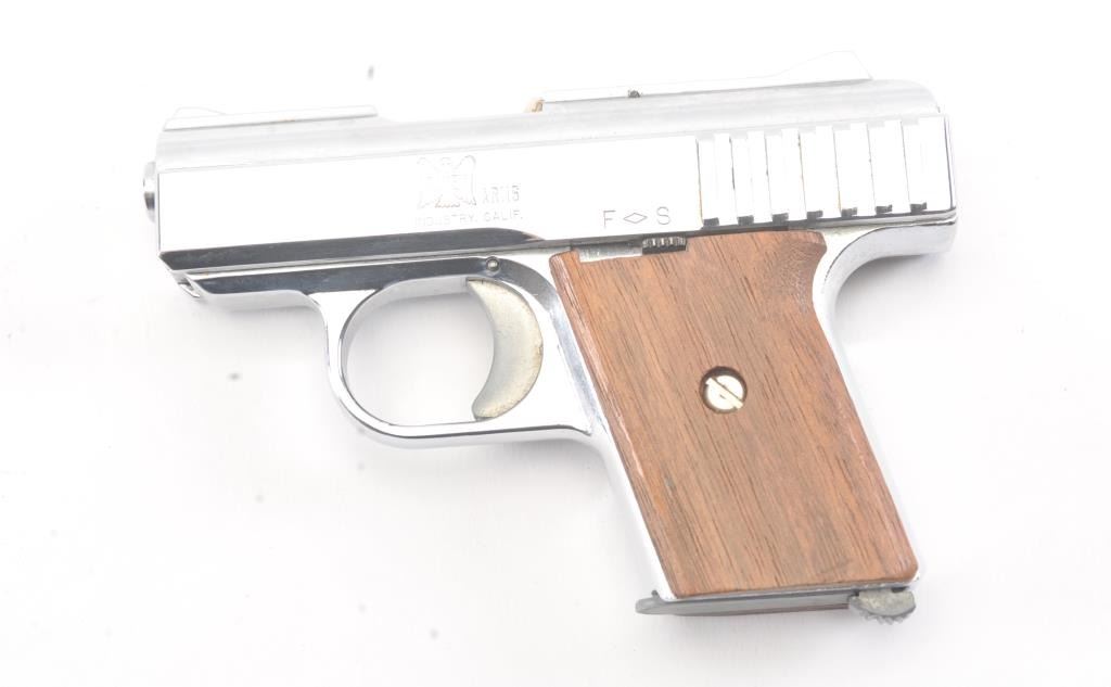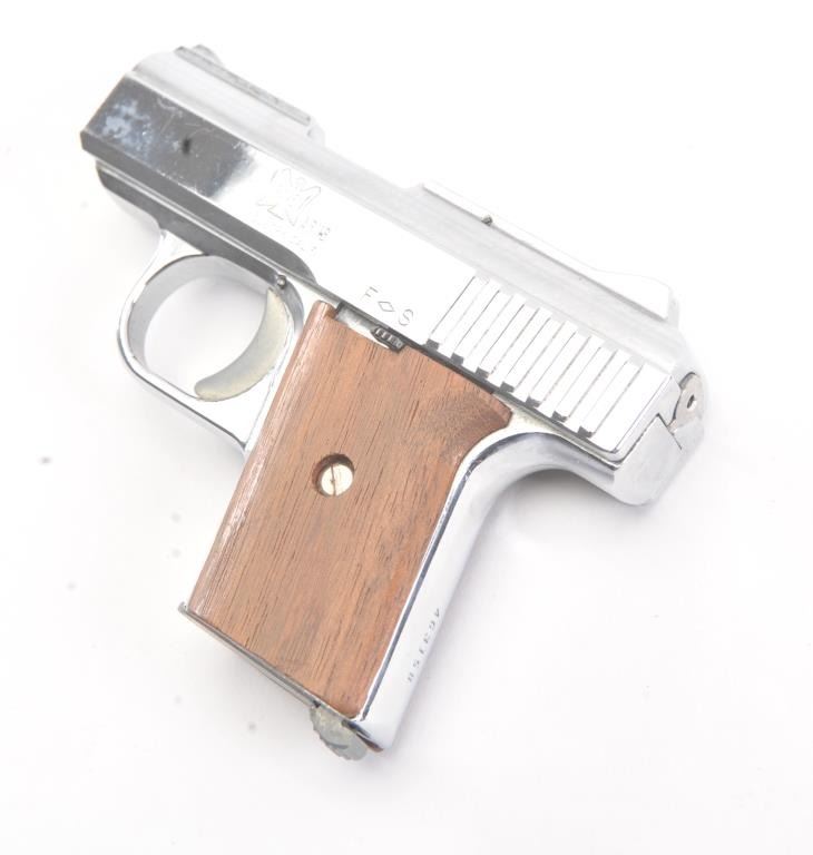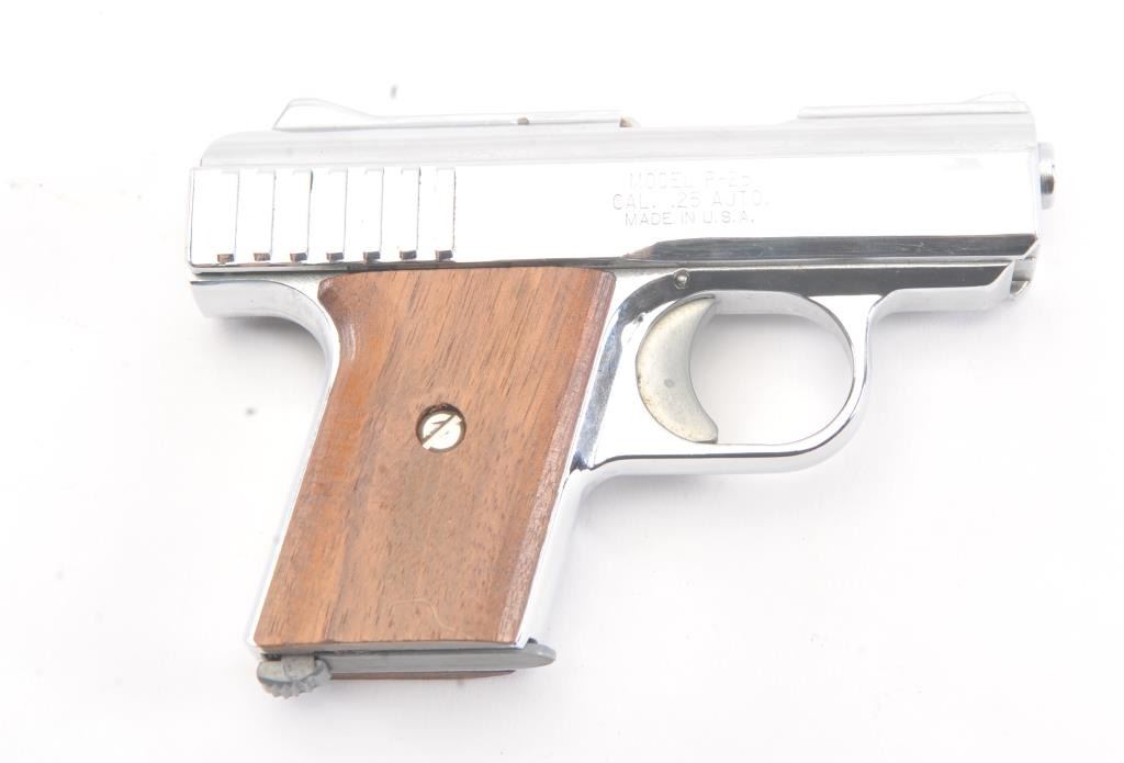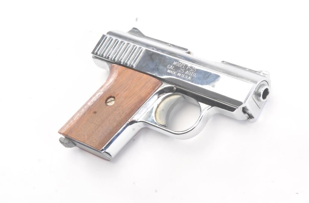 Raven Arms Model P-25 semi-automatic pistol, .25 ACP caliber, Serial #463158. The pistol is in very good overall condition with a 2 ¼” barrel. The pistol retains nearly all of the polished nickel finish. The smooth woodgrips are in very good condition. The action is crisp and the bore is good. The lot includes one correct magazine. Est.: $75-$150. (Modern/PPT).