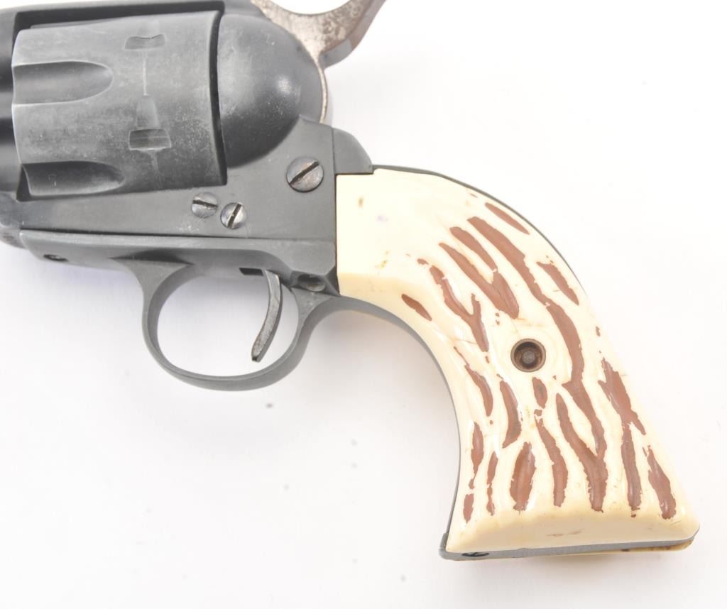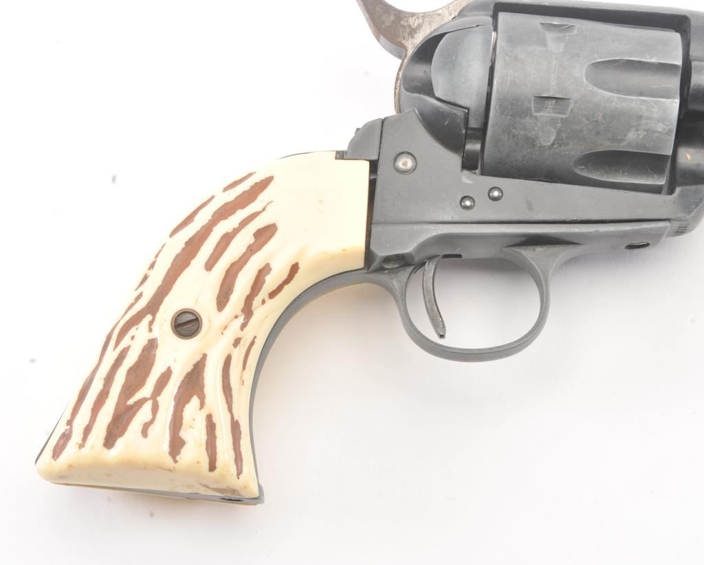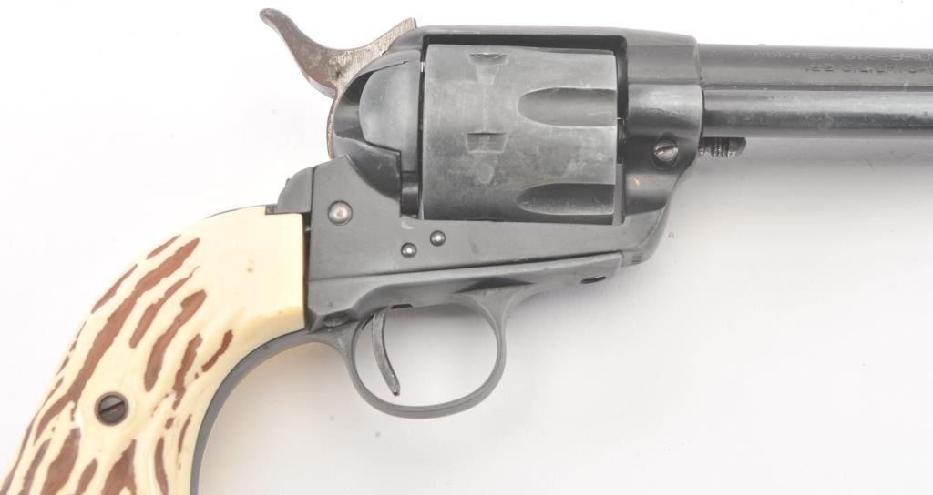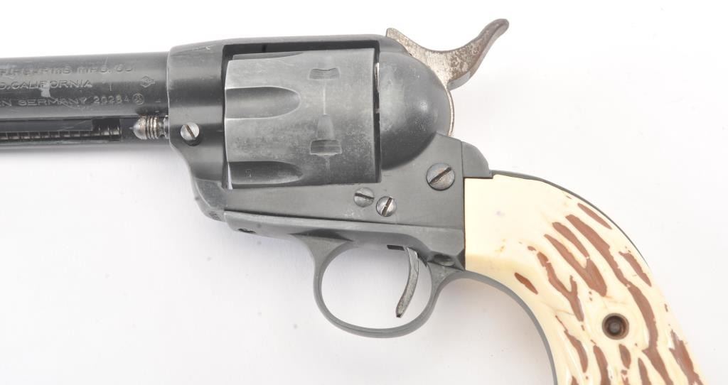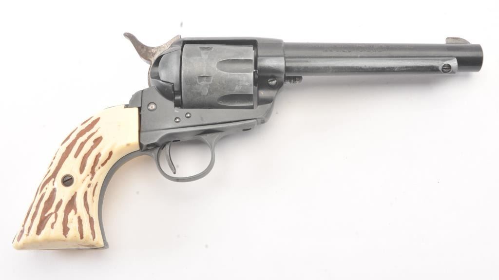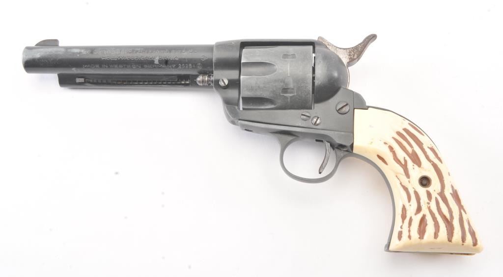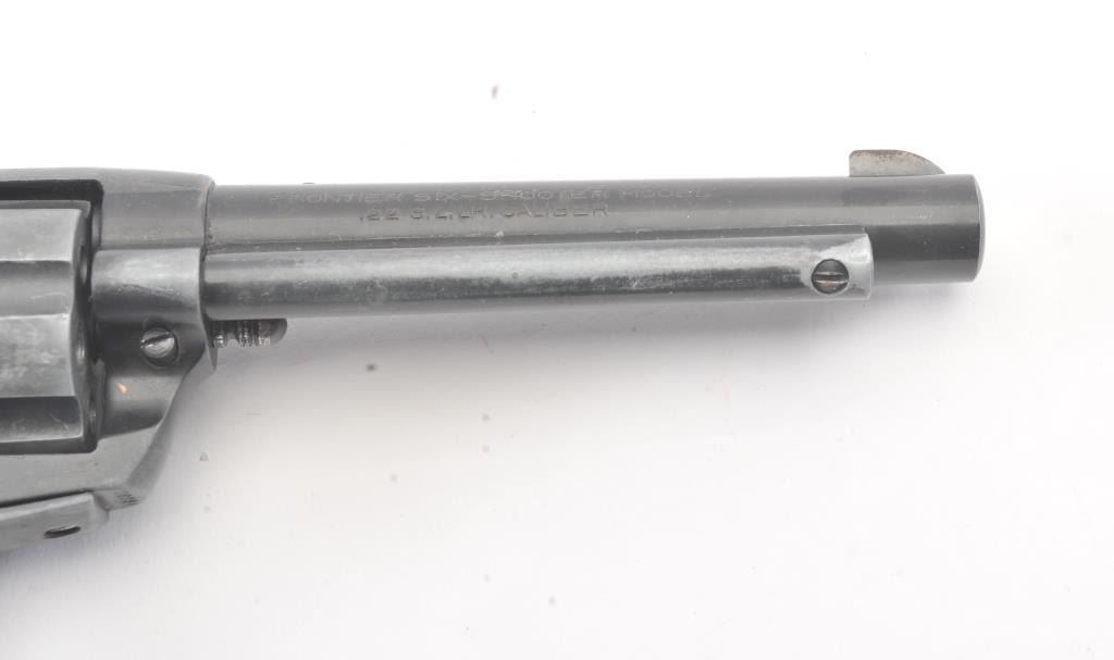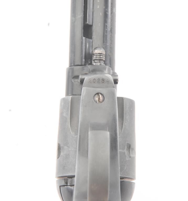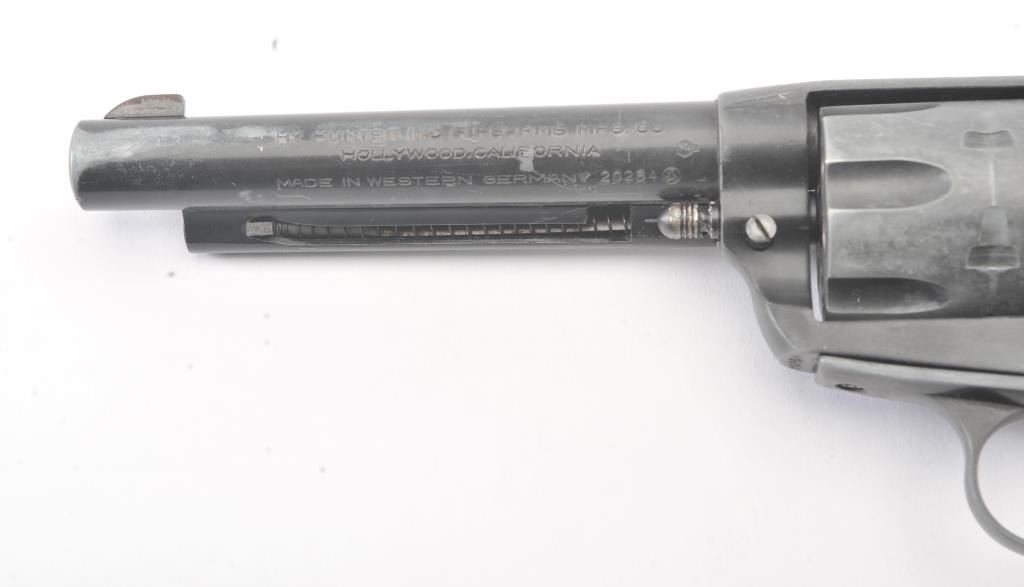 Hy Hunter Frontier Six-Shooter SA revolver, .22 S, L, LR caliber, Serial #20284. The pistol is in very good overall condition with a 5 ½” barrel marked, “WEST GERMANY”. The pistol retains a significant amount of blackfinish with losses at the muzzle and on the cylinder. The faux stag grips are in very good condition with small mars consistent with carry and use. The bore is fair, the action functions and the markings arelegible. Est.: $75-$150. (Modern/PPT).