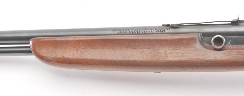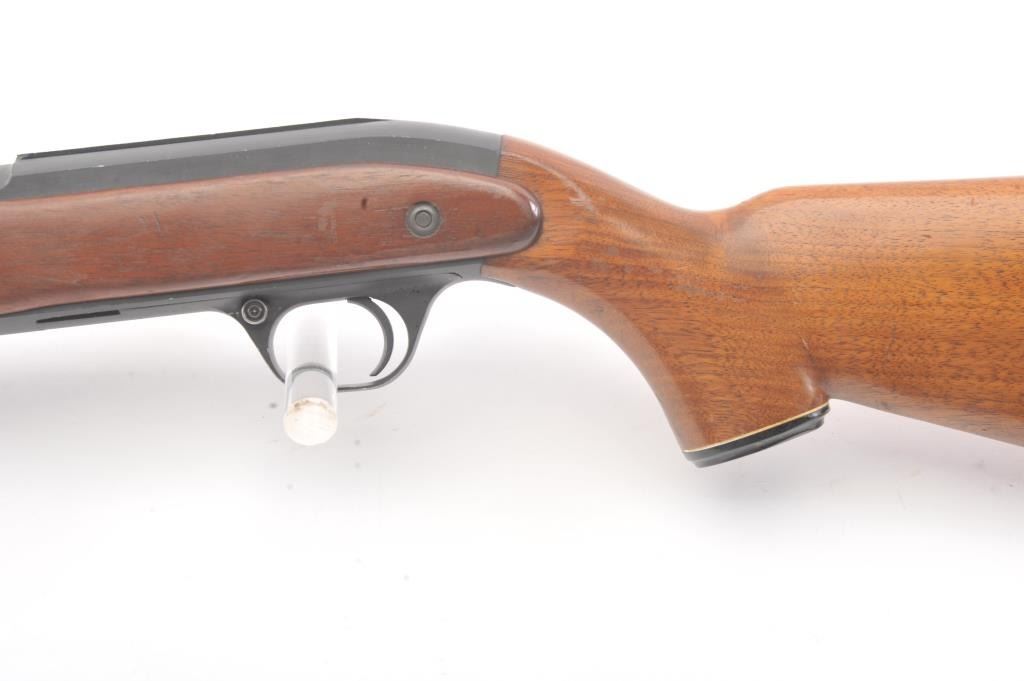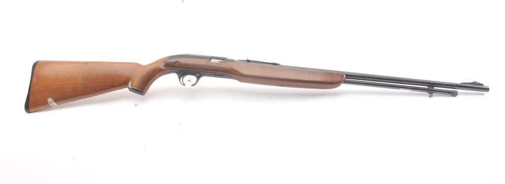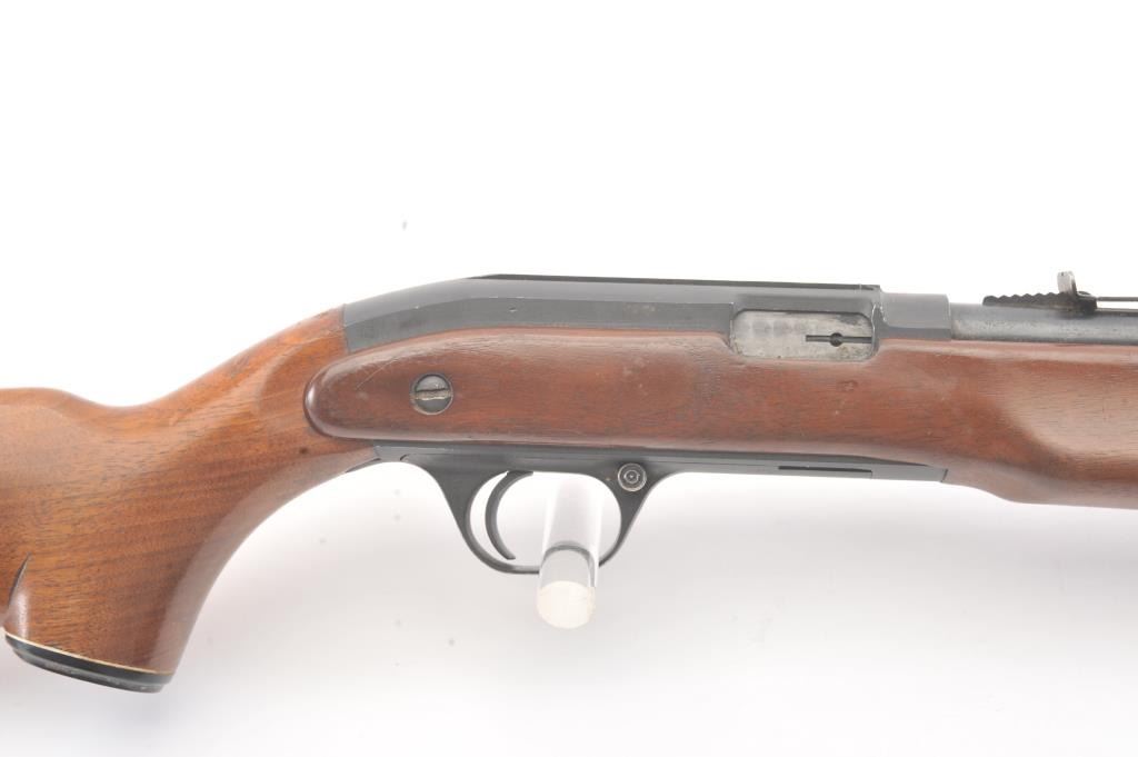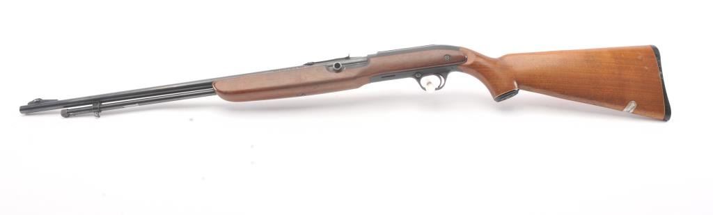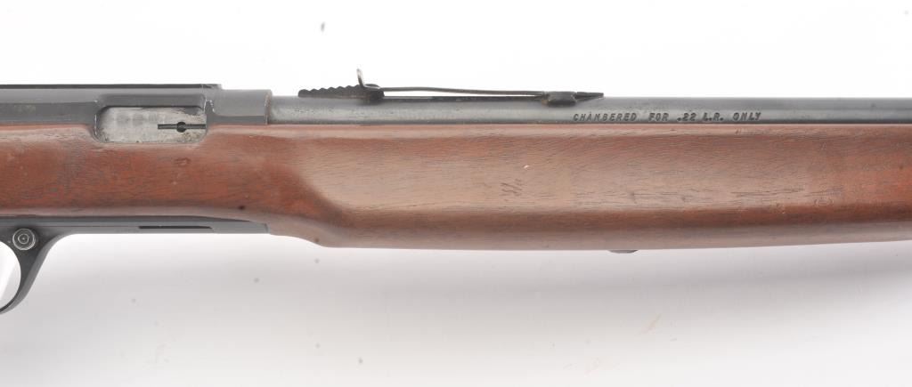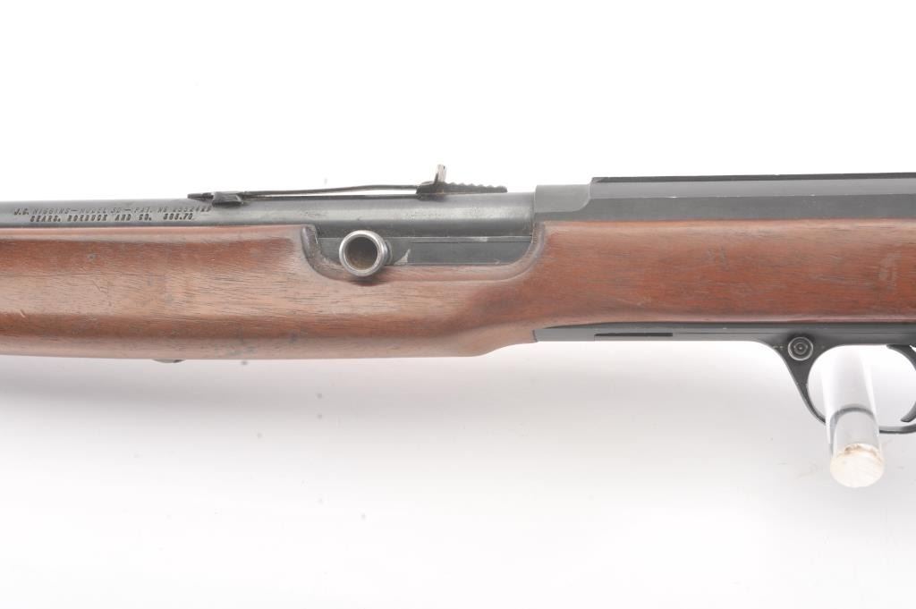 J.C. Higgins Model 30 semi-automatic rifle, .22 caliber, Serial #NSNV. The rifle is in good overall condition with a 24” barrel and ¾ magazine. The metal surfaces retain a significant amount of blue finish with lightsurface rust on the barrel. The smooth wood stock is in good condition with mars and compressions consistent with field use. The bore is fair, the action is crisp and the markings are legible. Est.: $80-160.(C+R).