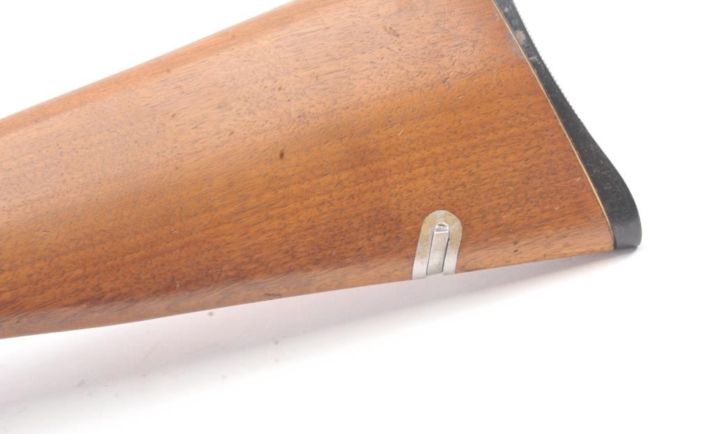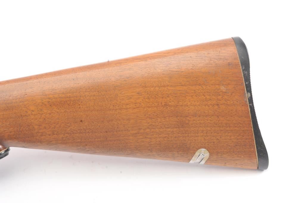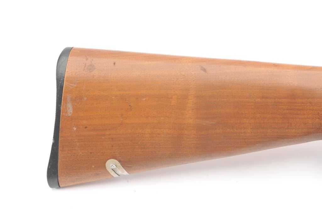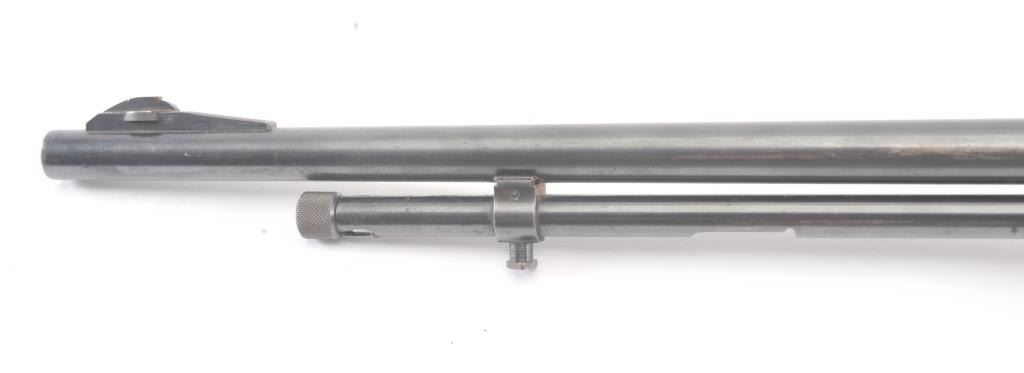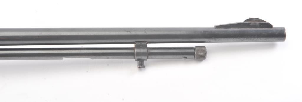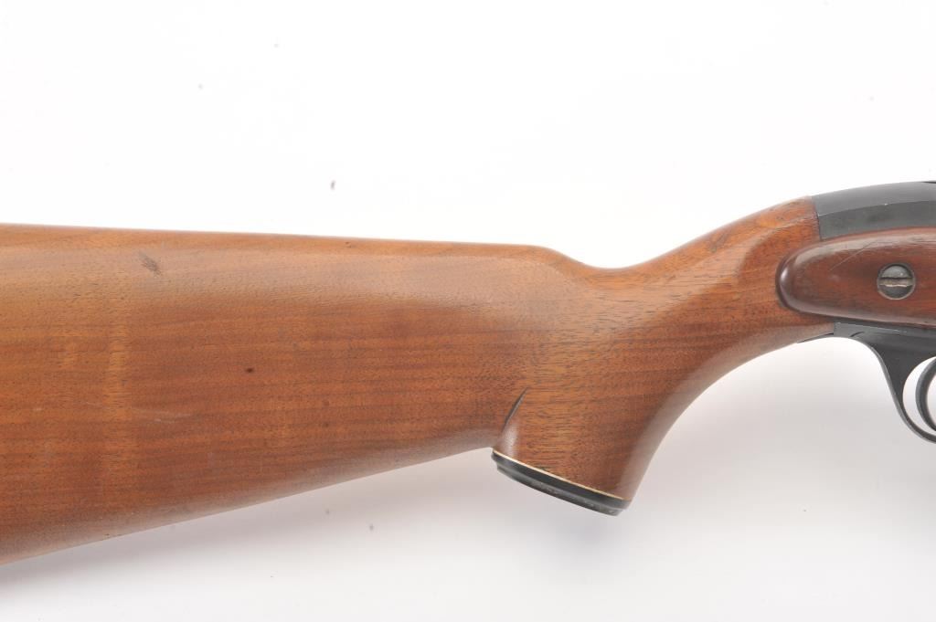 J.C. Higgins Model 30 semi-automatic rifle, .22 caliber, Serial #NSNV. The rifle is in good overall condition with a 24” barrel and ¾ magazine. The metal surfaces retain a significant amount of blue finish with lightsurface rust on the barrel. The smooth wood stock is in good condition with mars and compressions consistent with field use. The bore is fair, the action is crisp and the markings are legible. Est.: $80-160.(C+R).