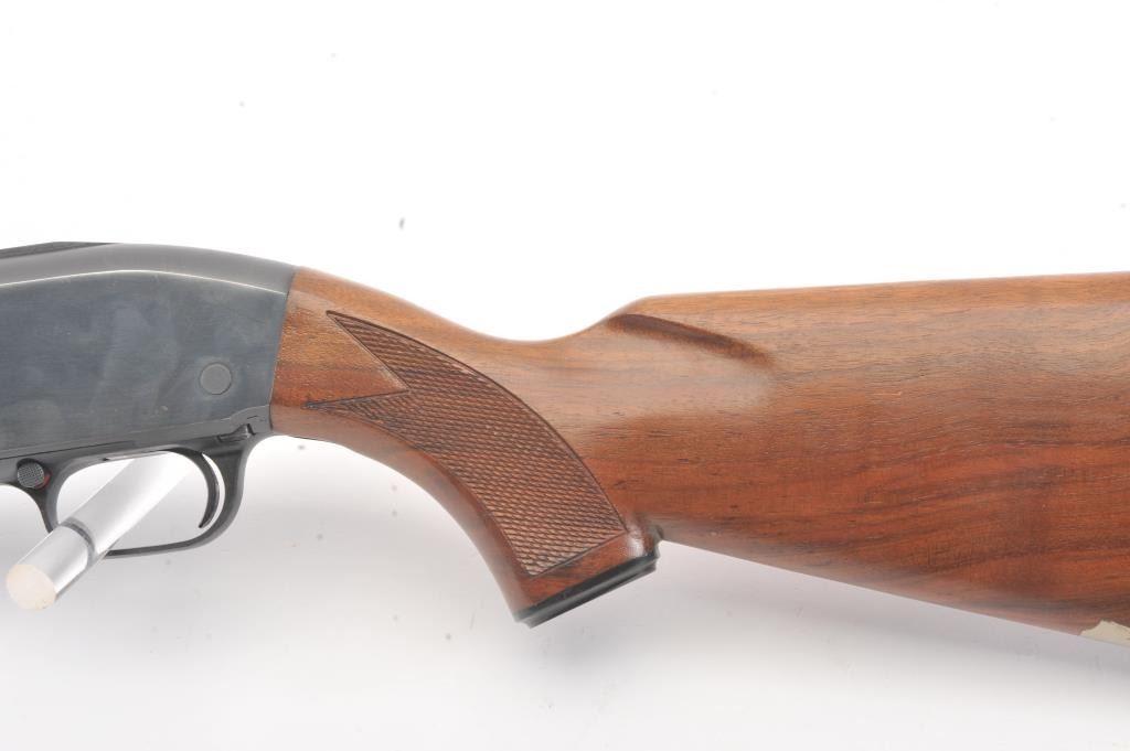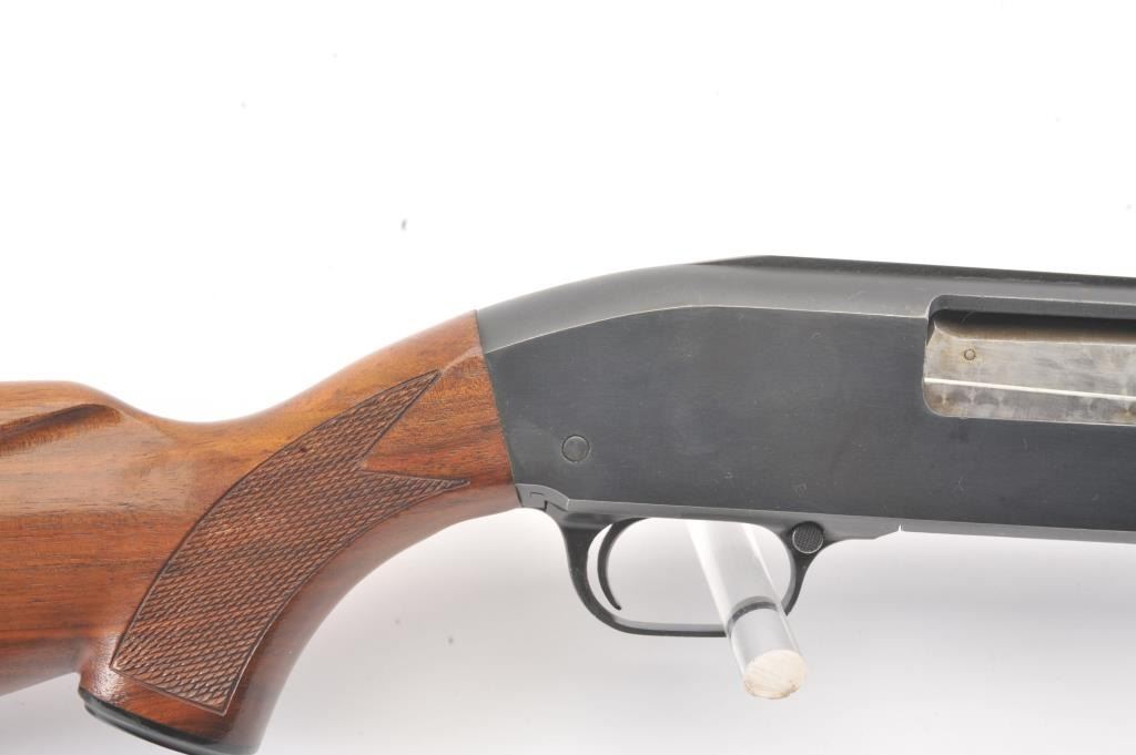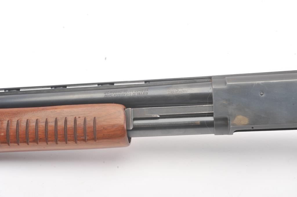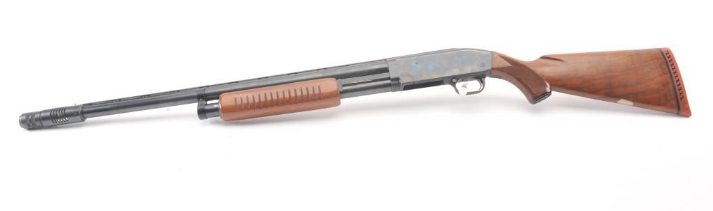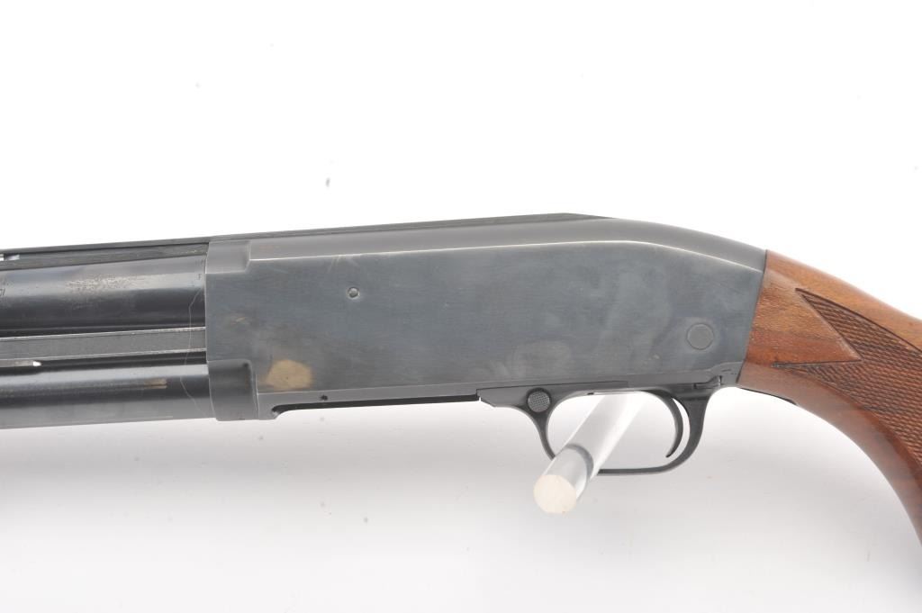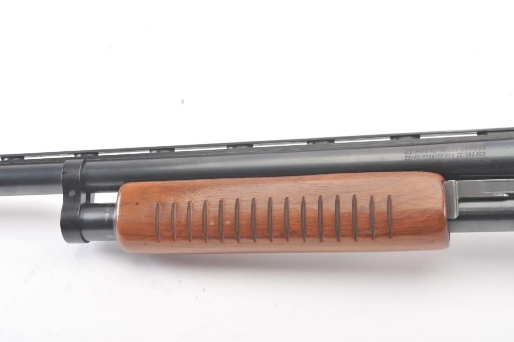 J.C. Higgins Model 20 pump action shotgun, 12 gauge, Serial #5906. The shotgun is in fine overall condition with a 22” barrel with a J.C. Higgins adjustable choke added. The shotgun retains approximately 95% of the blue finish with handling marks and areas of light surface rust. The checkered wood stock is in very good condition with small mars and handling marks, a blank escutcheon plate in the butt and a ventilated rubber padproviding a 14” LOP. The bore is good, the action is crisp and the markings are sharp. Est.: $90-$180. (Modern).