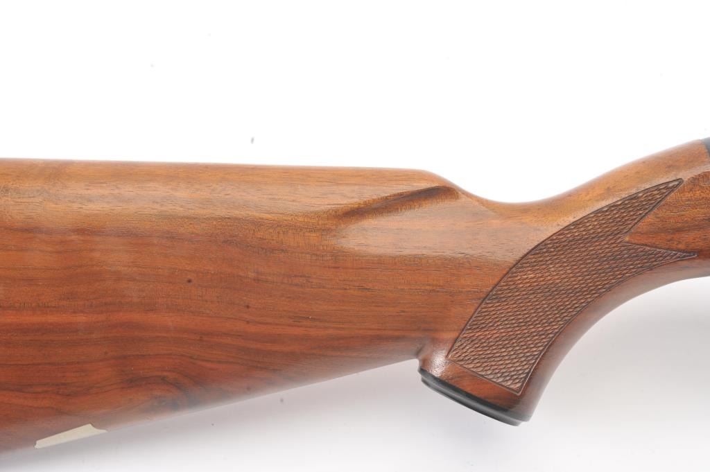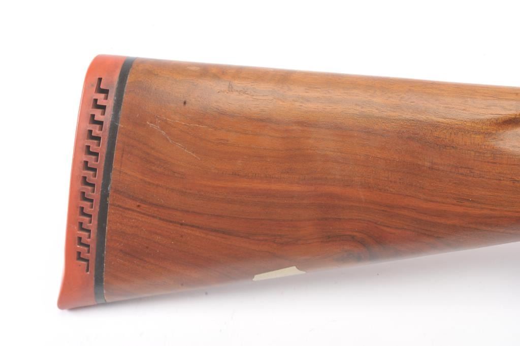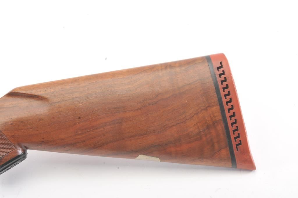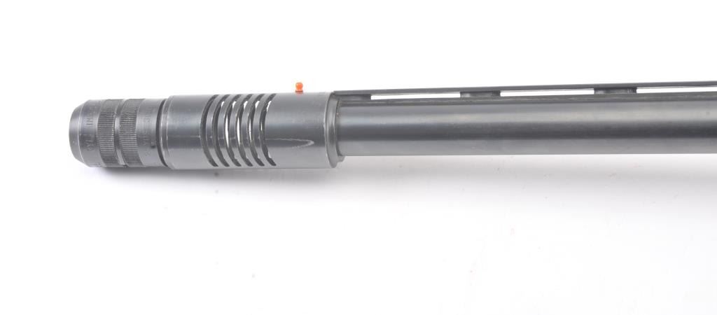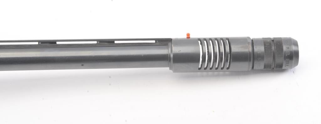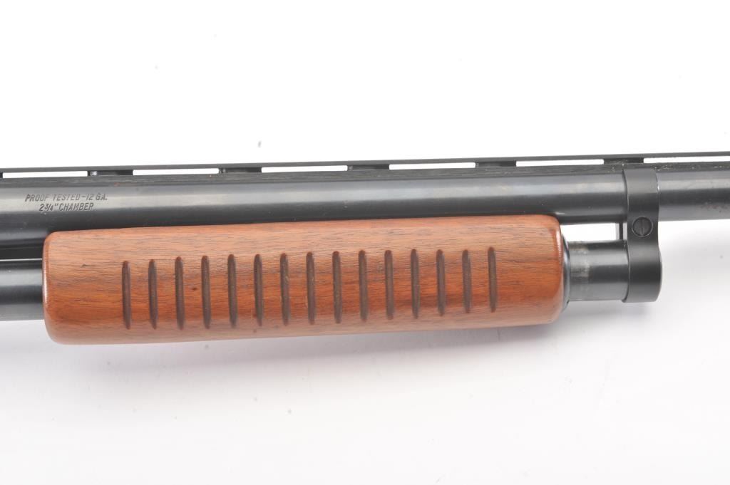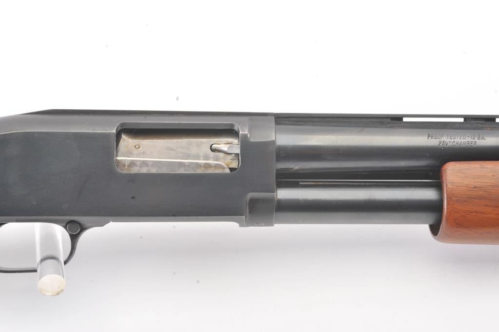 J.C. Higgins Model 20 pump action shotgun, 12 gauge, Serial #5906. The shotgun is in fine overall condition with a 22” barrel with a J.C. Higgins adjustable choke added. The shotgun retains approximately 95% of the blue finish with handling marks and areas of light surface rust. The checkered wood stock is in very good condition with small mars and handling marks, a blank escutcheon plate in the butt and a ventilated rubber padproviding a 14” LOP. The bore is good, the action is crisp and the markings are sharp. Est.: $90-$180. (Modern).