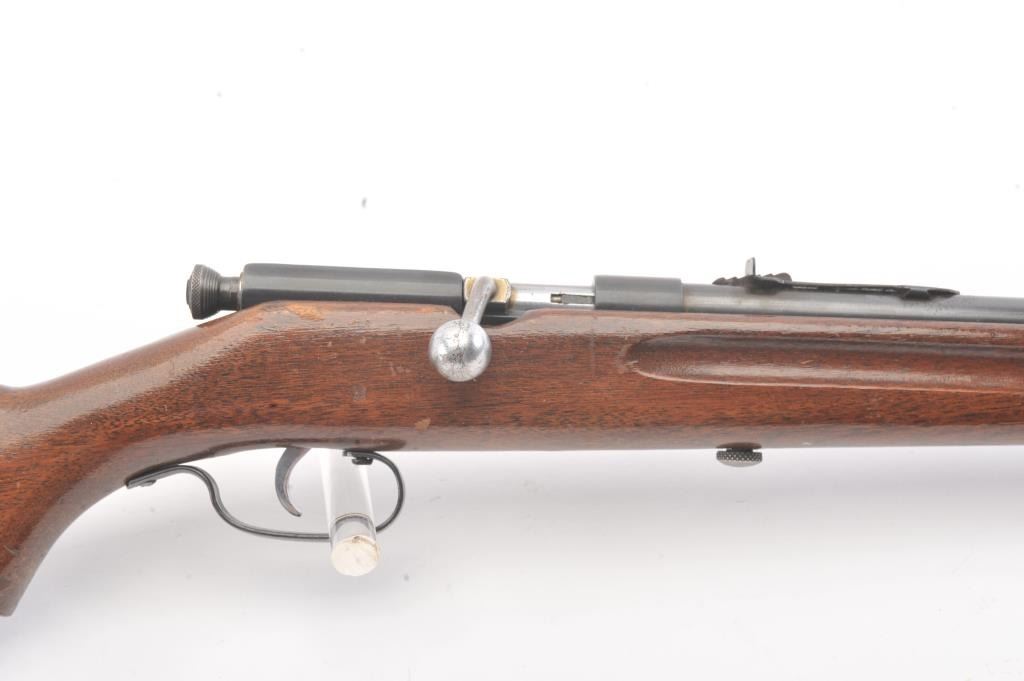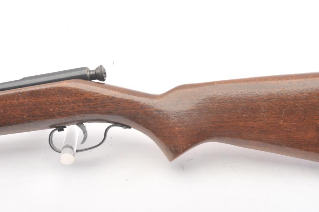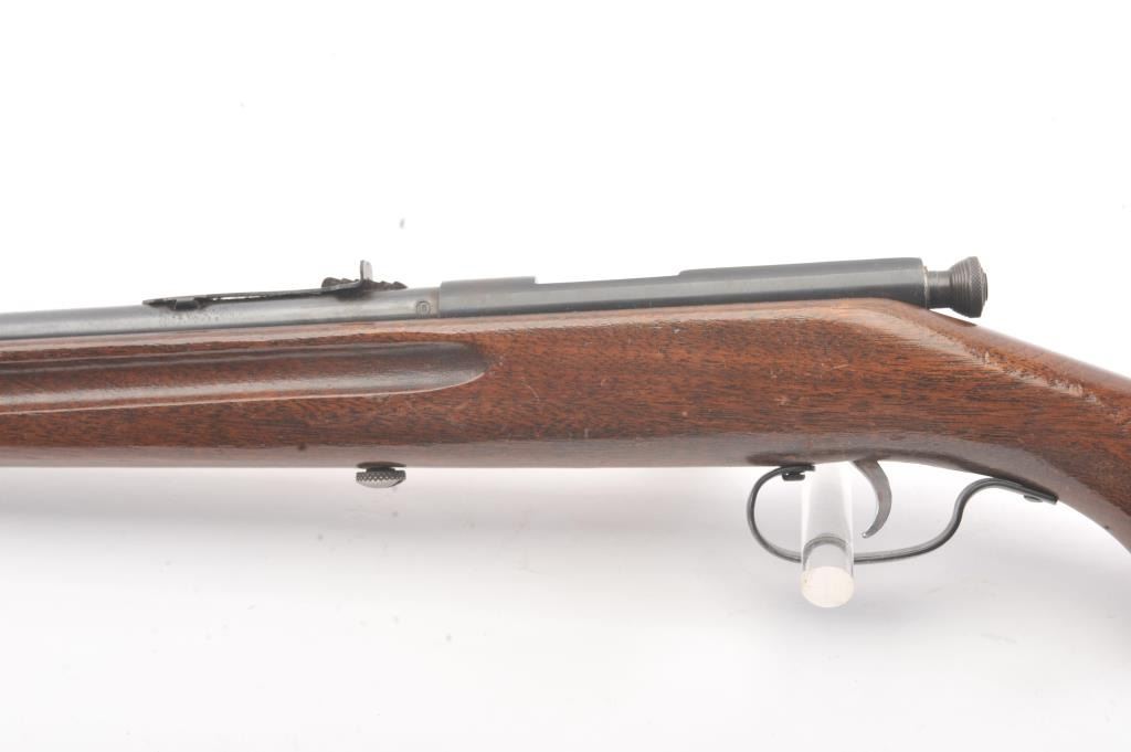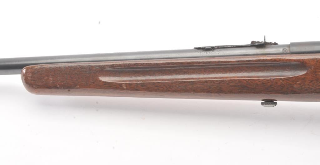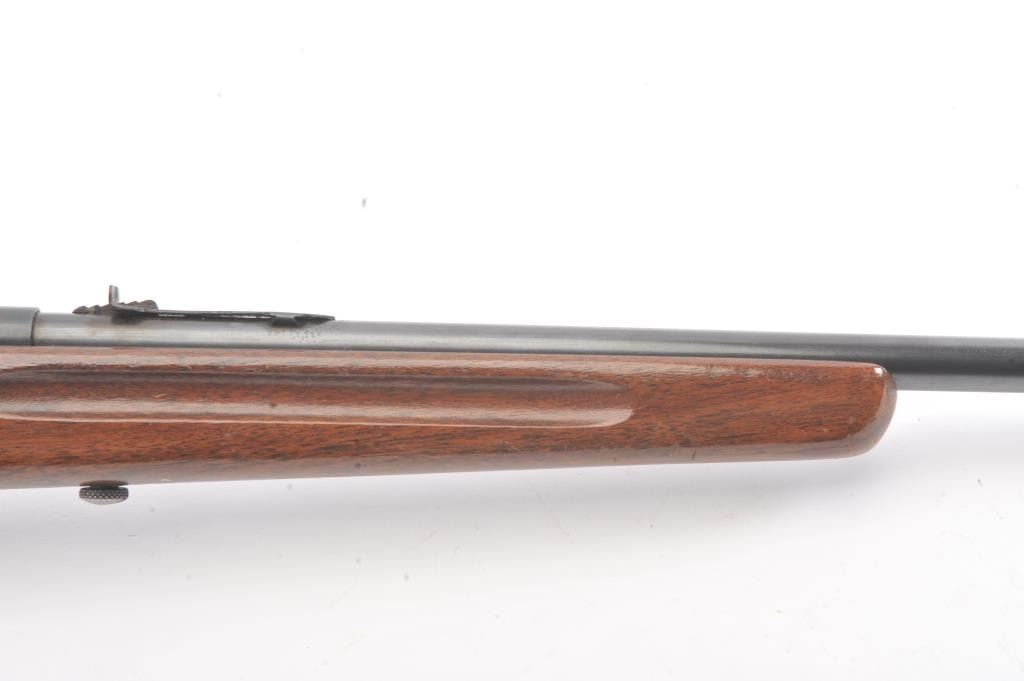 Springfield Model 52-A single shot rifle, .22 S., L., or L.R. caliber, Serial #NSNV. The rifle is in very good overall condition with a 22” barrel. The metal surfaces retain a significant amount of toning blue finish with areas of light surface rust. The smooth wood stock is in good condition with mars and dents associated with field use. The bore is fair and the action functions. Est.: $60-$120. (C+R).