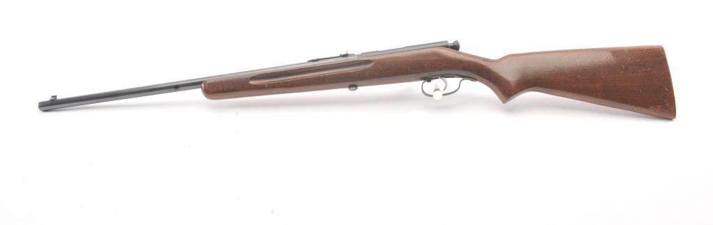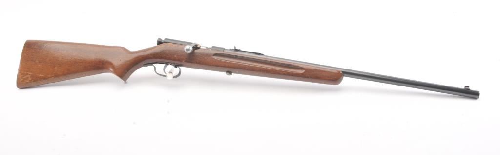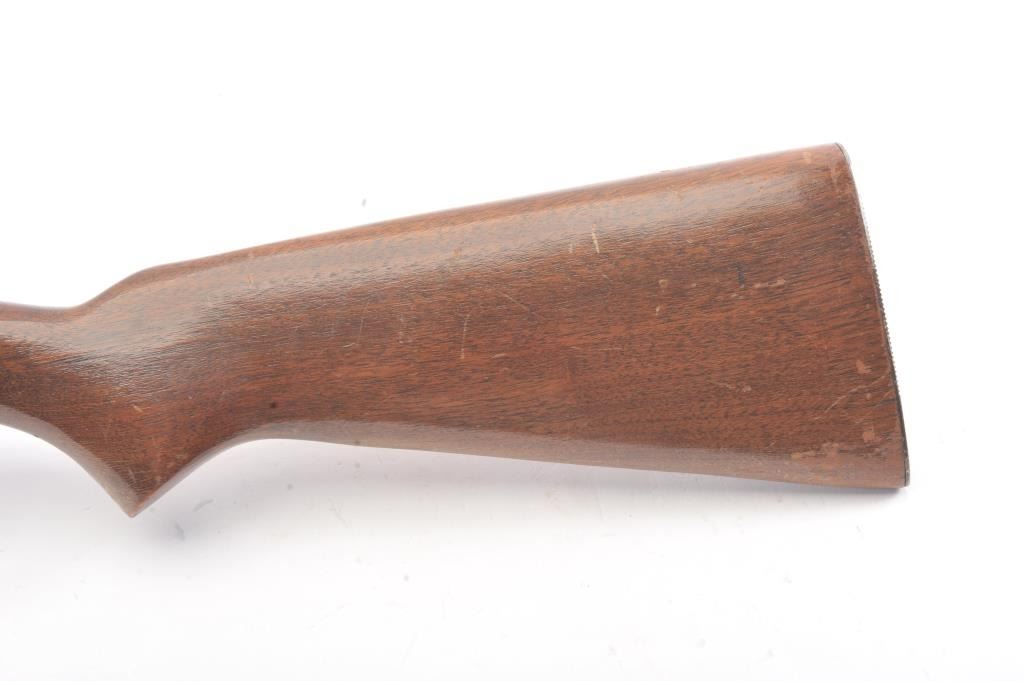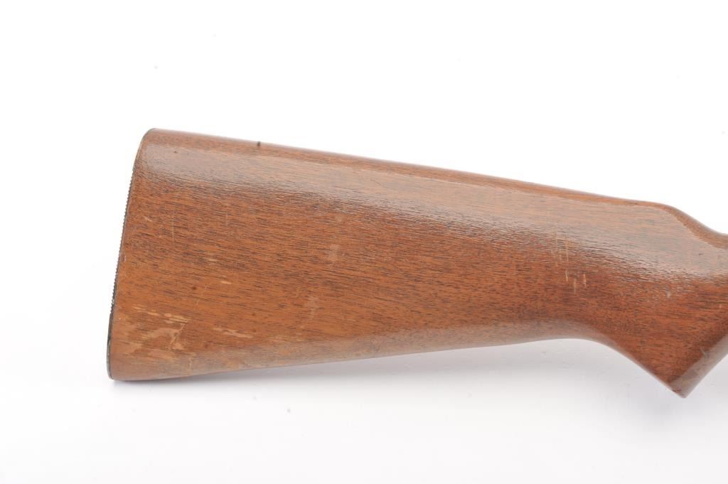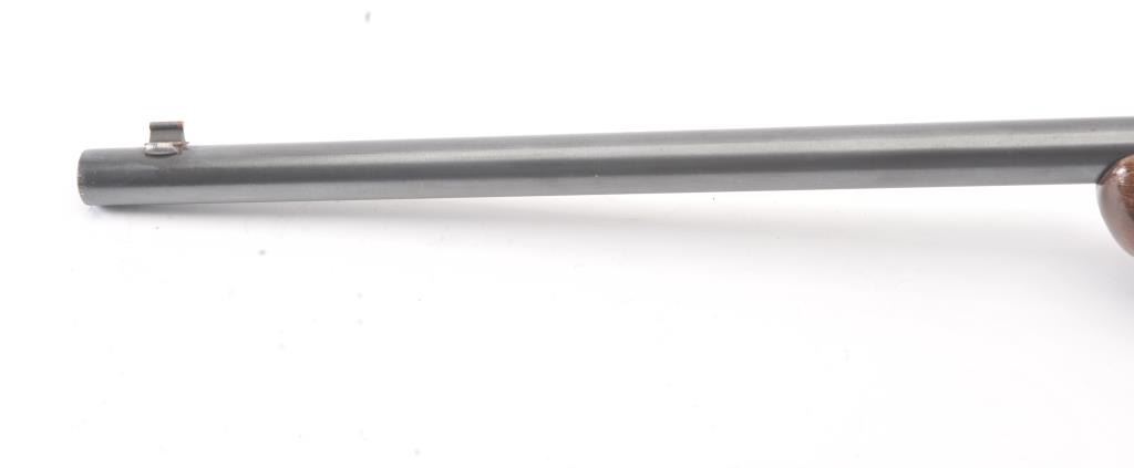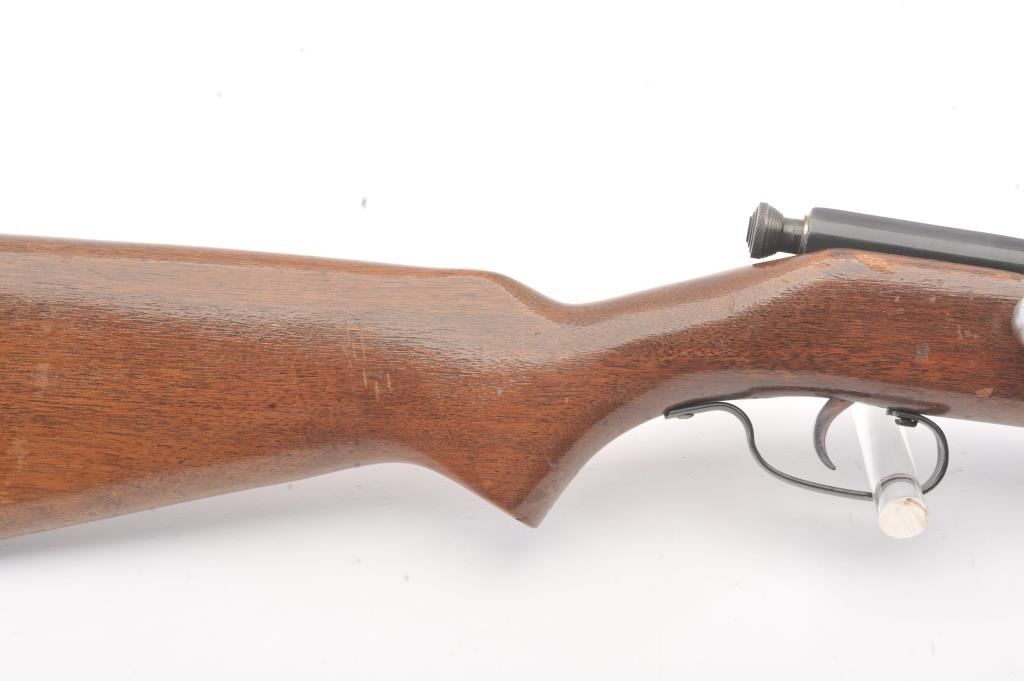 Springfield Model 52-A single shot rifle, .22 S., L., or L.R. caliber, Serial #NSNV. The rifle is in very good overall condition with a 22” barrel. The metal surfaces retain a significant amount of toning blue finish with areas of light surface rust. The smooth wood stock is in good condition with mars and dents associated with field use. The bore is fair and the action functions. Est.: $60-$120. (C+R).