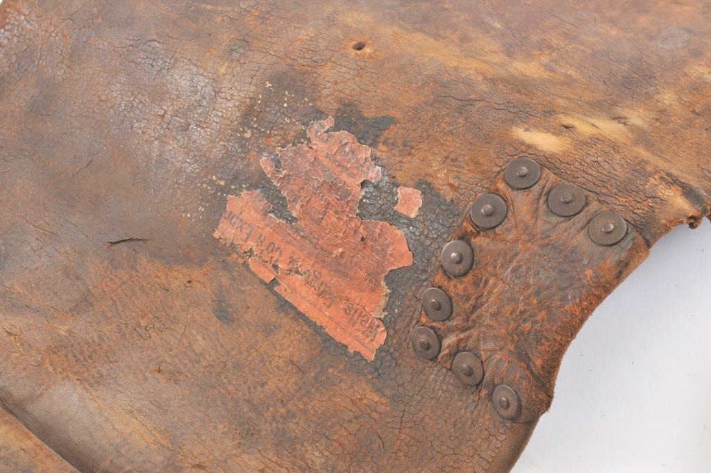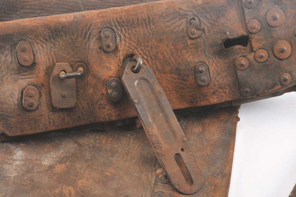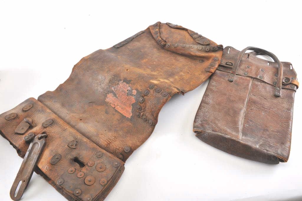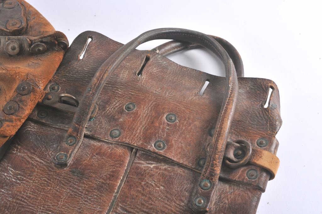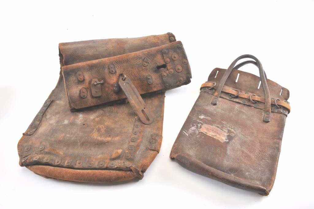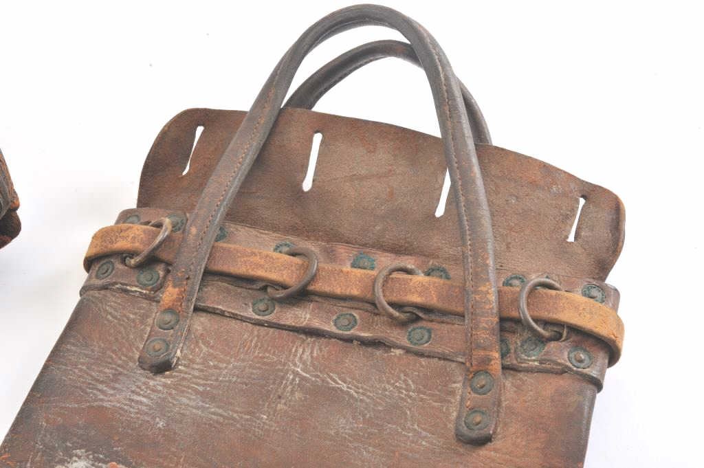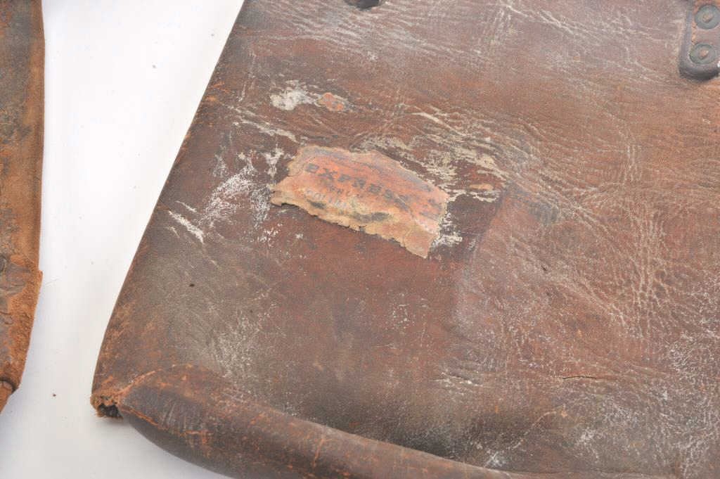 Lot of 2 authentic heavy leather Express Co. bags, both with partial Wells, Fargo & Co. Express orange stickers remaining; one bag is approximately 27” x 13”, the other is approximately 12” x 9”; both show wear and long use. Est.: $200-400