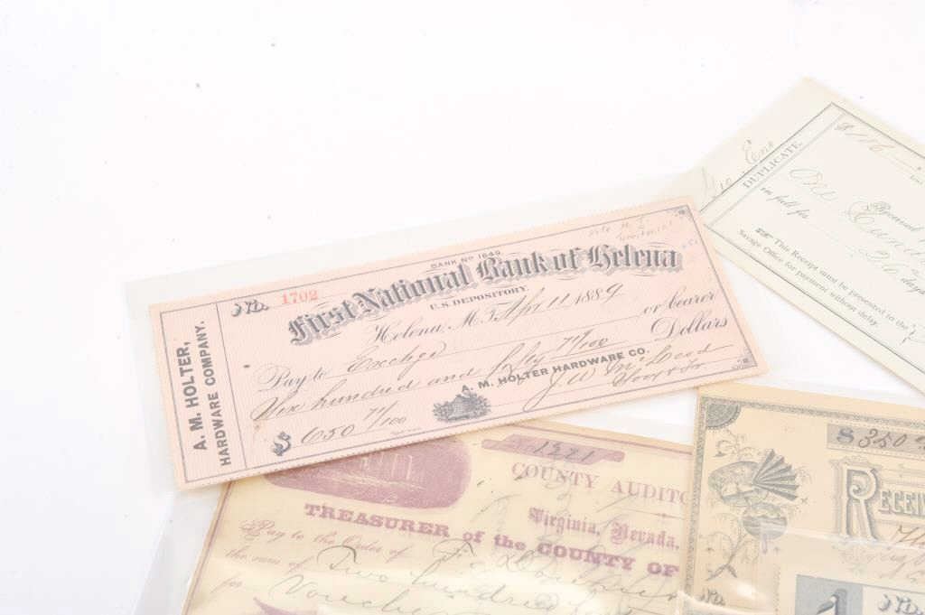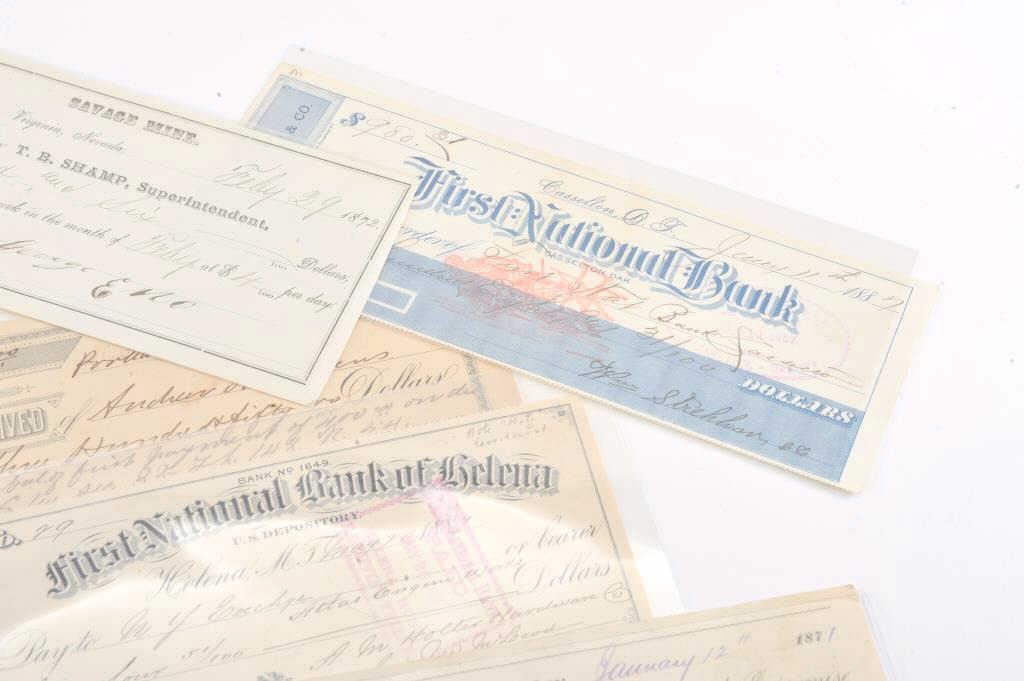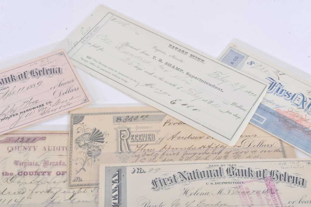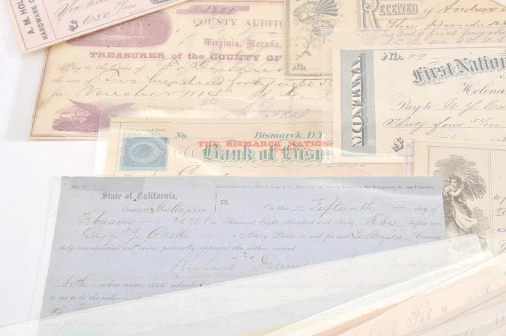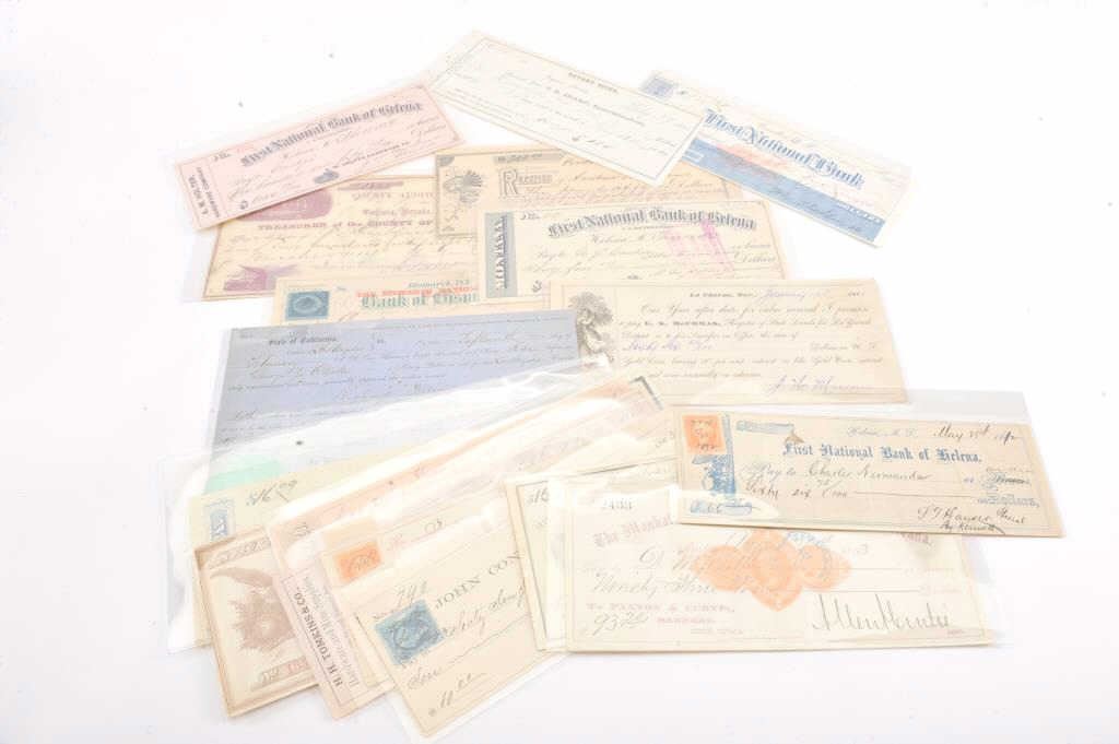 Lot of 20 misc. collectible old paper, mostly cancelled checks from locations like Helena, Montana Territory, Carson City, Nevada, Bismarck, Dakota Territory, San Francisco, CA ranging in dates from the 1860’s to 1880’s. Est.: $100-200