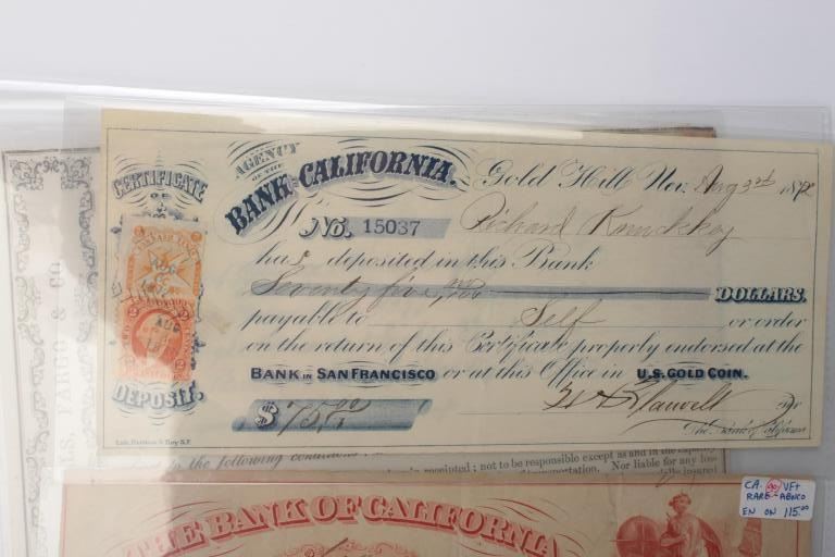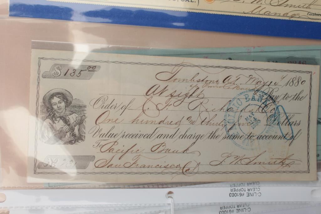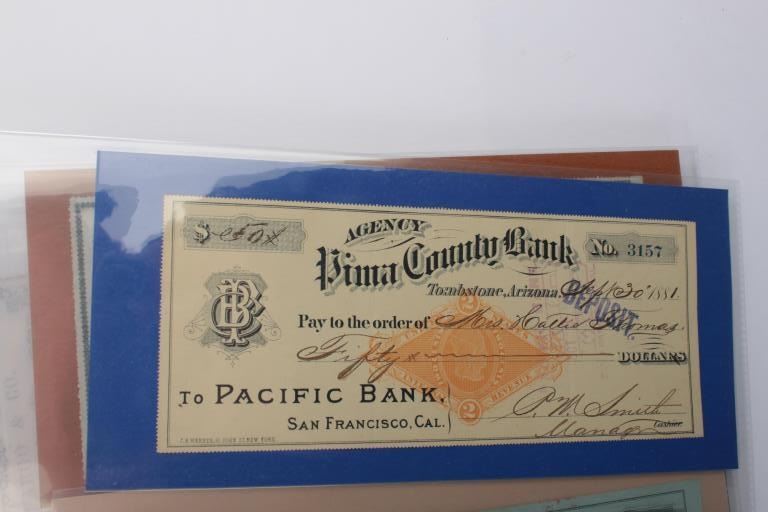 Lot of 15 misc. collectible old paper, mostly Wells, Fargo & Co. or Tombstone, A.T.-related; various banks, etc. dating from the 1870’s to 1880’s. Est.: $100-200
