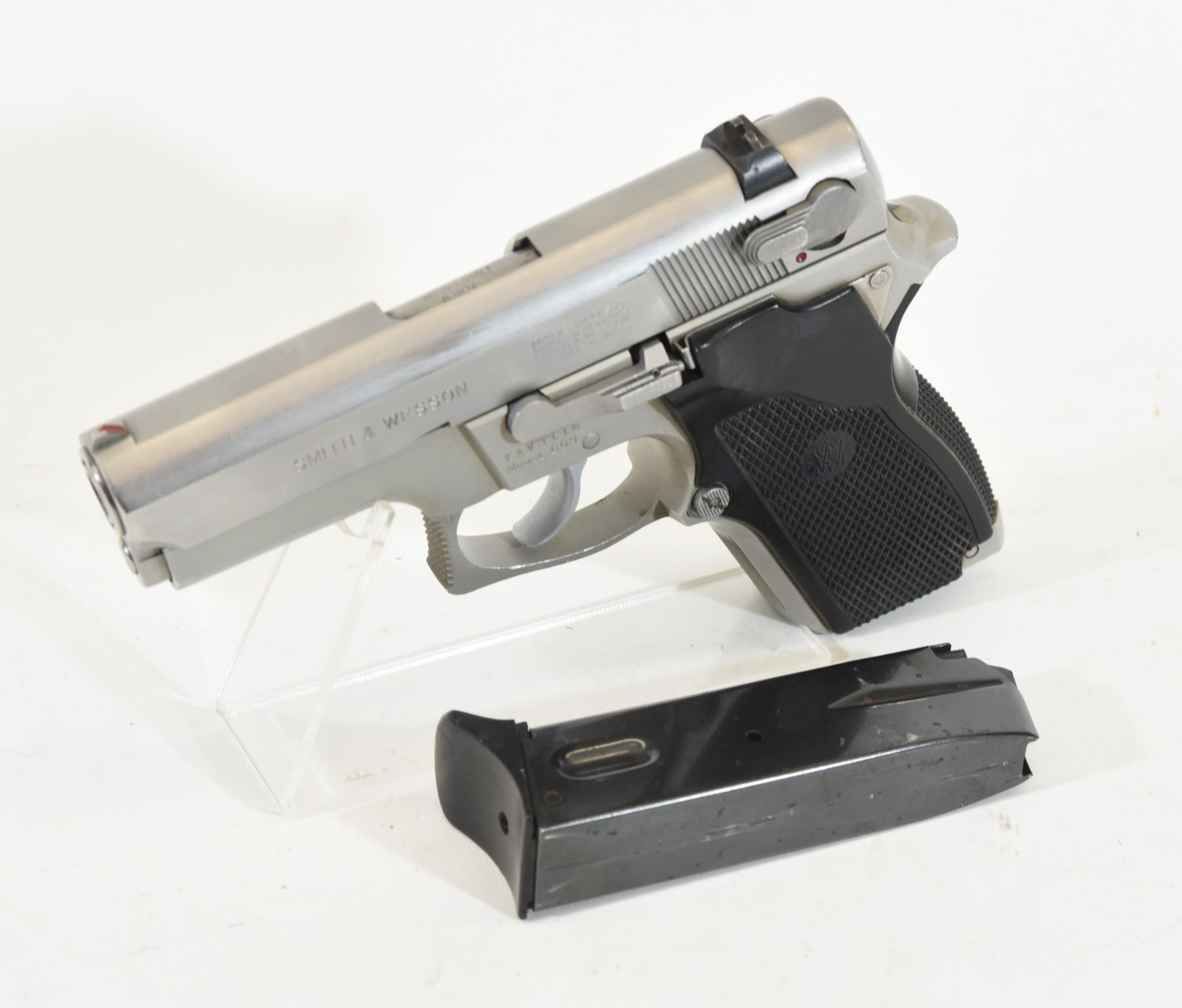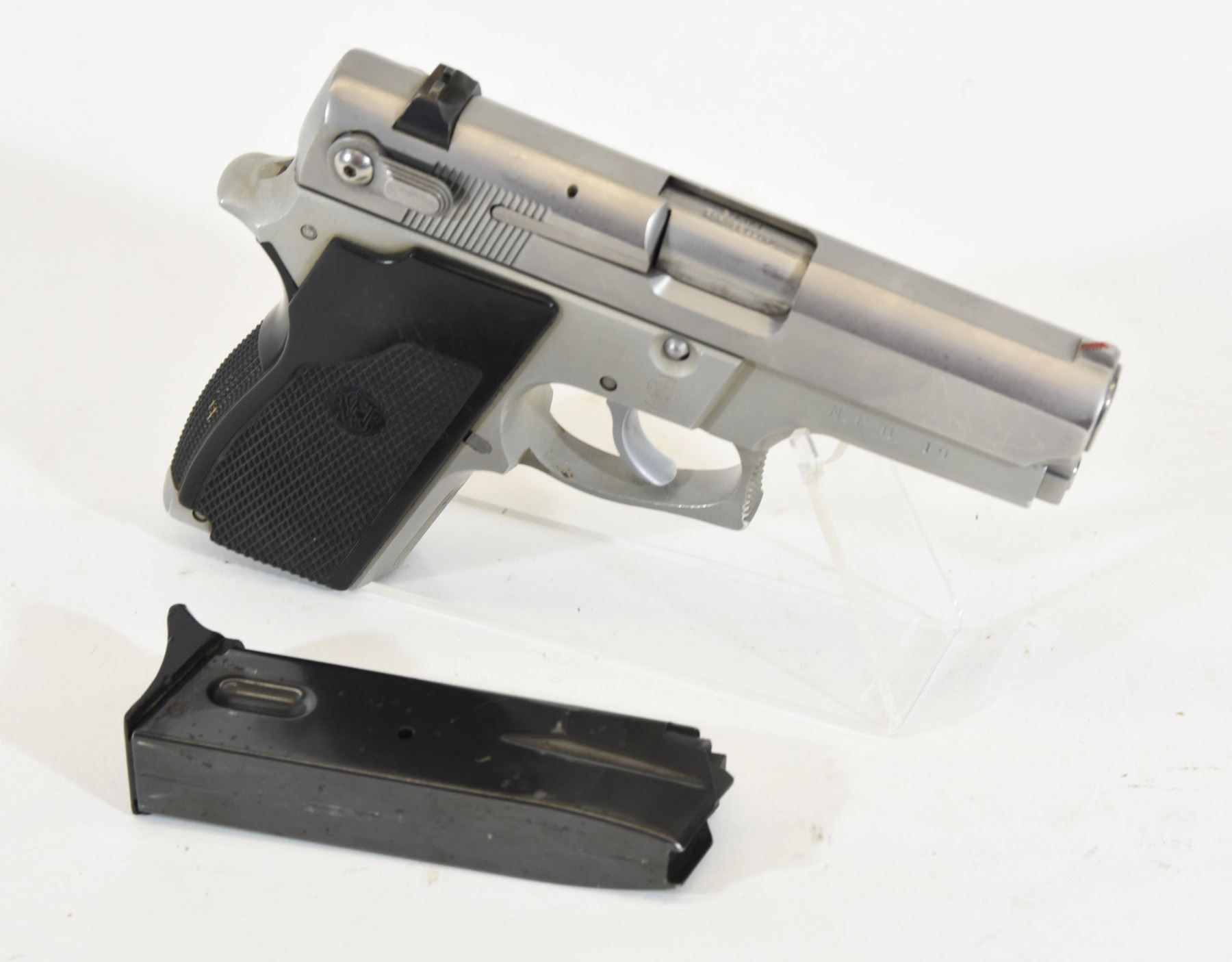Prohibited, semi-auto, 9mm Luger, 89mm barrel, SN TAV3116. Plastic grips and stainless frame have numerous light scratches. Bore is excellent.