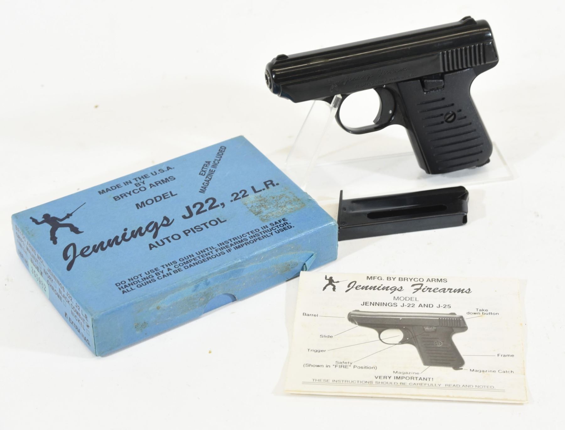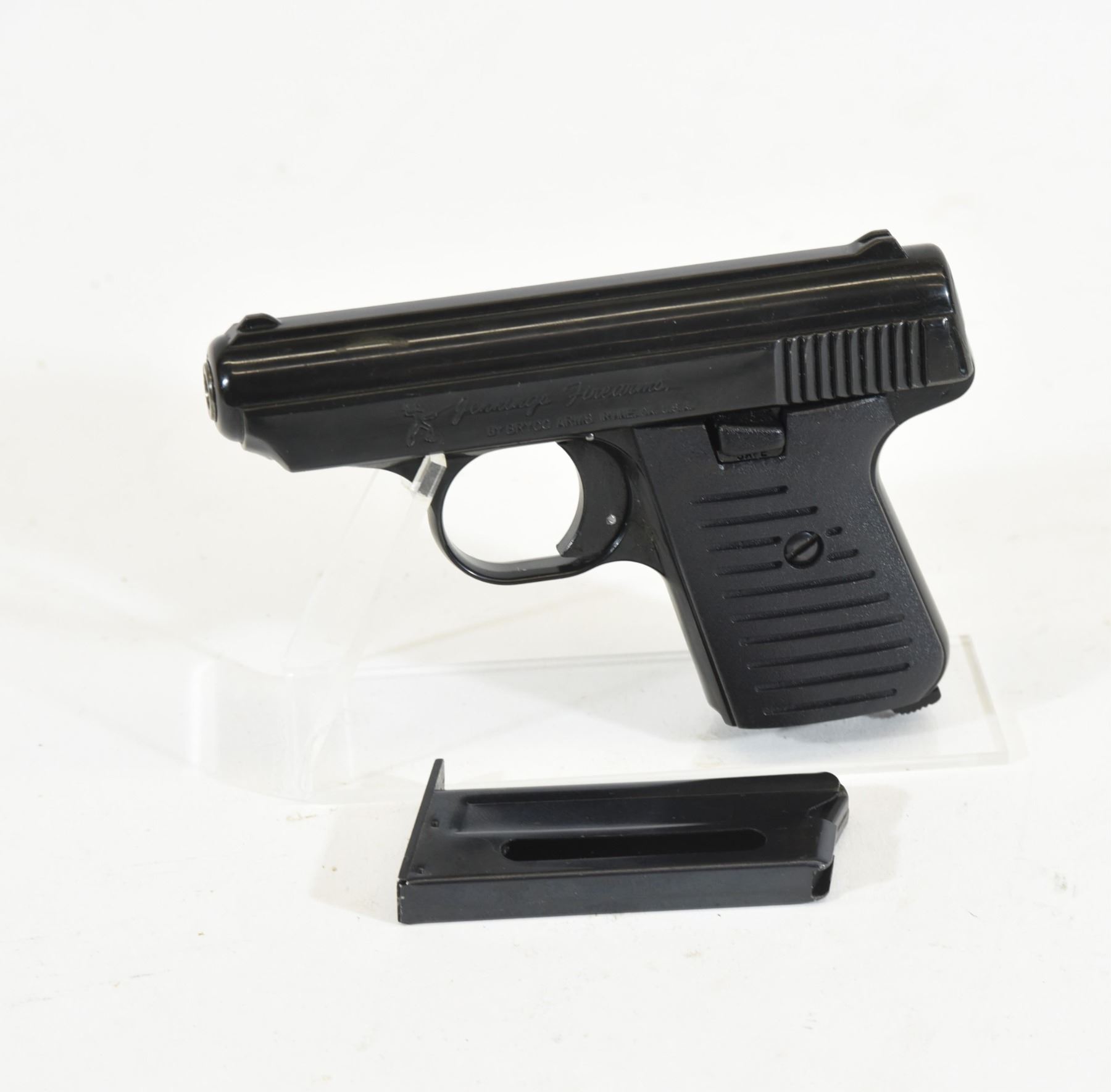 Prohibited, semi-auto, .22LR caliber, 64mm barrel, SN 355982. Bluing is very good with some marks near firing pin indicator. Slide must be fully racked to cock action. Bore is good. Comes with original box.