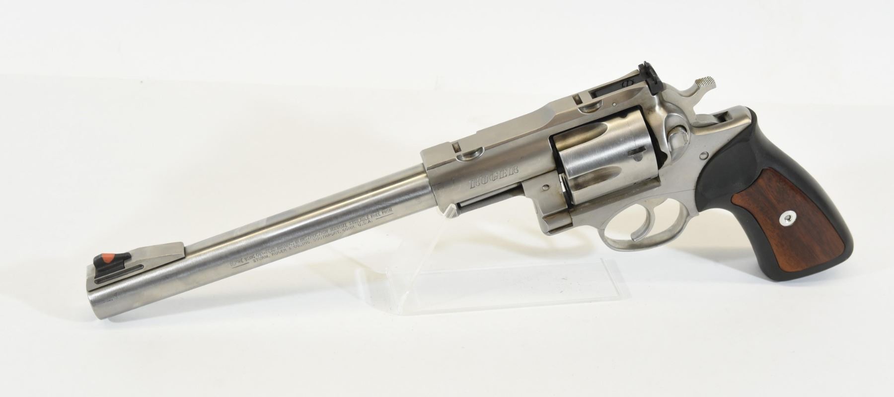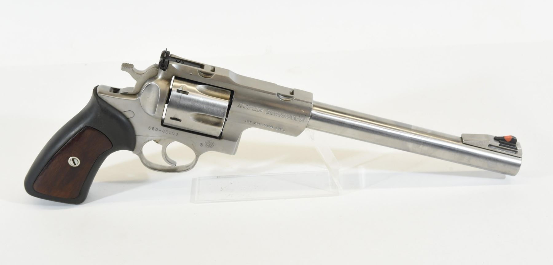 Restricted, double action revolver, 44 magnum, 241mm barrel, SN 55083153. Wood and rubber grips are in good condition. Stainless finish is good. Has some light marks. Bore is excellent.