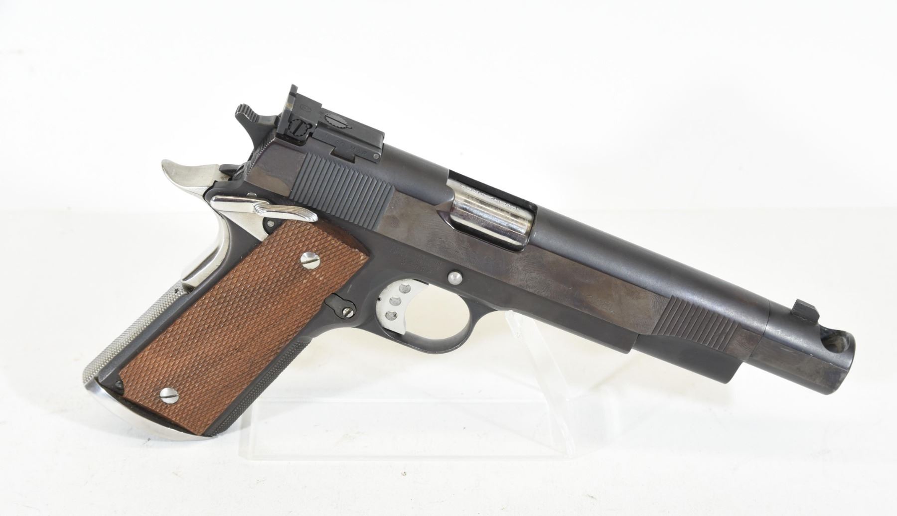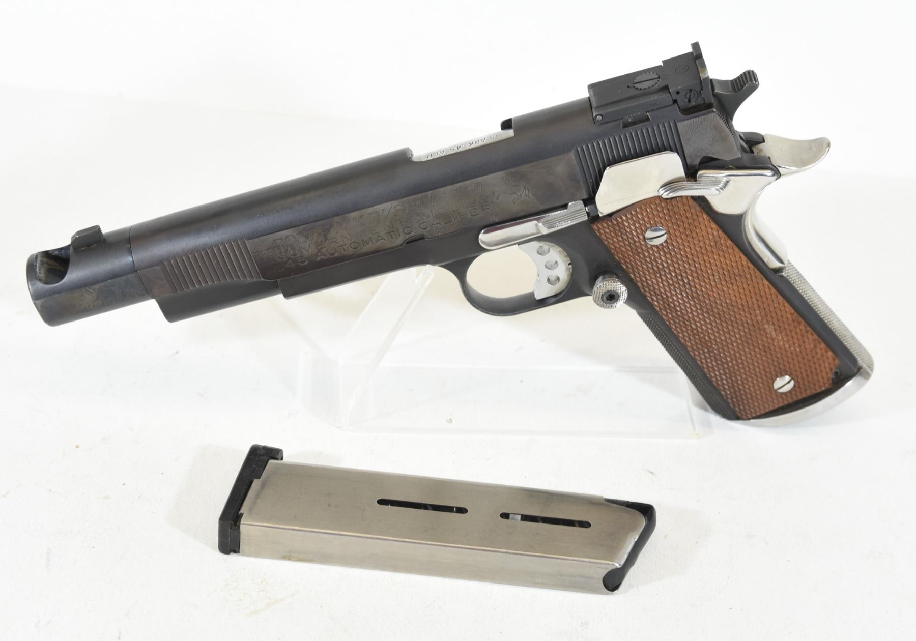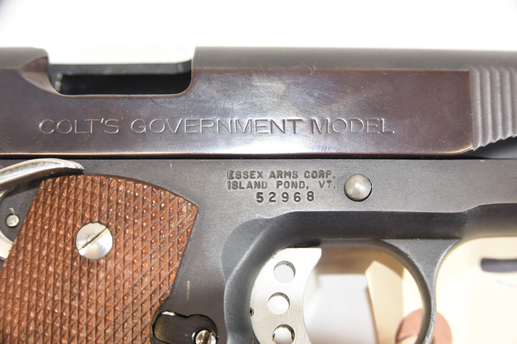 Restricted 7-shot semi-auto, 45 Auto, 127MM barrel, SN 52968. Grip panels are good, bluing is good, bore is very good, with compensator, oversized mag release and other upgraded parts, custom trigger work done. This gun is an Essex Arms with a Colt MK IV/Series 70 Government Model slide on the Essex Arms frame.