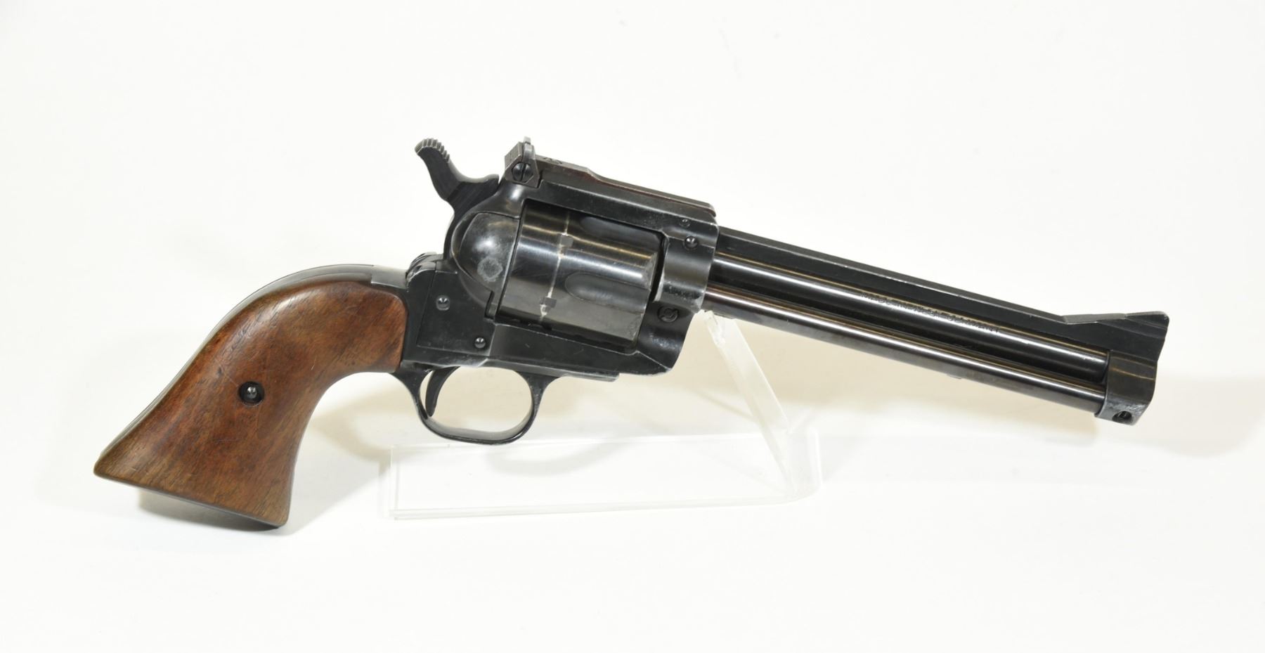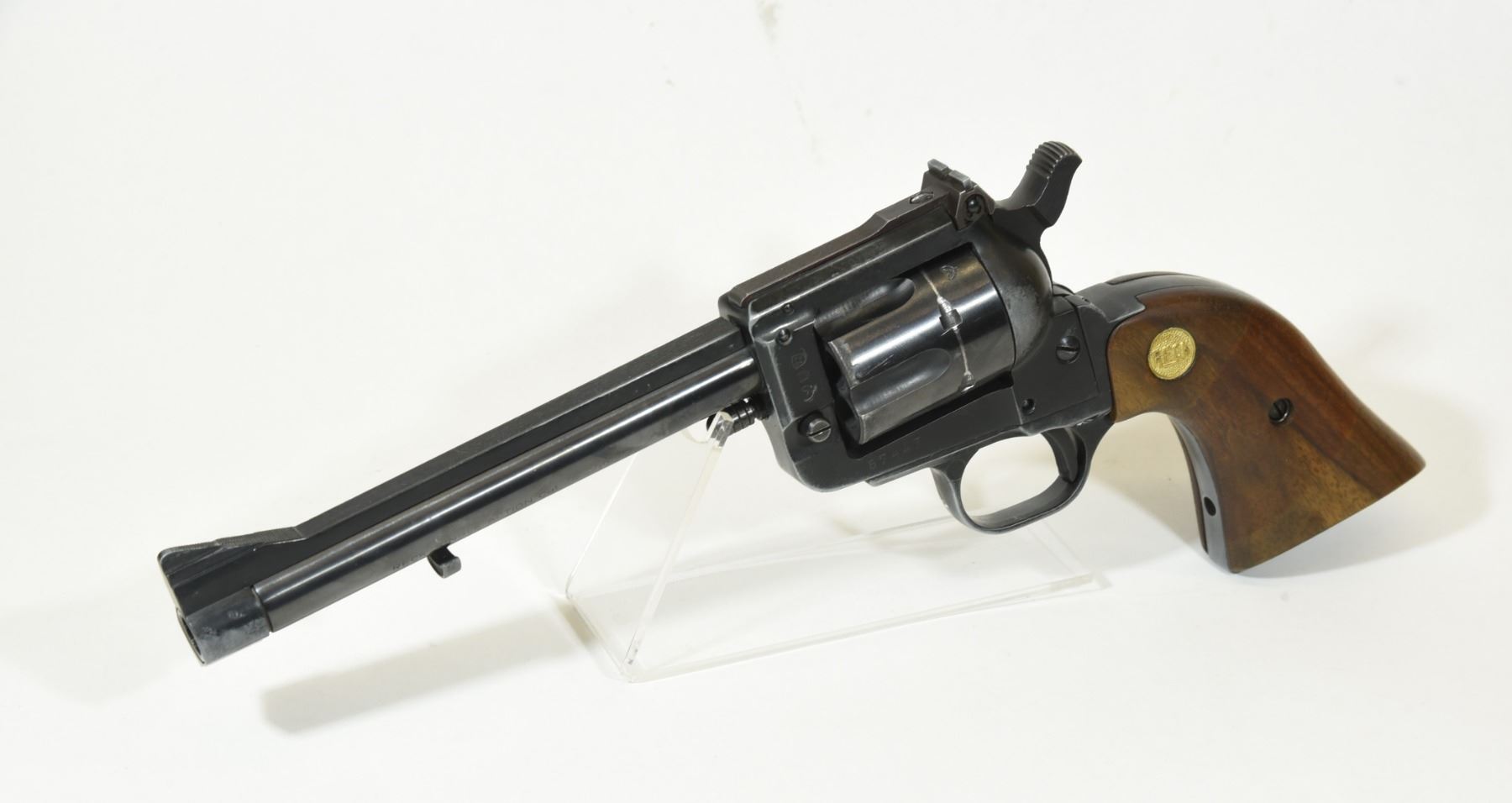 Restricted, single action, 38 special, 152mm barrel, SN 57447. Wooden grips are good. Bluing has some grey spots. Bore is very good.