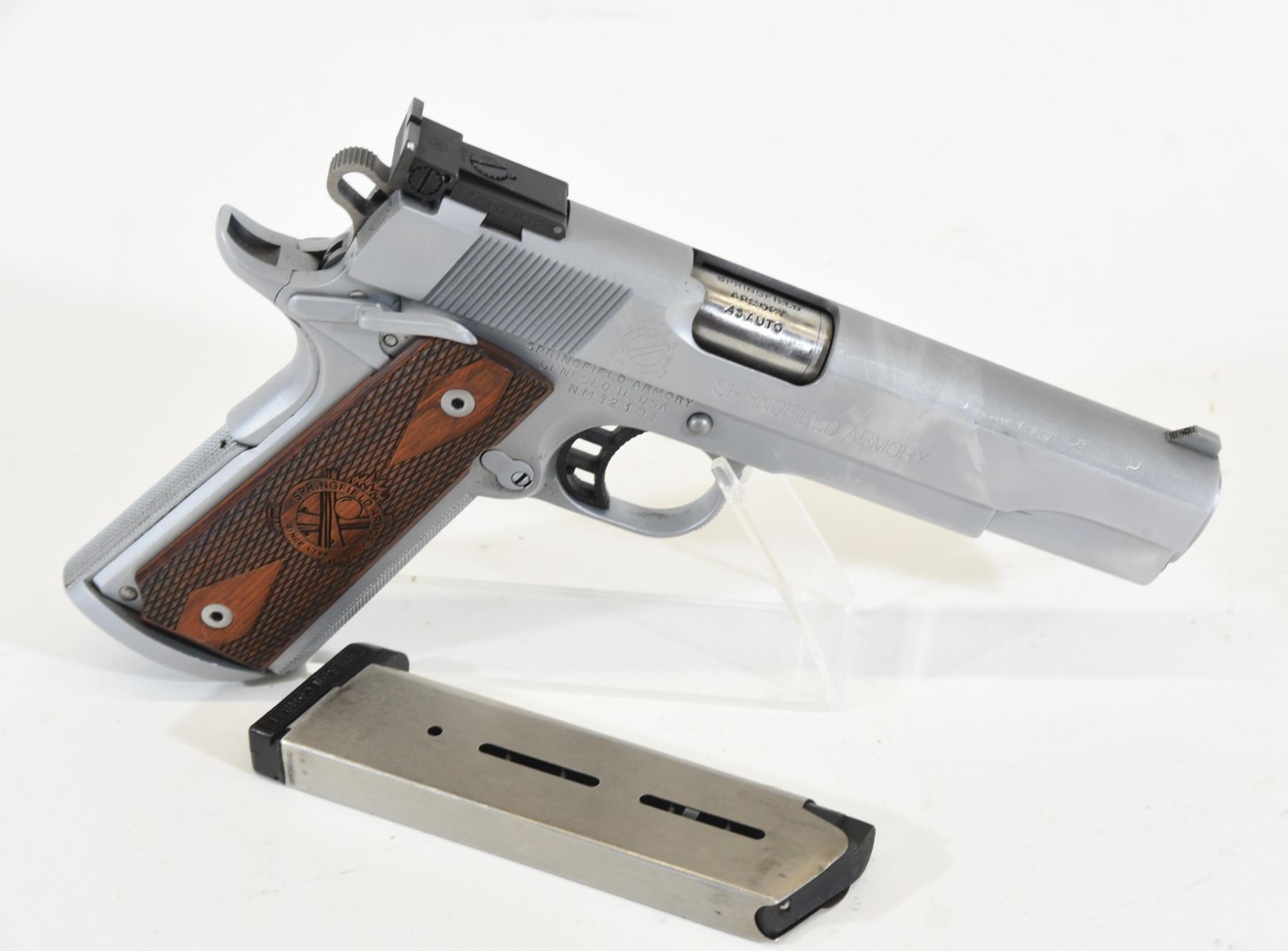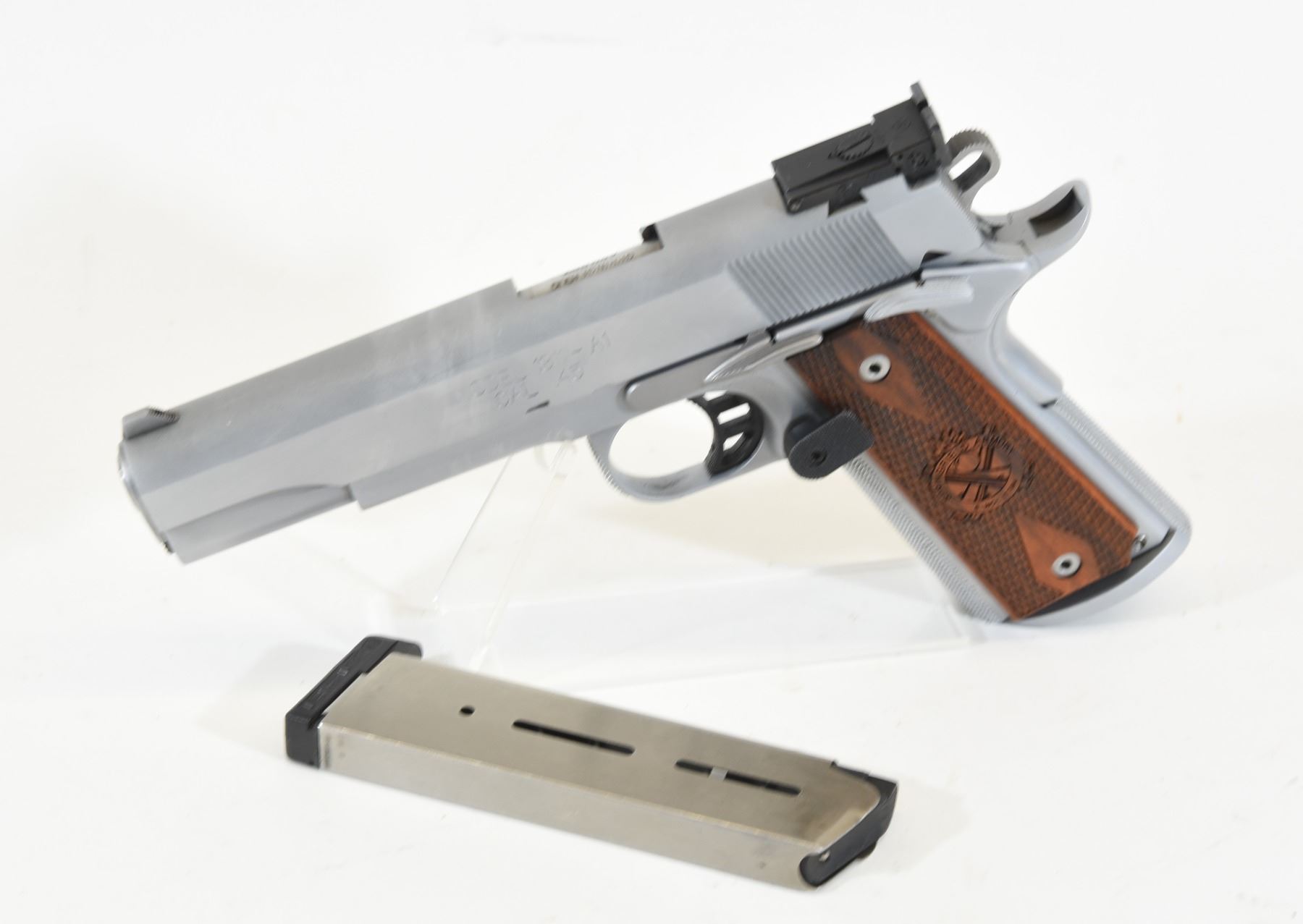 Restricted, semi-auto, 45 caliber, 127mm barrel, SN NM92109. Stainless matte finish is good. Bore is excellent.