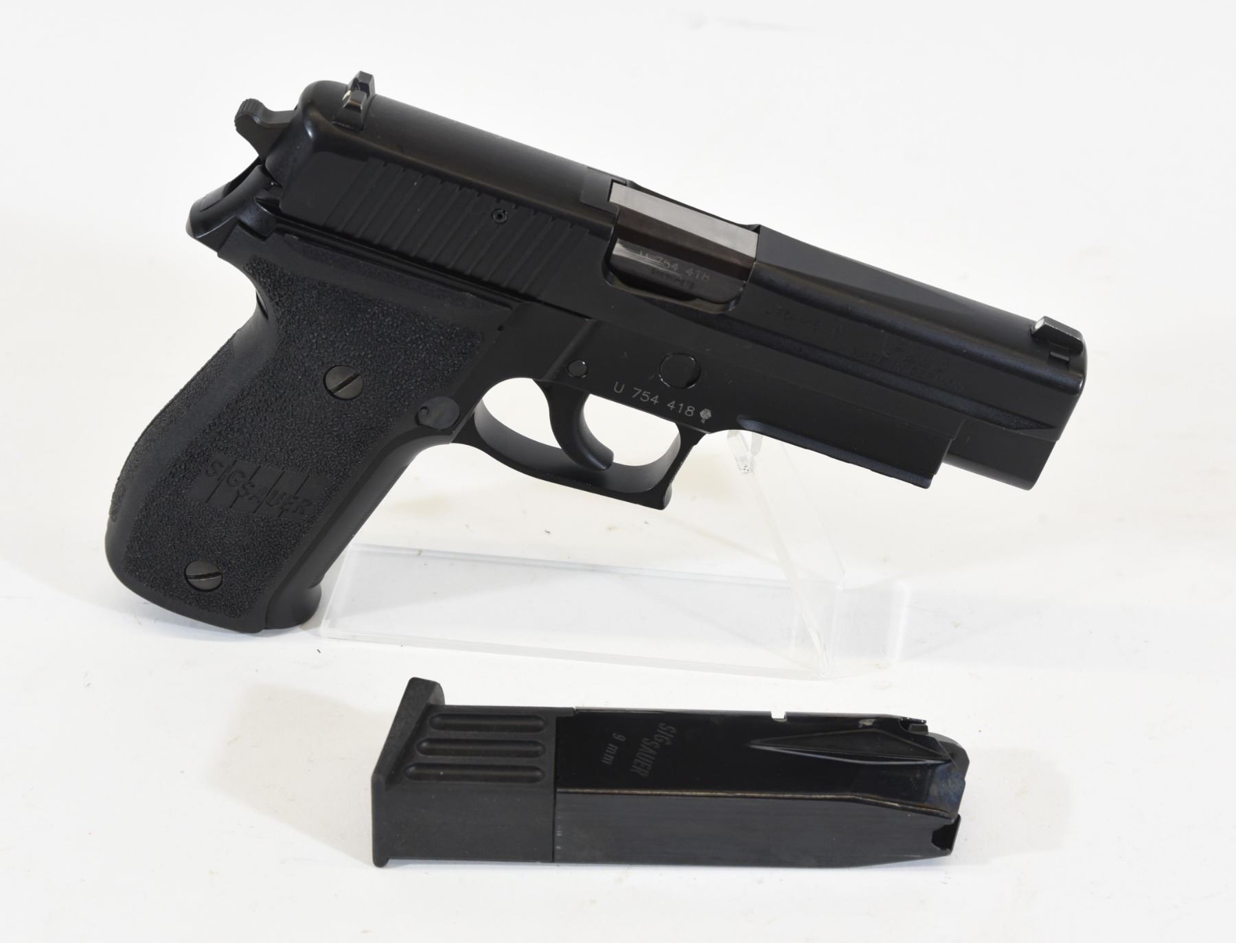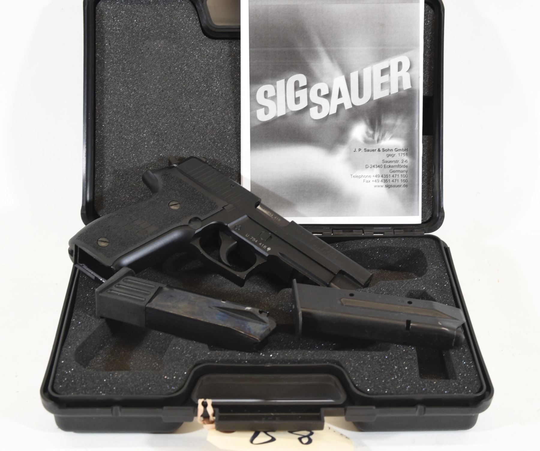 Restricted, semi-auto, 9mm German, 112mm barrel, SN U754418. Bluing is very good. Bore is very good. Comes with extra magazine, instruction book and Sig Sauer hard case.