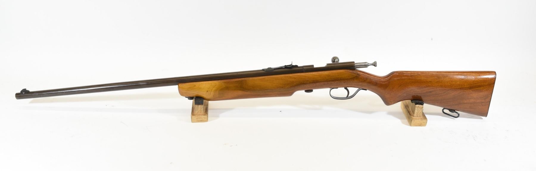 Non-restricted, bolt action, 22LR, 27" barrel, SN N/A. Wood stock has some small dents and scratches, bluing has turned brown. Rifling is good.