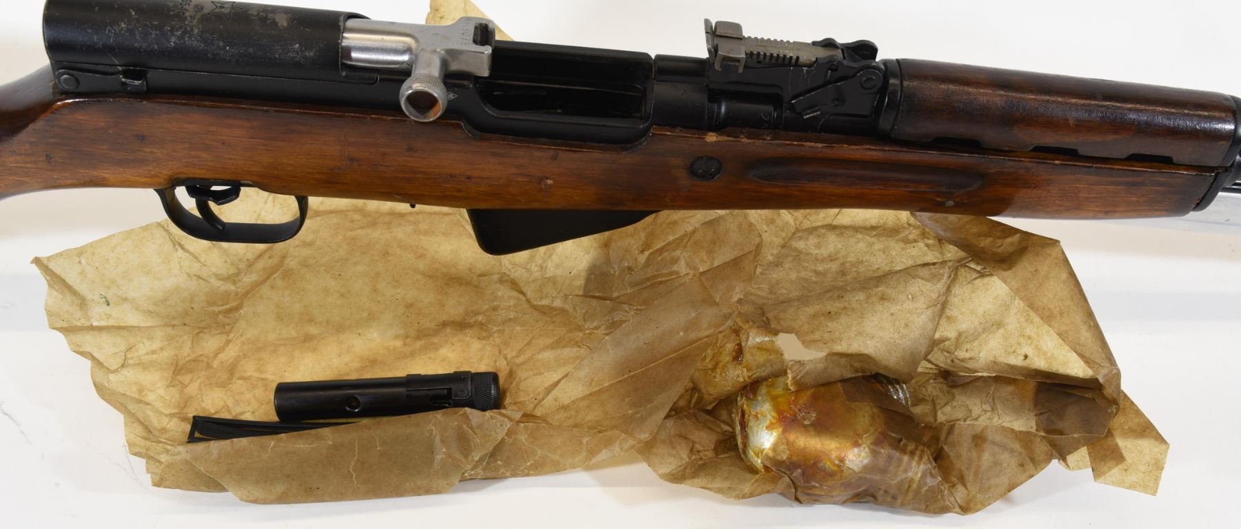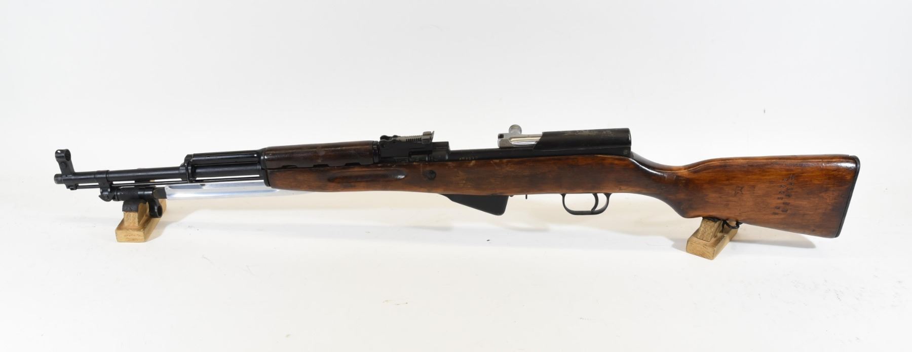 Non-restricted, semi-auto, 7.62 x 39, 20 " barrel, SN M3078. Wood has some dents and scratches, bluing is good with some grey on the bolt cover, bore is very good, comes with bayonet, oil can, cleaning kit and 3 stripper clips. Has some rust on inside of bolt handle.