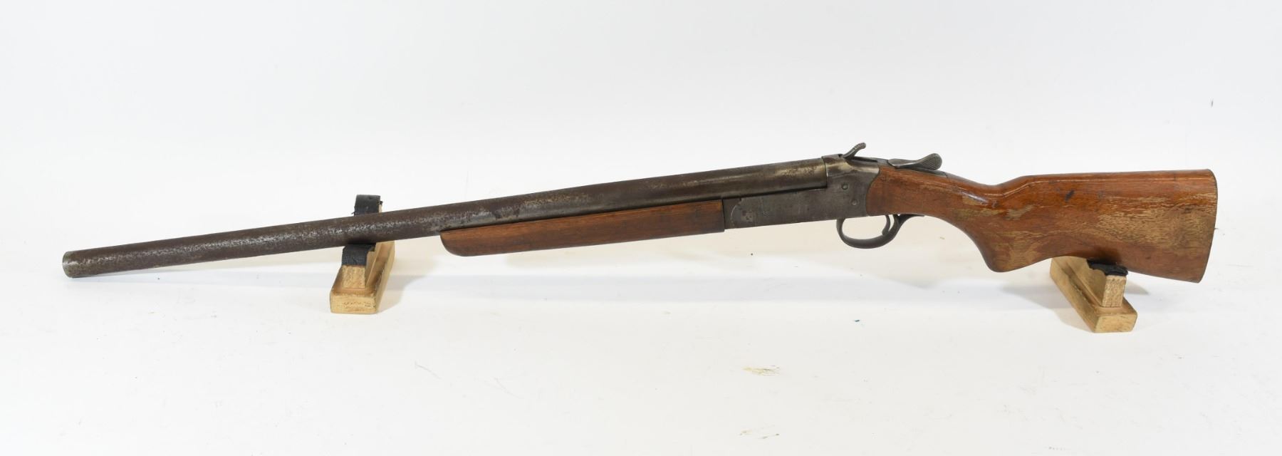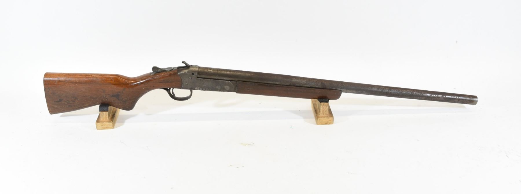 Non-restricted, 12ga, single shot, 25" fixed full choke barrel, SN 66750 Wood stock has many dents and scratches with cracks on the upper and lower tangs as well as chipped and faded finish, bluing has gone grey and rusting throughout. Bore is scratched and lightly pitted in sections, but shiny otherwise.