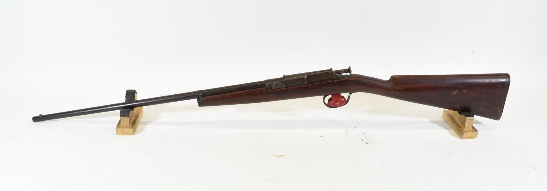 Non-restricted, 22LR, semi-auto, SN N/A. Wood stock has many dents and scratches with chips in the finish and cracks on the butt and upper tang as well as one large chip in the upper tang. Bluing going brown and has a few scratches. Bore is lightly pitted throughout, but has prominent rifling and is shiny.