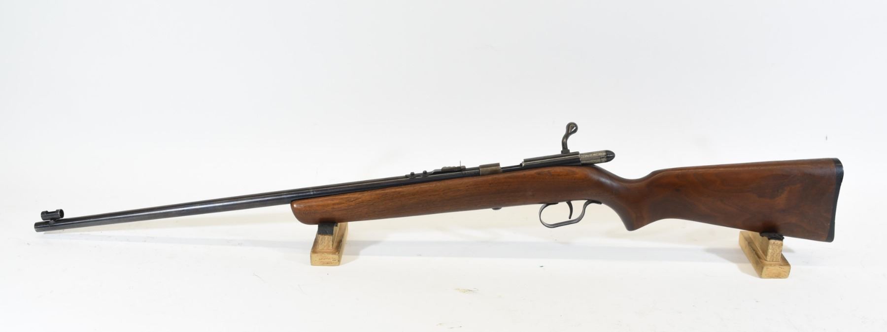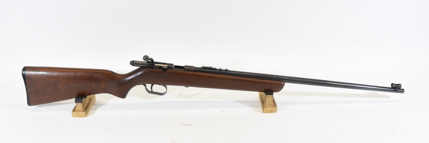 Non-restricted, 22S,L,LR, single shot, SN CA1078/ Wood stock has many small scratches and dents with a large crack on the right side of the action. Bluing is going brown with a few minor scratches. Bore is good.