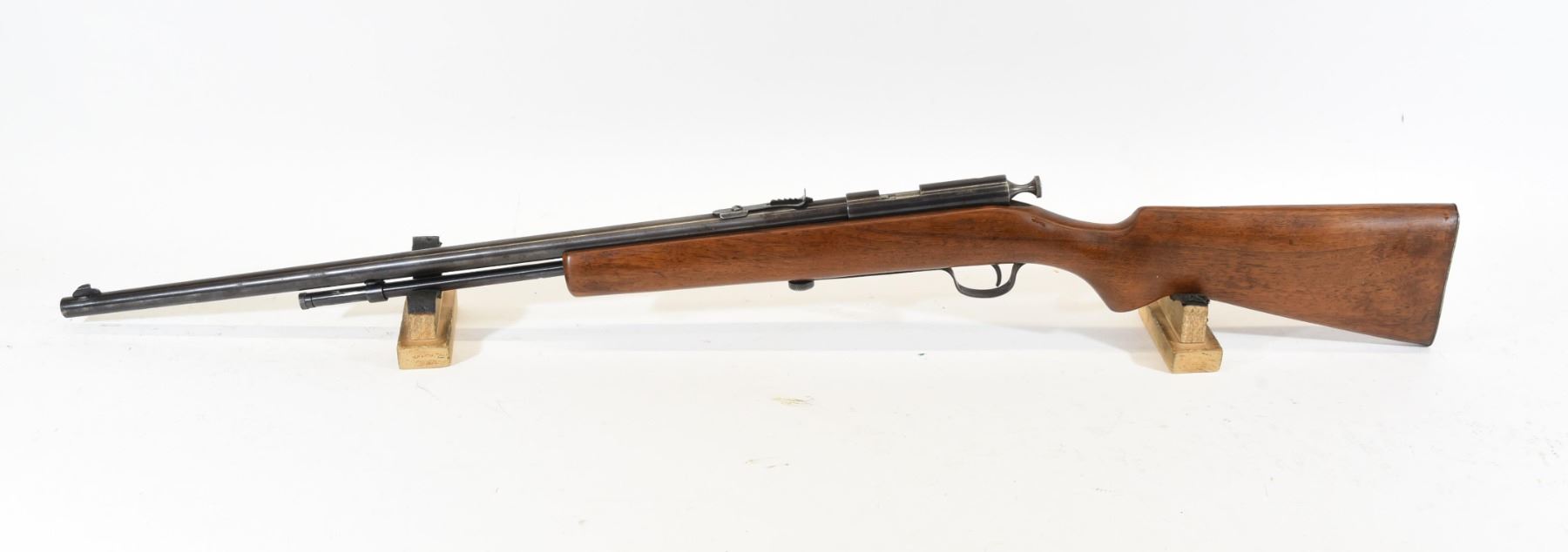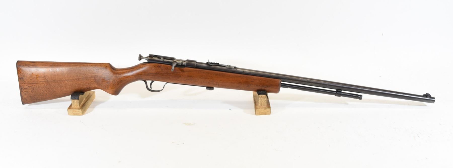 Non-restricted, 22cal, bolt action, SN N/A. Wood stock has many small scratches but is in good condition overall. Bluing is going grey and has several small scratches with some small speckling of rust. Bore is good. Bolt handle is missing the ball.