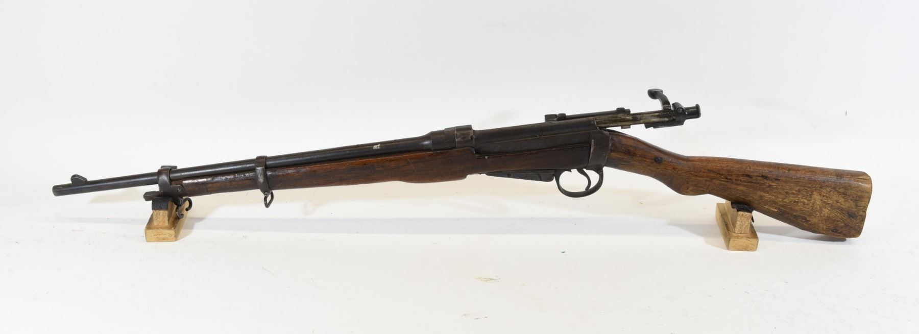 Non-restricted, 303Brit, bolt action, SN N/A. Wood stock has many scratches and dents and is missing the toe of the butt. Bluing has gone brown and is scratched and pitted in places. Bore has been welded roughly 3/4 of the way down the barrel. Mag has no spring or plate.
