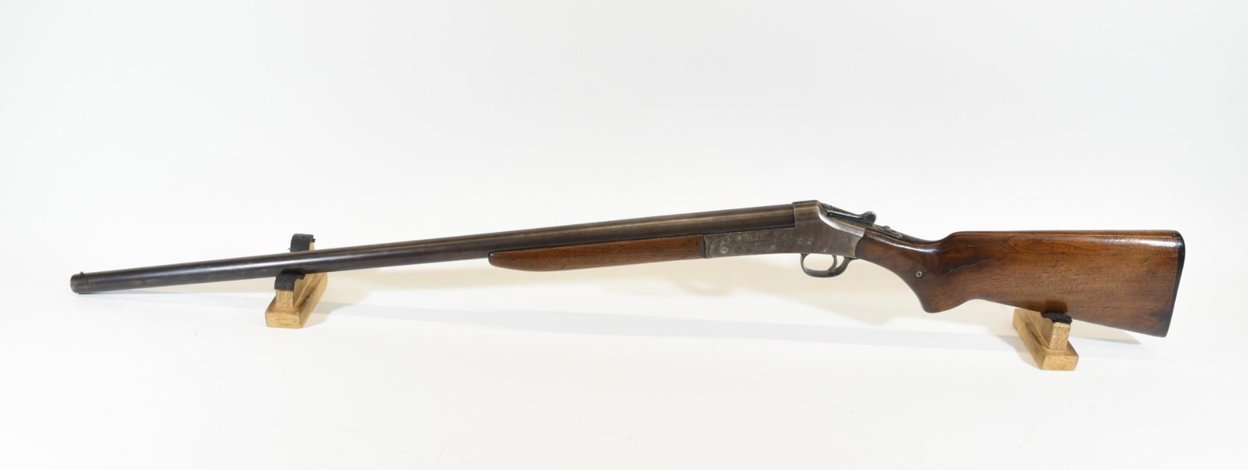 Non-restricted, single shot, 12 gauge 2 3/4, 30" full choke barrel, SN A5857. Wood has a large crack at the wrist repaired with a screw, glue and a nail. Bluing is brown. Bore has some pitting.