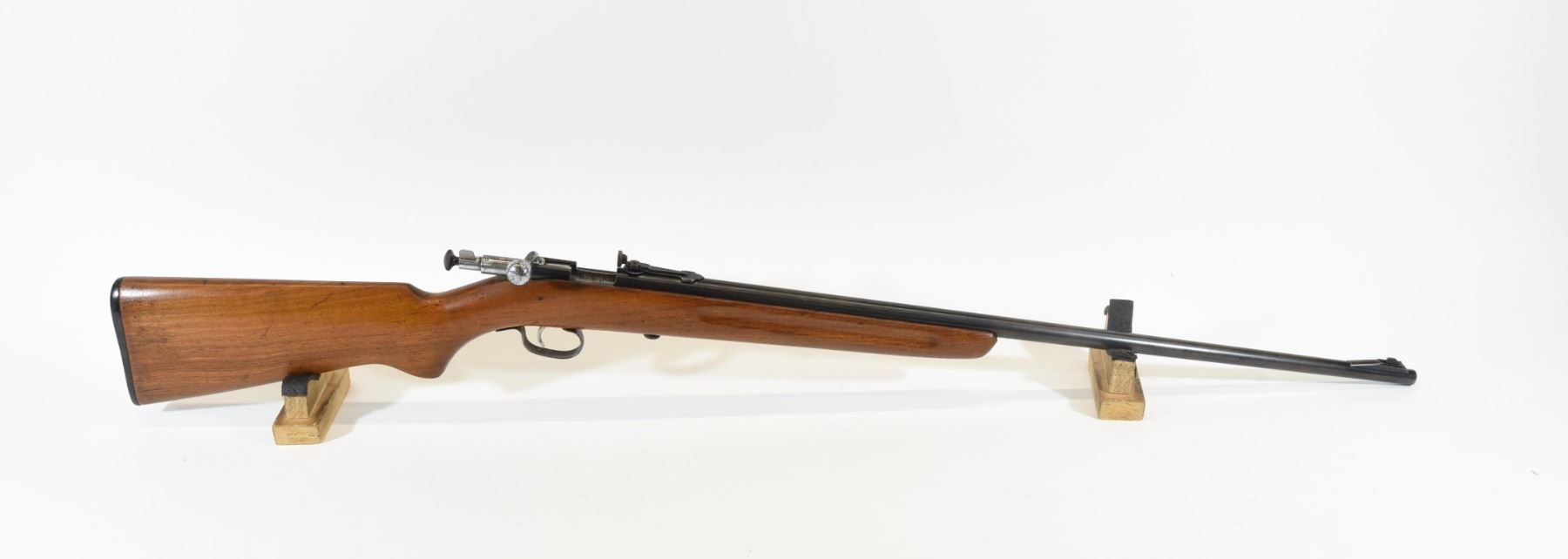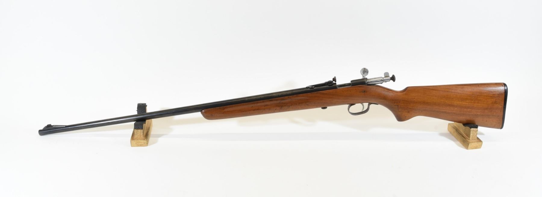 Non-restricted, bolt action single shot, 22 s-l-lr, 27" barrel, SN none. Wood has light handling marks, bluing is starting to turn brown. Bore is very good.