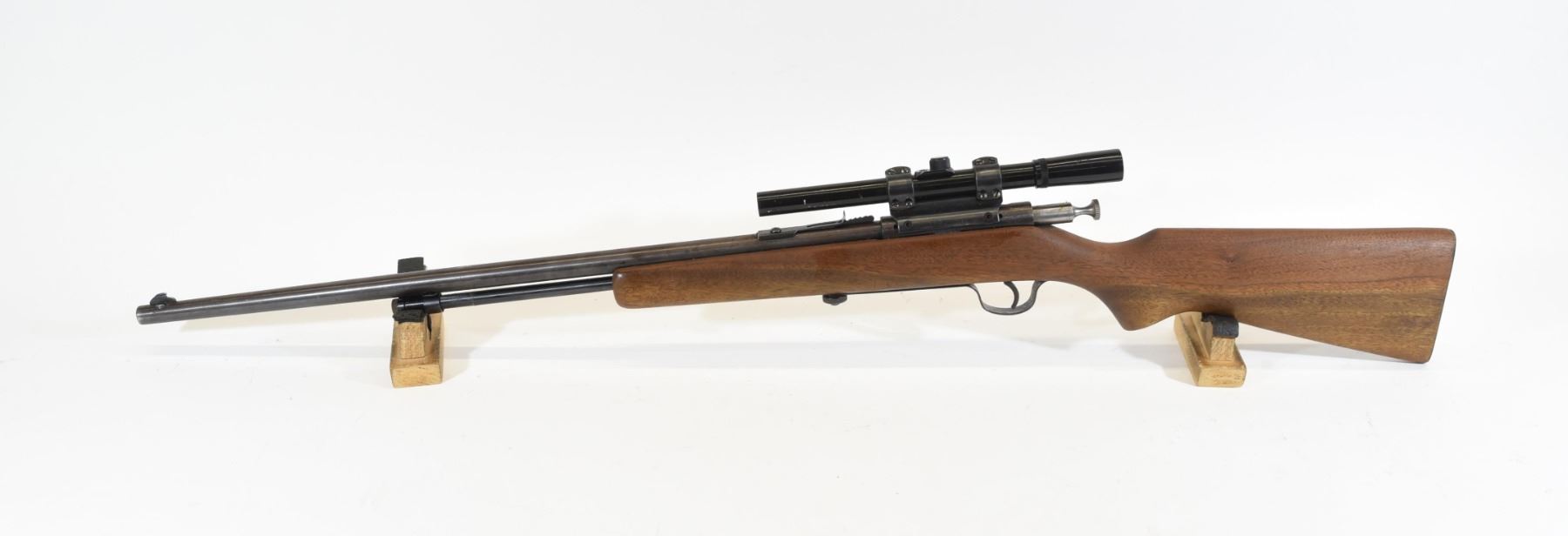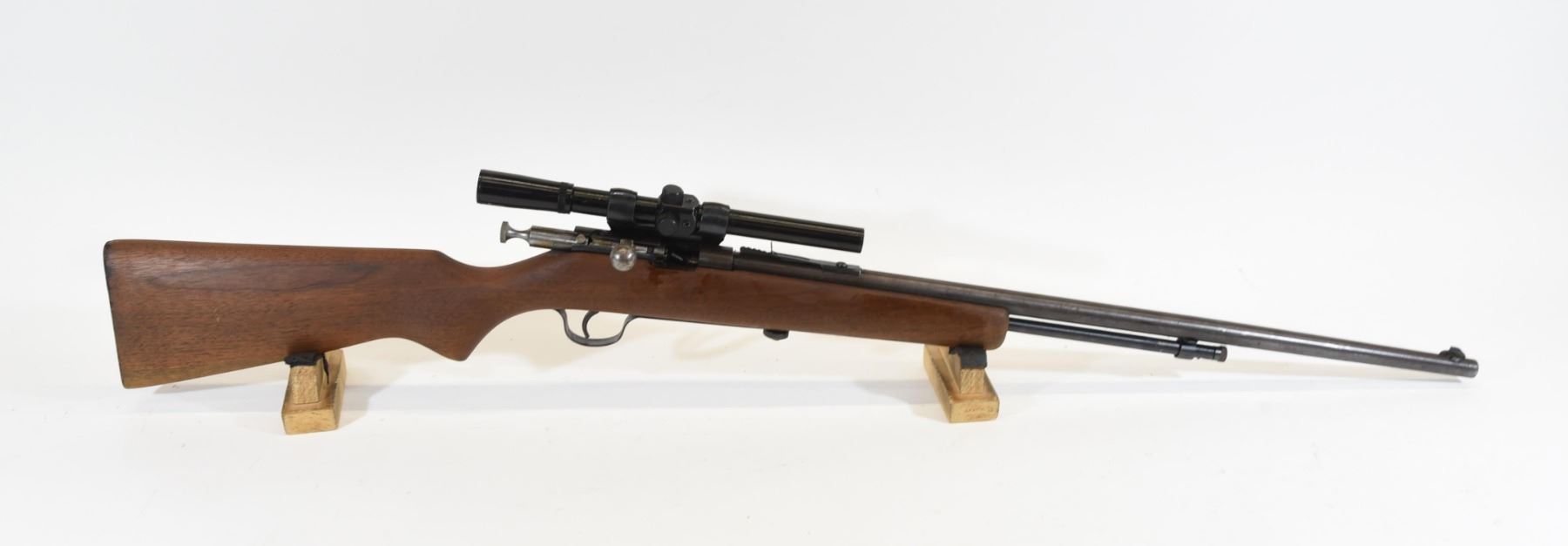 Non-restricted, 22S,L,LR, bolt action, SN N/A. Wood stock has several scratches and a few dents, but no cracks or chips and is good overall. Bluing is going grey with many scratches and is speckled with rust throughout. Bore is good. Rifle has a Bushnell Sportview 4x15mm scope mounted.