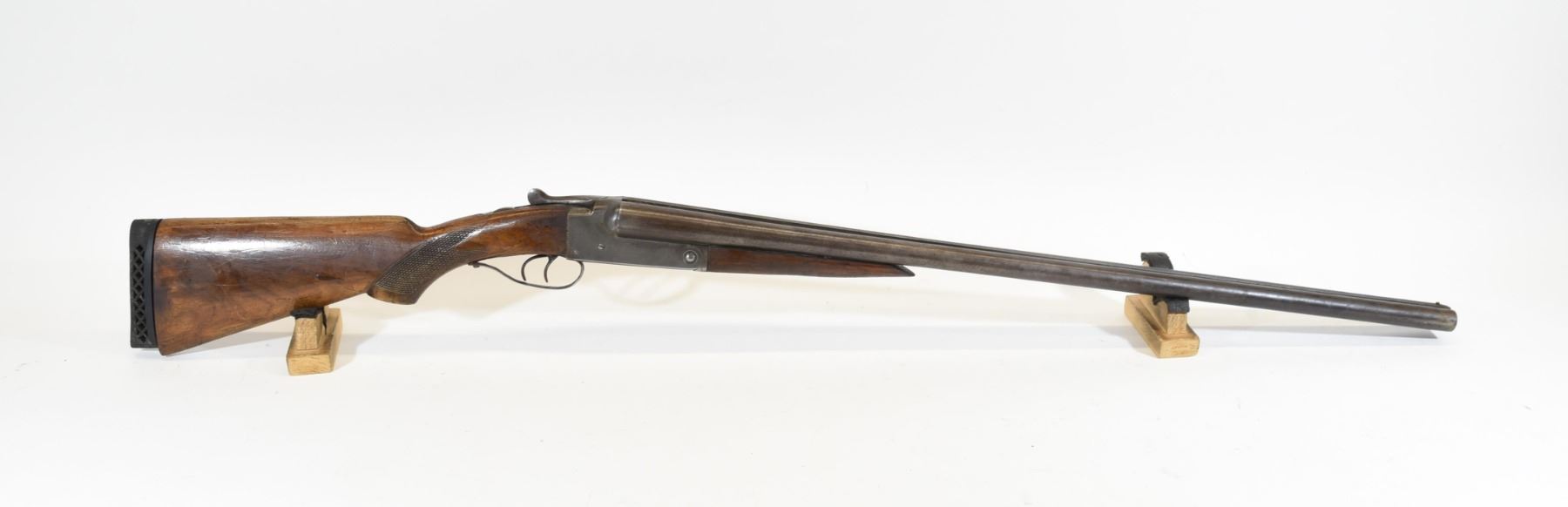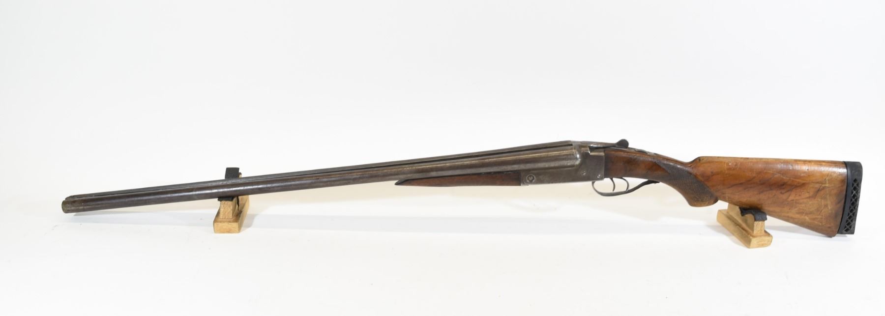 Non-restricted, 12ga, side x side, 30" barrels, SN N/A. Wood stock has many dents and scratches as well as a crack on both the upper and lower tangs. Bluing has gone brown and is going grey with several scratches. Bores both have small bulges, but are good otherwise.