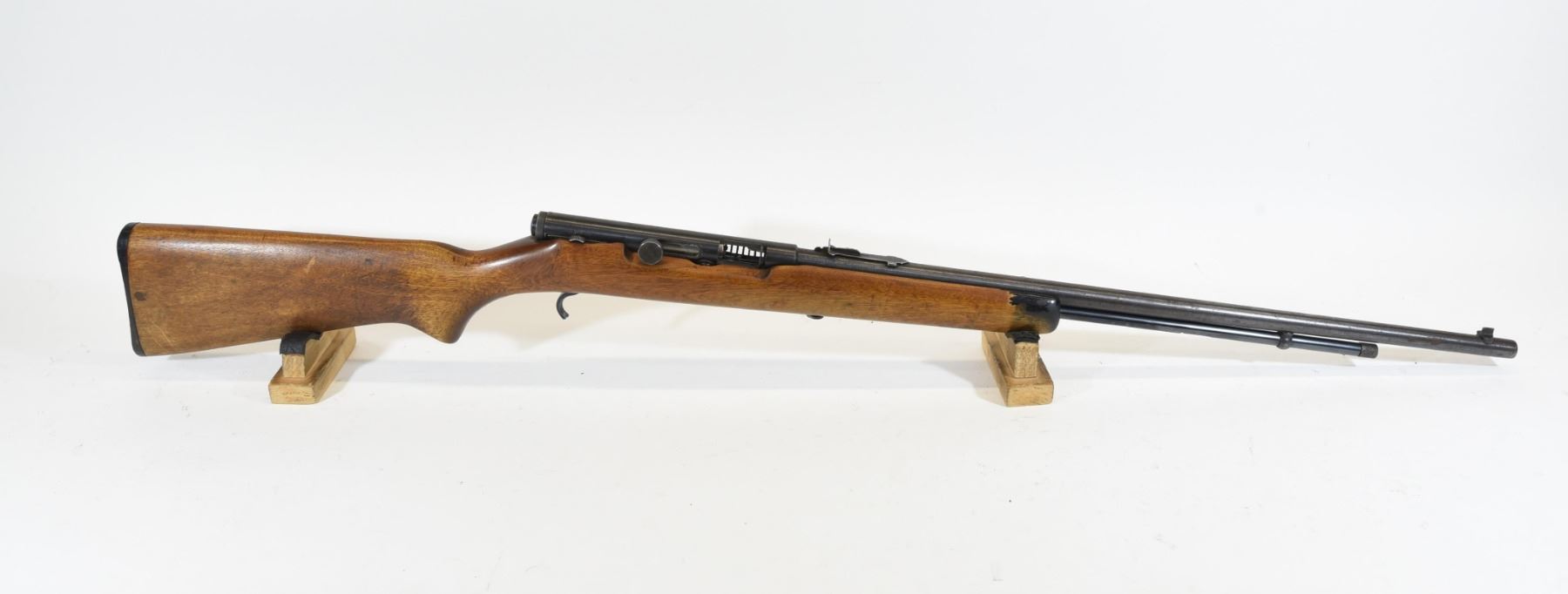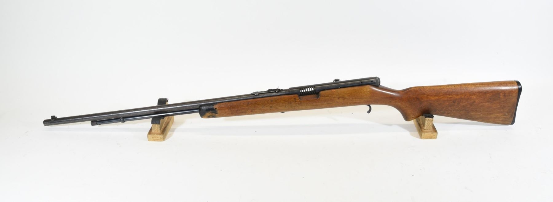 Non-restricted, 22S,L,LR, SN N/A. Wood stock has many dents and scratches as well as three large cracks. Bluing is going grey and has several scratches as well as being speckled with light surface rust throughout. Bore is excellent. Rifle is missing the trigger guard.