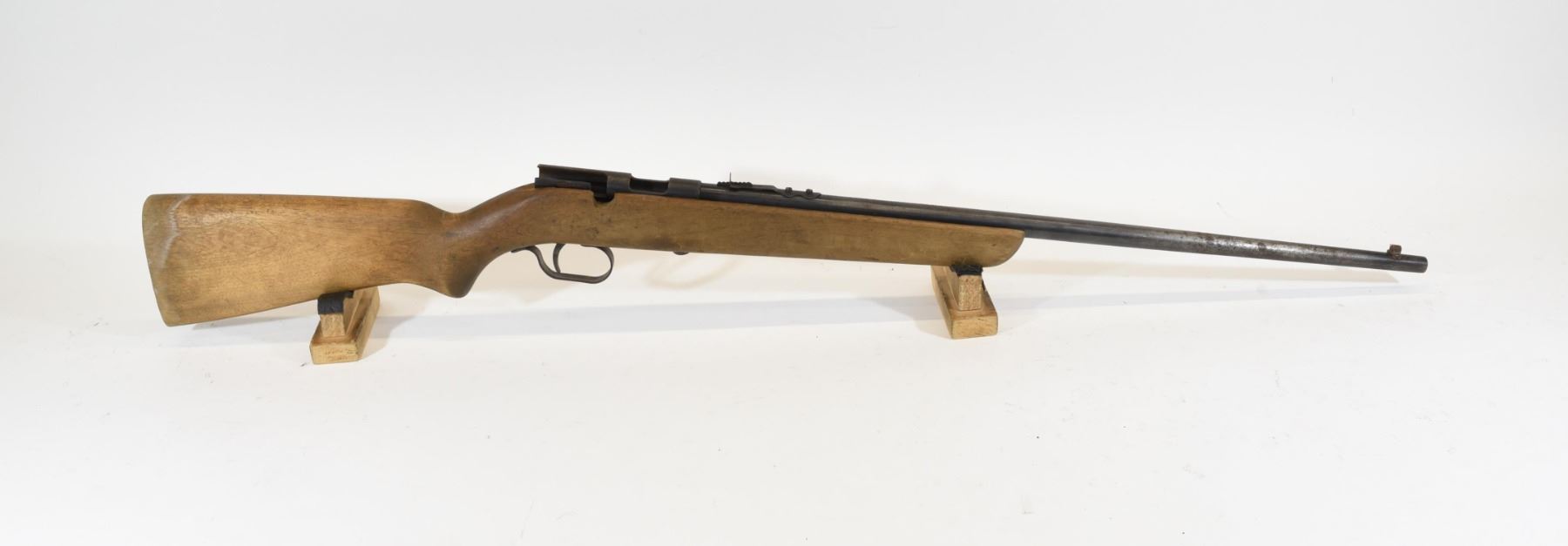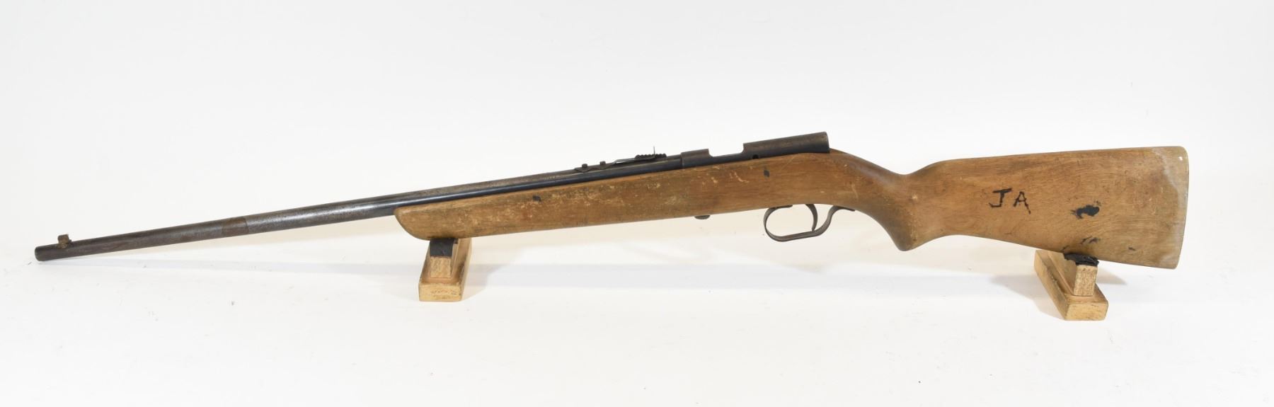 Non-restricted, 22S,L,LR, bolt action, SN 45173. Wood stock has many dents and scratches, but no cracks or chips and has a previous owner's initials engraved in the butt stock. Bluing is going grey and is speckled throughout with surface rust. Bore is good. Rifle is missing the bolt.