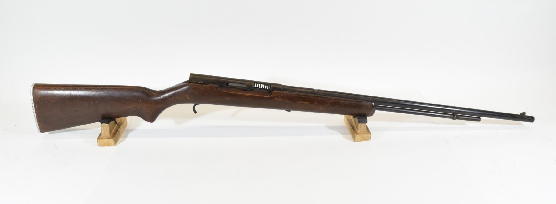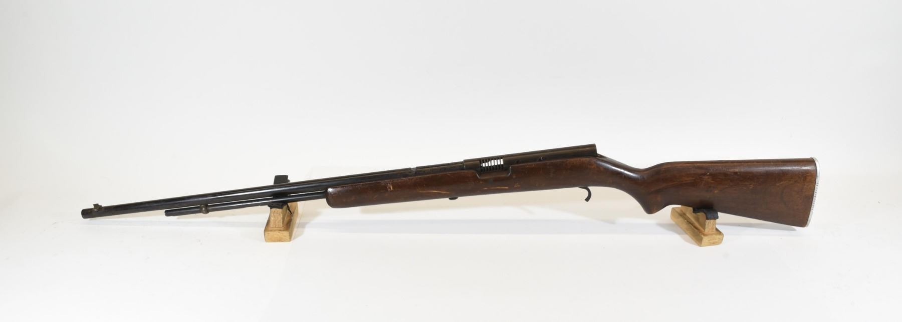 Non-restricted, 22S,L,LR, semi-auto, SN N/A. Wood stock has many dents and scratches with two cracks near the trigger guard and two near the back of the action. Bluing is going brown with many scratches and some patches of light pitting. Bore is good.