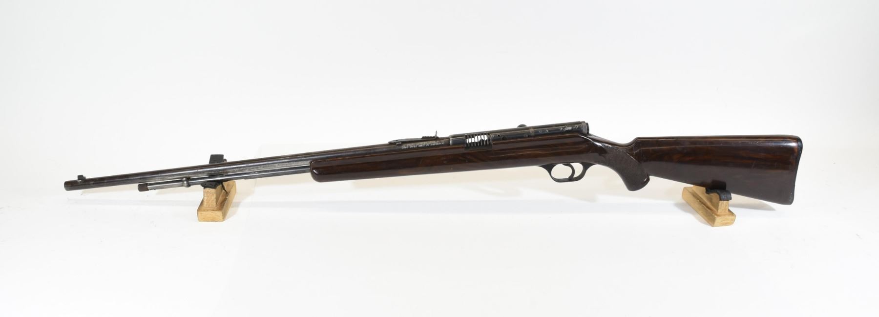 Non-restricted, 22S,L,LR, semi-auto, SN 4967862. Plastic stock has many dents and scratches with one crack on the left side of the action and one repaired crack on the right side of the trigger guard. Bluing is going brown in places and grey in other places with many scratches and some patches of pitting. Bore is good.