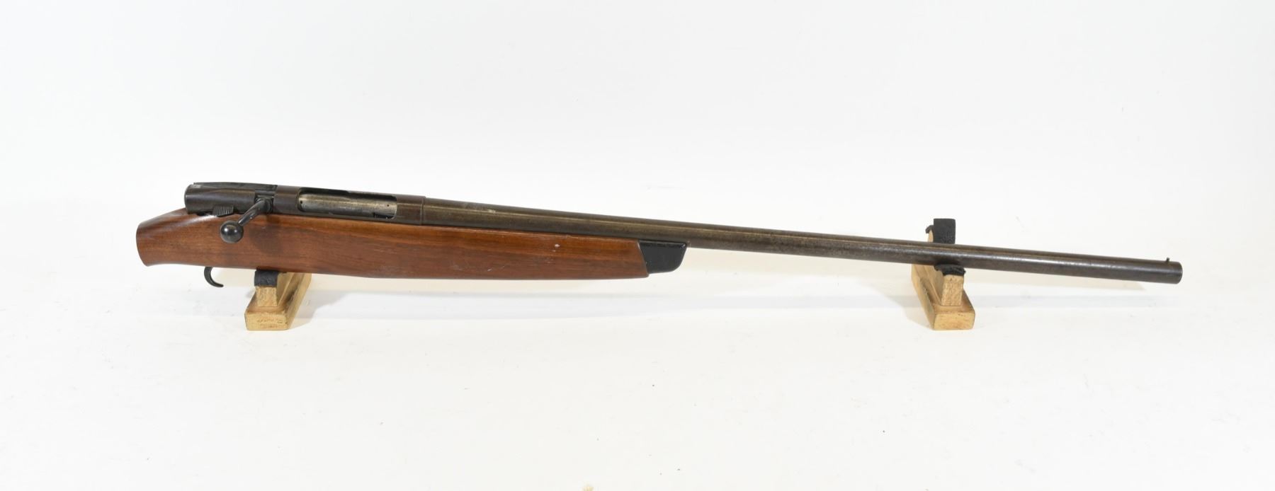 Non-restricted, 12ga, bolt action, SN N/A. Wood stock has many dents and scratches with cracks through the underside and the butt stock has been sawed off. Bluing is going brown and grey with several scratches and some patches of rust. Bore is good.